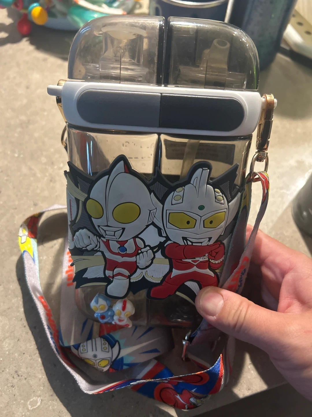 This sippy cup features Ultraman characters on the outside. It's made of durable plastic and comes with a strap for easy carrying. Perfect for little ones learning to drink independently! Ultraman's cup needs to be used with care.