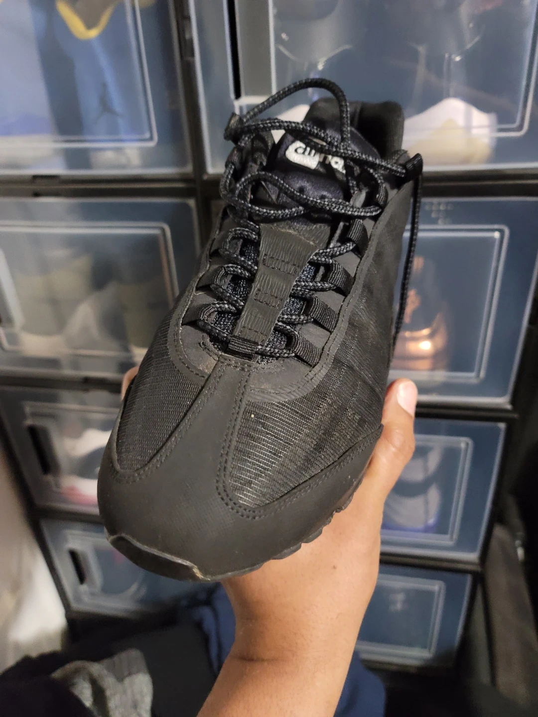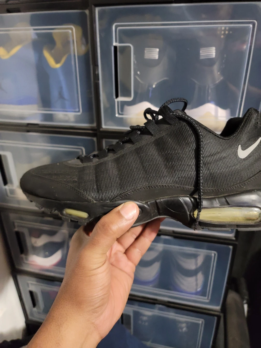 Black Nike Air Max 95 running shoes. These shoes are black with a visible air unit in the sole. Includes original laces.