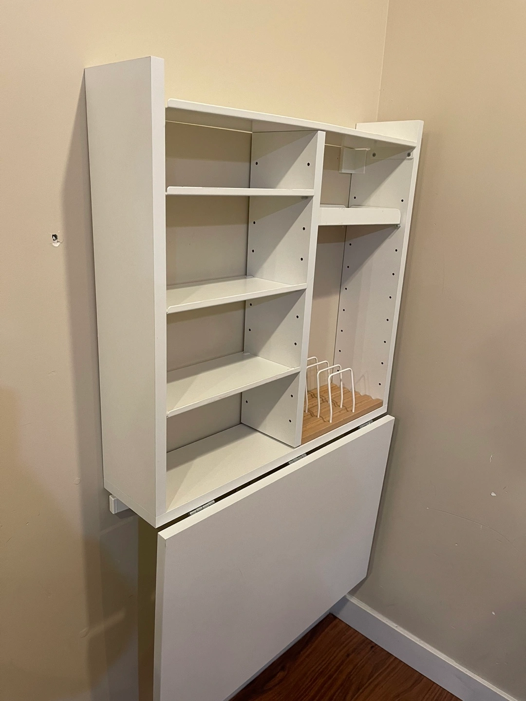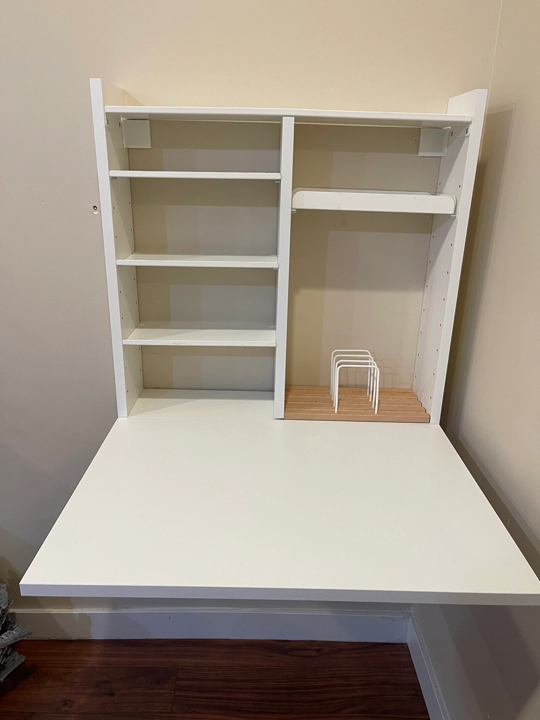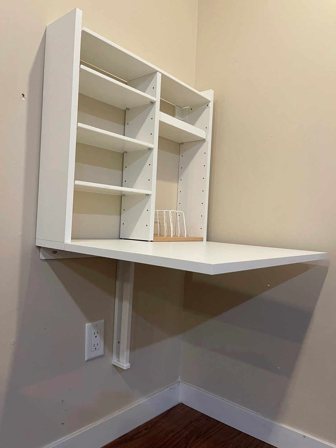 Wall-mounted desk with shelf space. Perfect for small spaces. Includes a pull-out desk and multiple shelves. Hardware is not included.