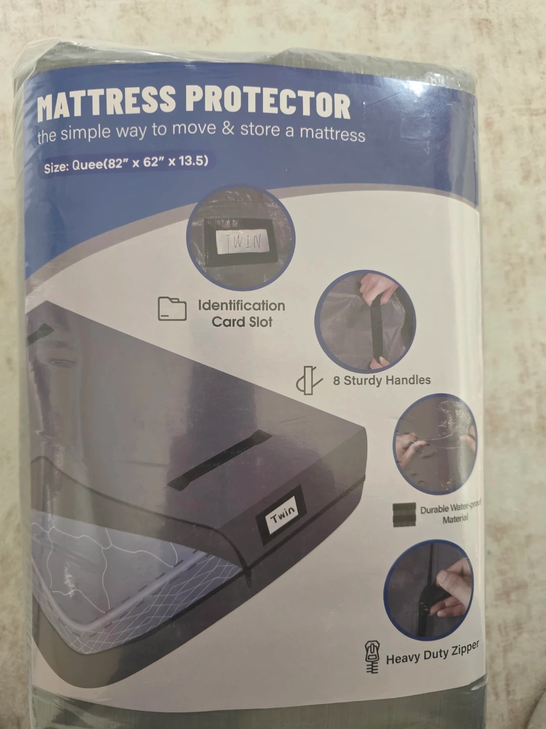 This mattress protector bag makes moving and storing mattresses simple. It's designed with durable, water-proof material and features 8 sturdy handles for easy carrying. Includes a heavy-duty zipper and an identification card slot for convenience.