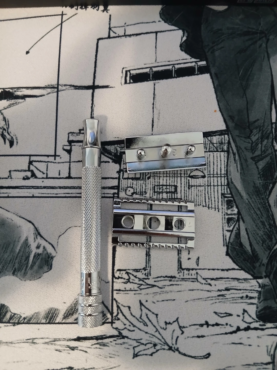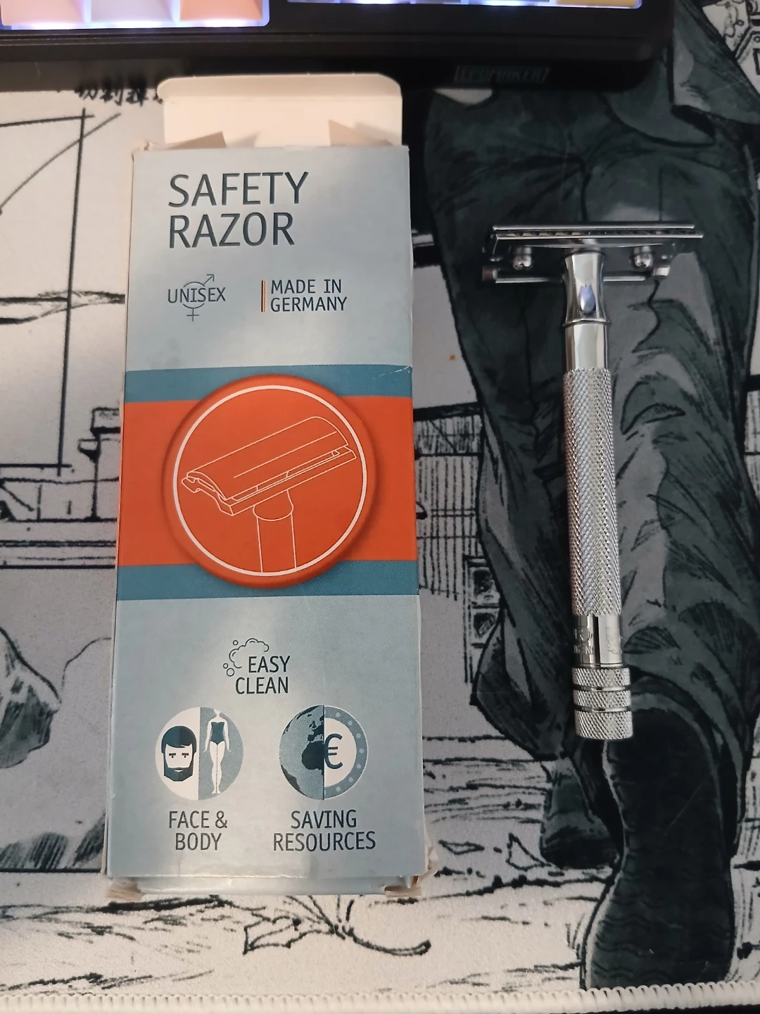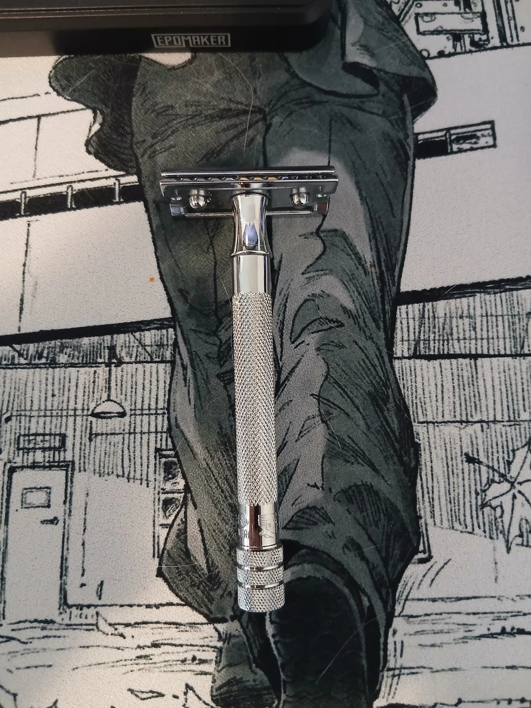 Merkur Stahlwaren safety razor from Solingen, Germany. Features a textured handle for grip. Made with traditional craftsmanship and design.