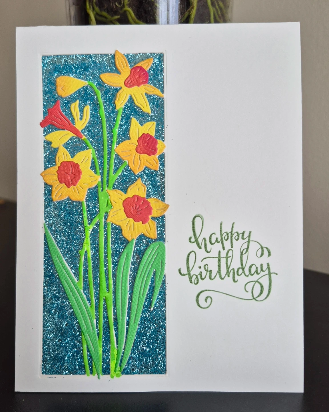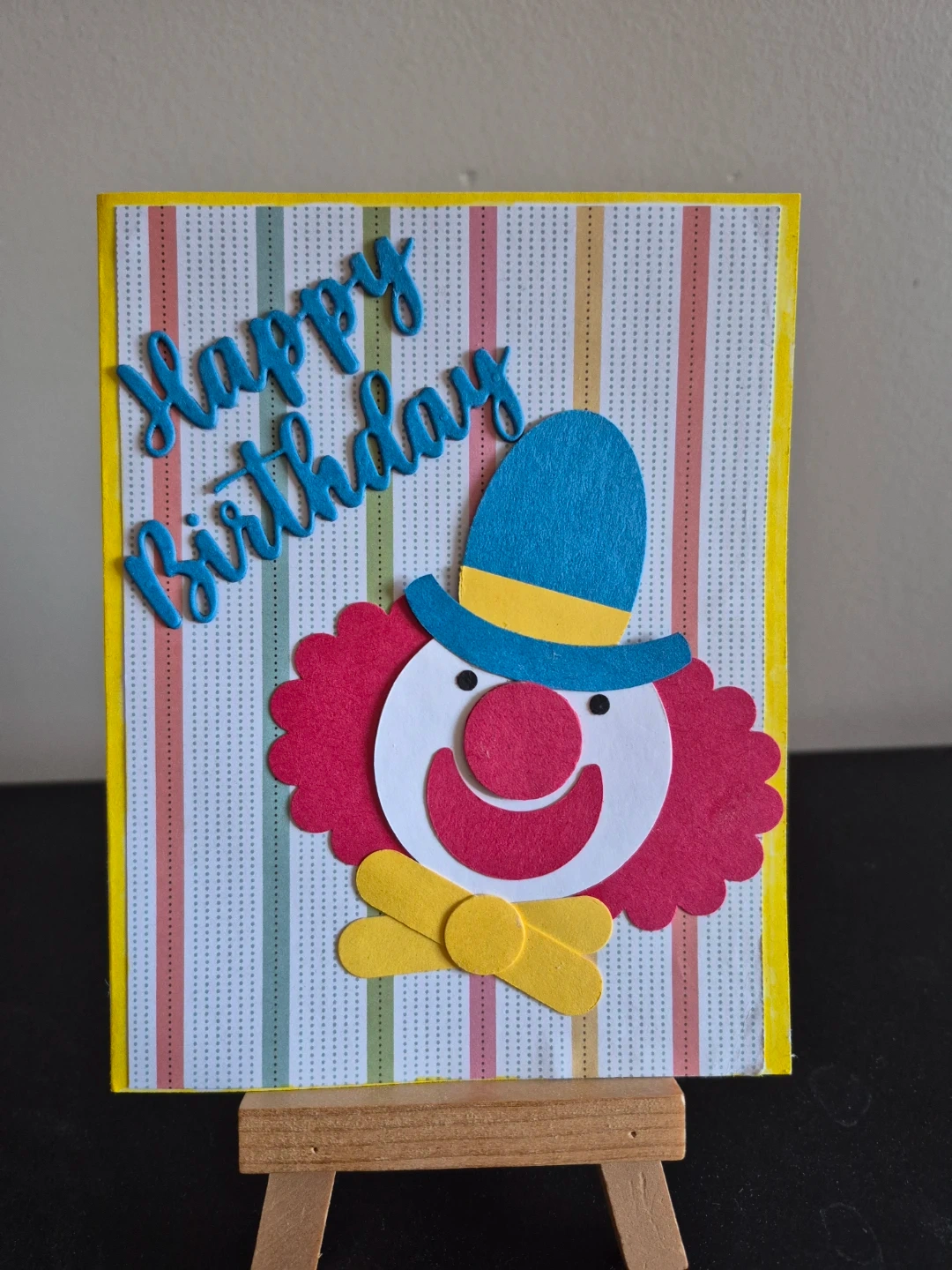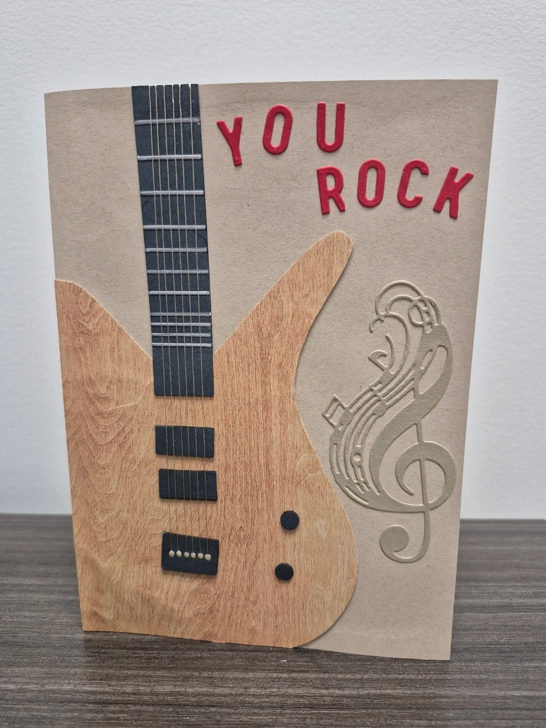 Handmade cards for all occasions. Prices vary by design complexity. $5 and up per card. Features a guitar 'You Rock' card, a knitting-themed card, a floral card, a clown card, and a daffodil card. Great for any occasion! Contact more more designs.