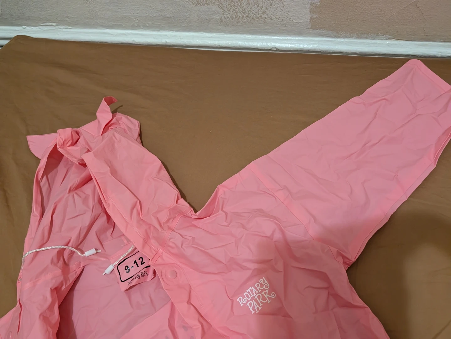 This pink Rotary Park raincoat features a fun Yoyo Cat design on the back. It's sized for 9-12 months. Made from waterproof material to keep little ones dry!