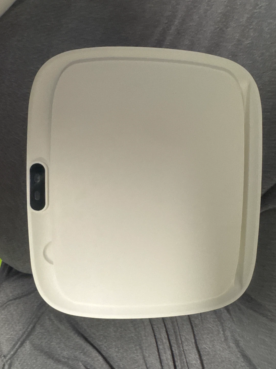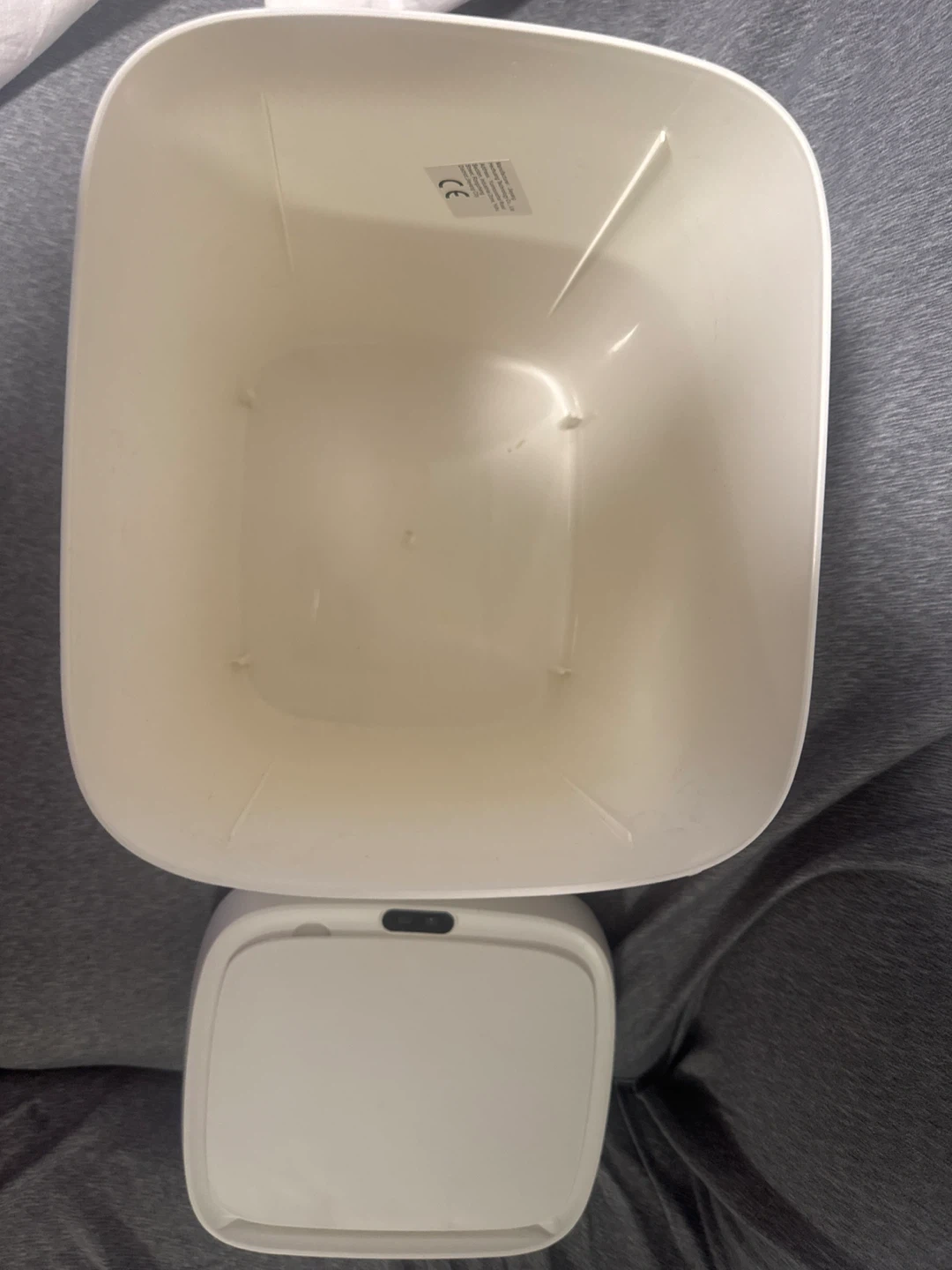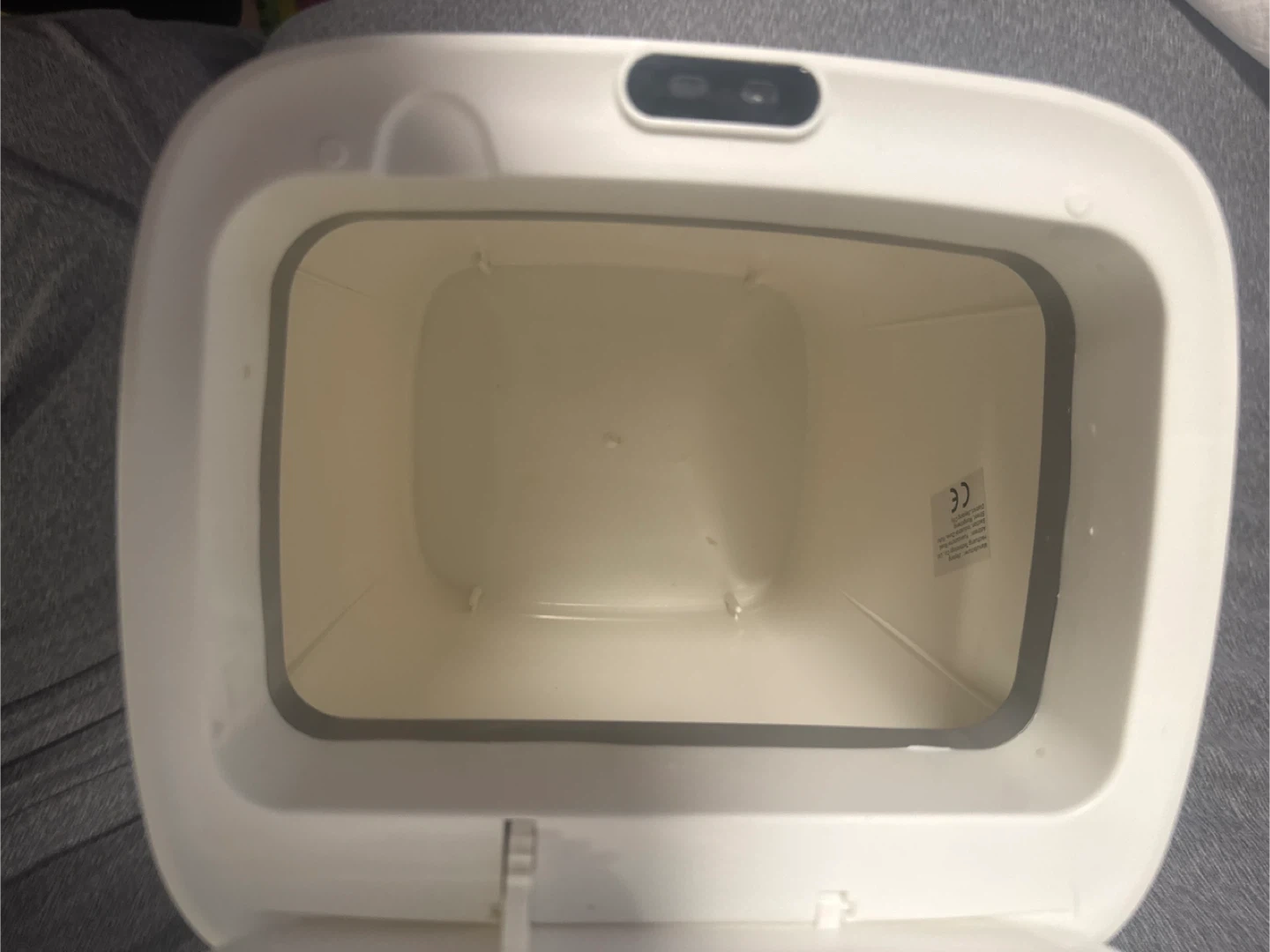 This is a white automatic motion sensor trash can. It's made of plastic and has a lid that opens when it detects motion. It's great for keeping kitchens or bathrooms tidy! It is almost brand new. Used it only once put rice bag . Never used for garbage.