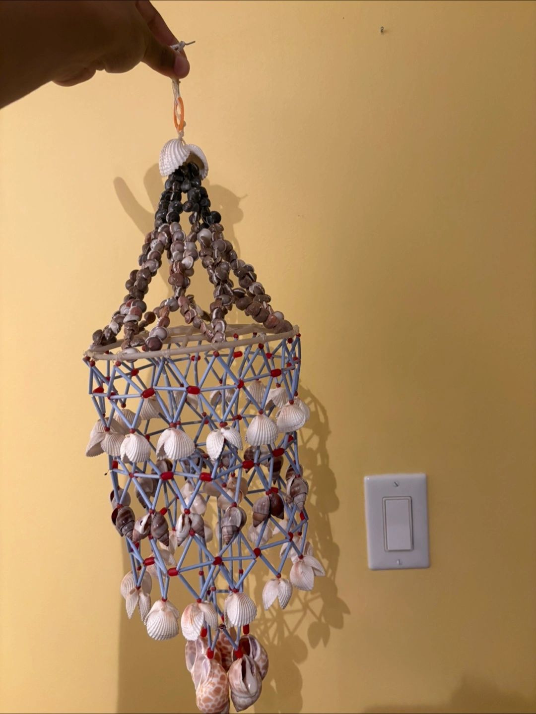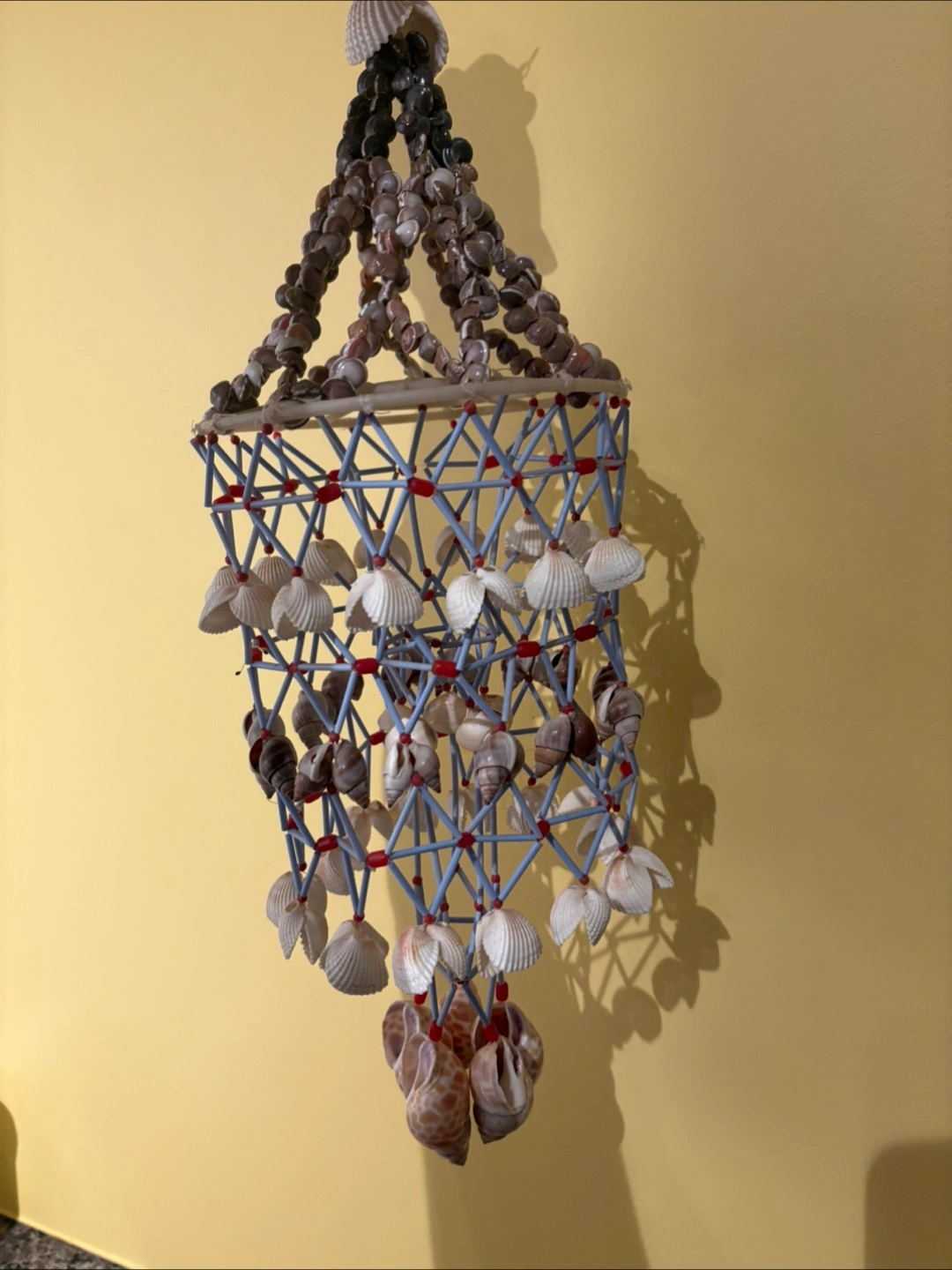 A unique seashell mobile, I bought it in Mahabalipuram, Tamil Nadu, South India, made by a very talented young woman in 2016. All the sells are real!