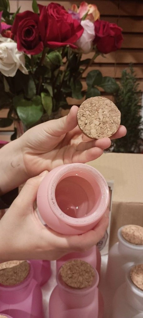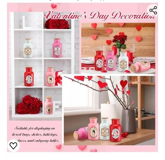 Set of 12 glass potion bottles in red, pink, white, and rose red. Each bottle is about 5 inches tall with a 2.5-inch diameter and holds approximately 250ml. Includes 12 cork stoppers and 24 Valentine's Day stickers (6 styles, 4 of each).