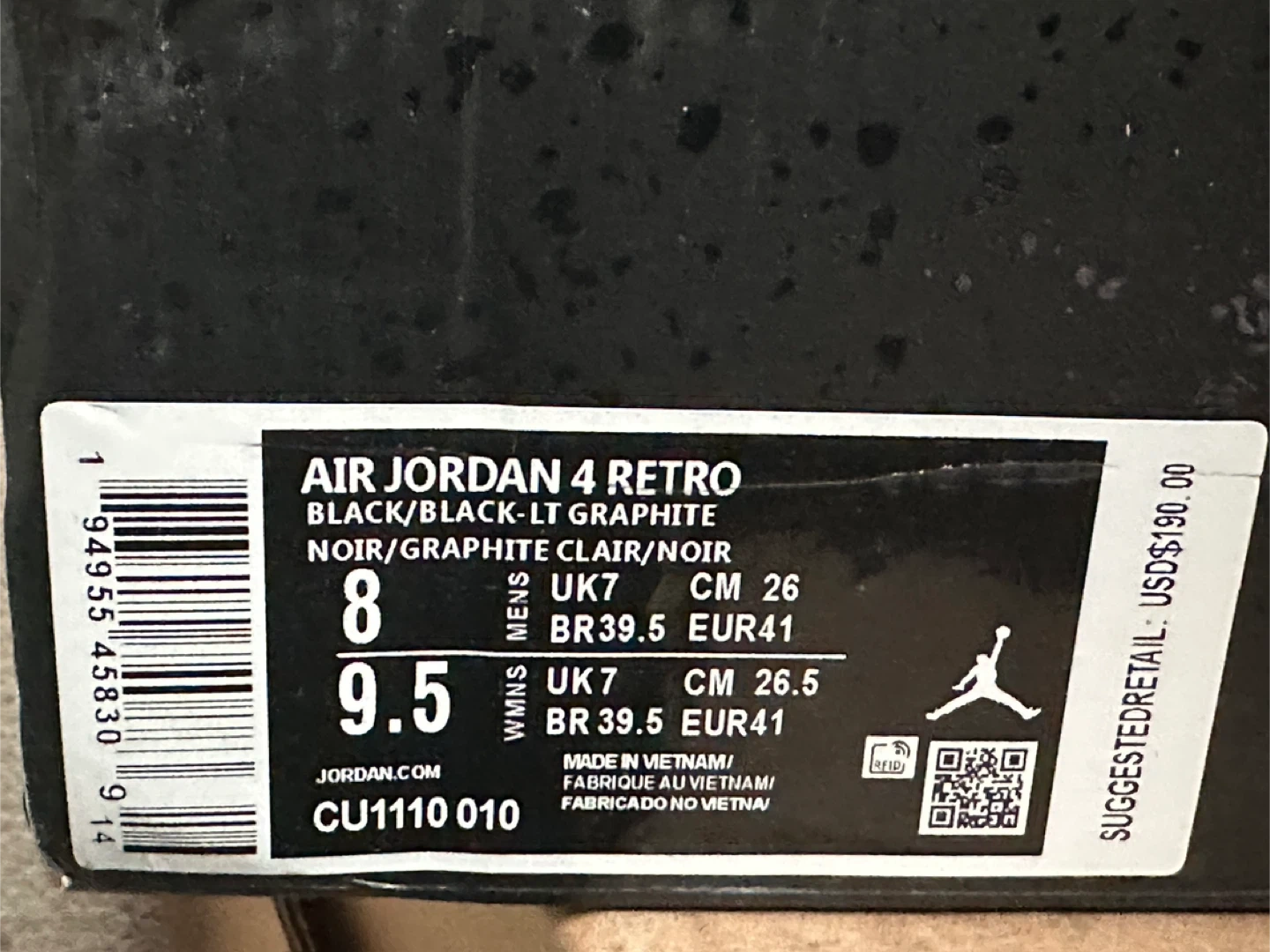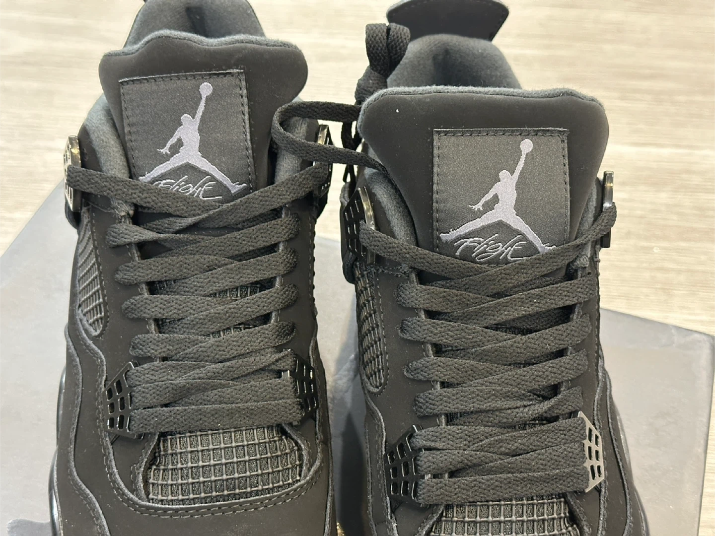 These Air Jordan 4 "Black Cat" sneakers are all black. They feature the Jumpman logo on the tongue and heel. They come with the original box. These are a men's size.