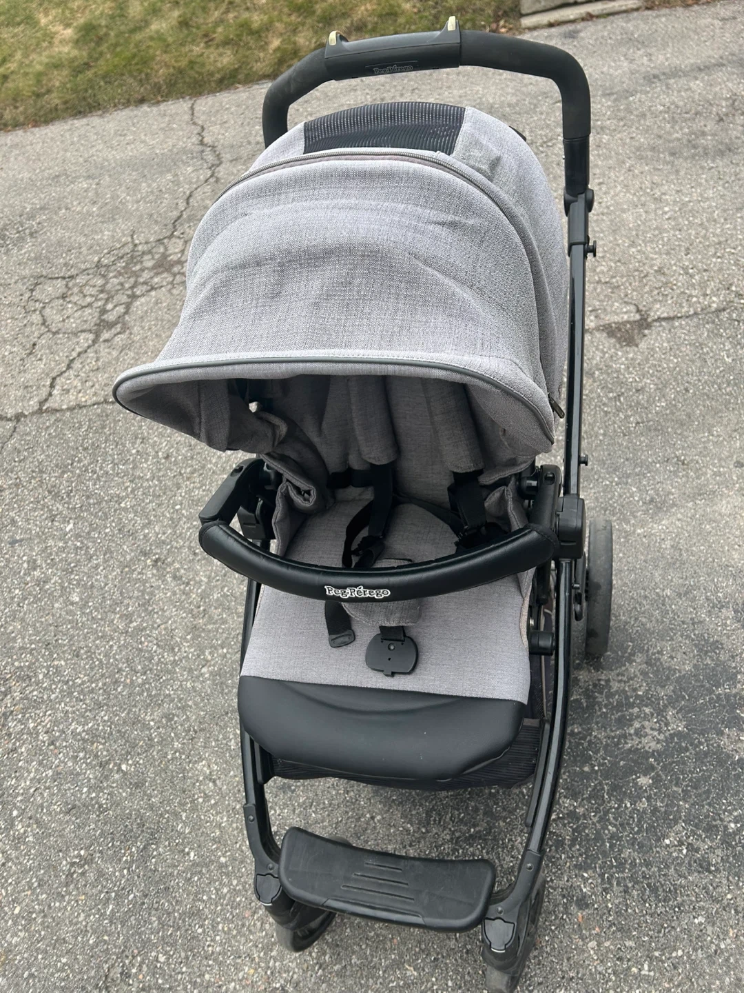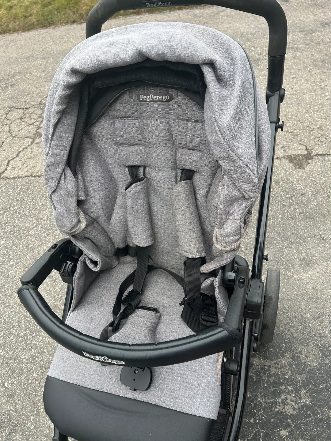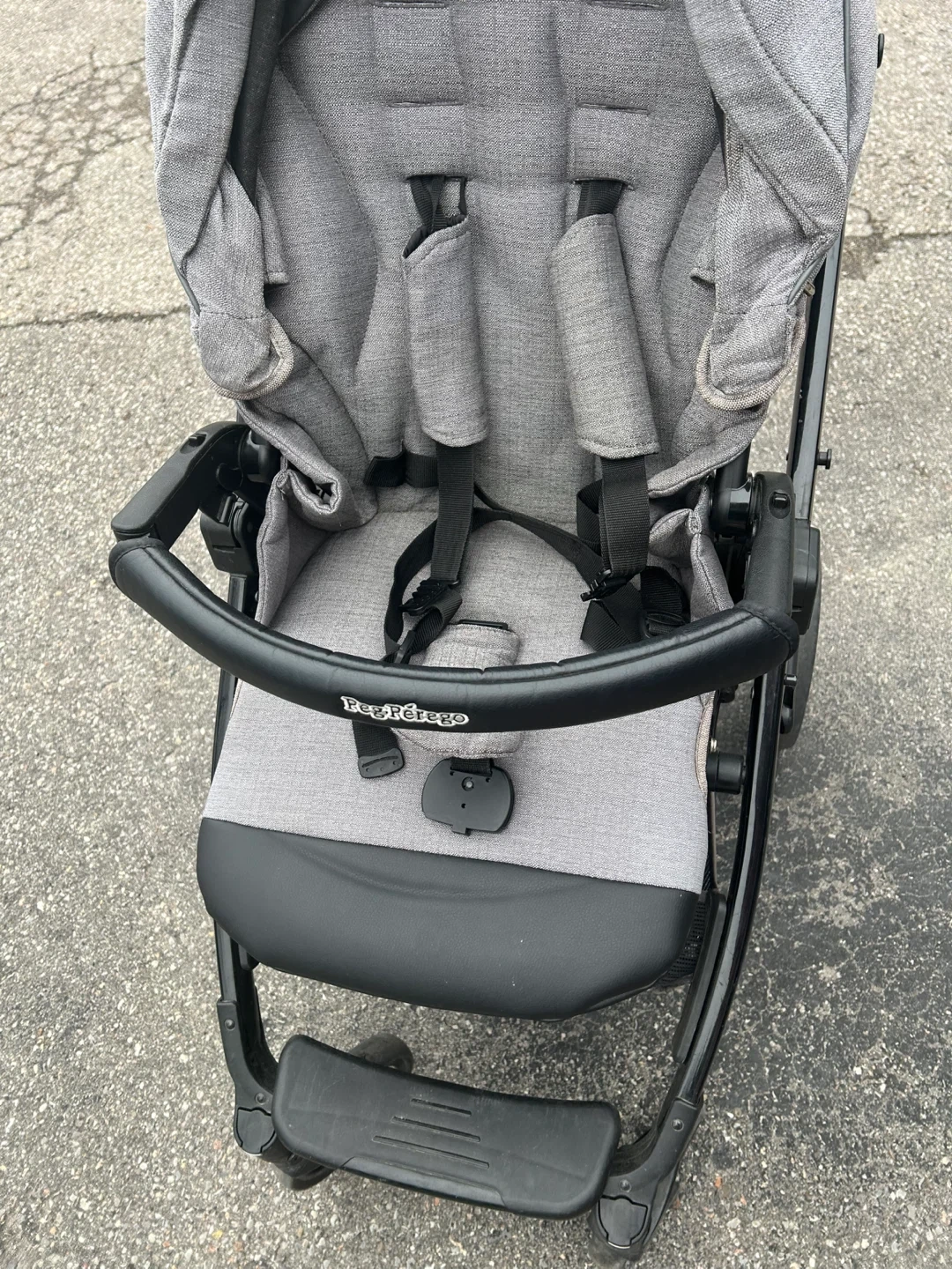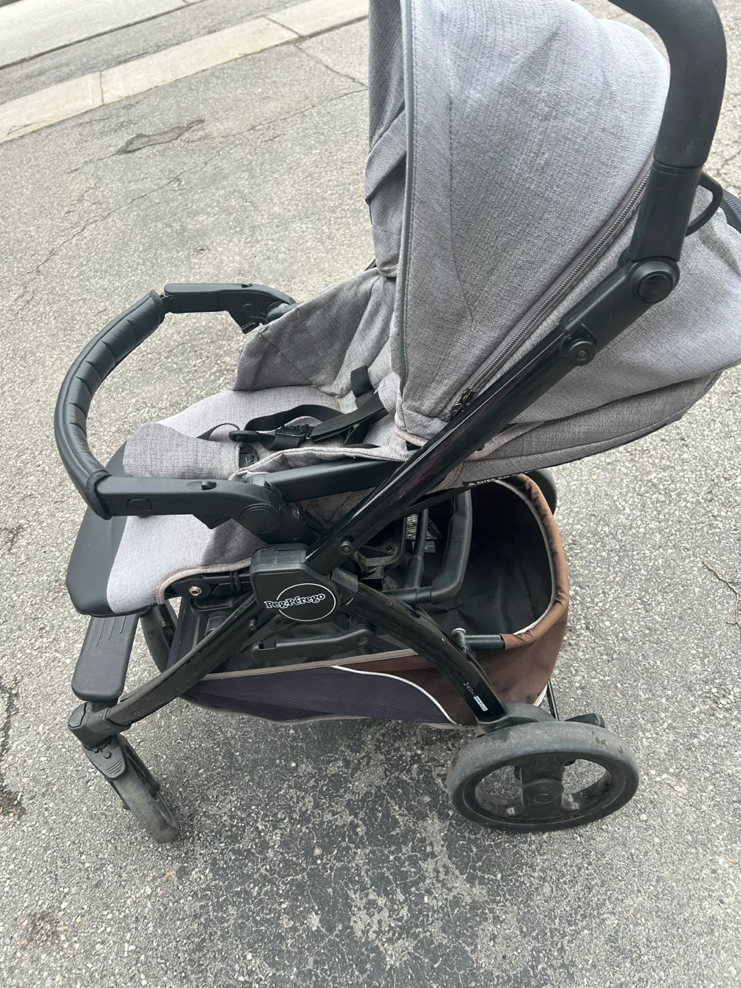 Grey Peg Perego stroller with a black frame. It's got a comfortable seat and storage basket underneath. The stroller is made in EU. It's perfect for getting around town with your little one!