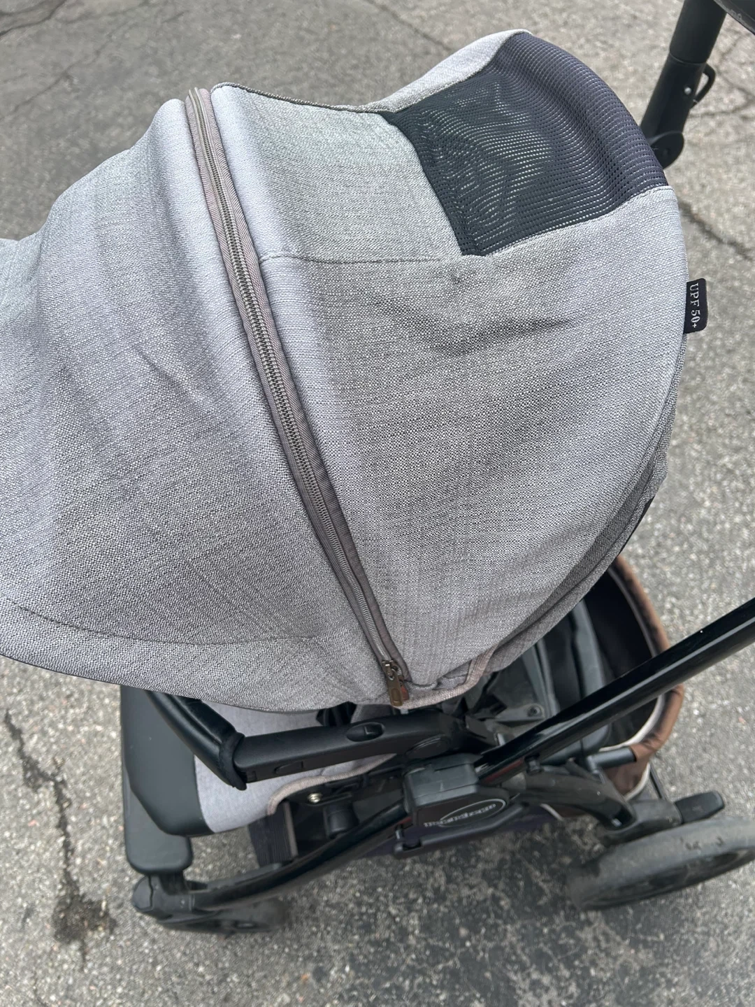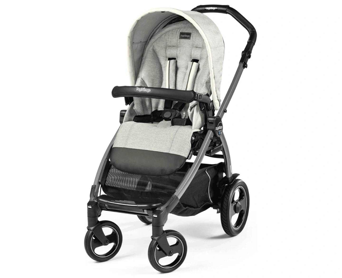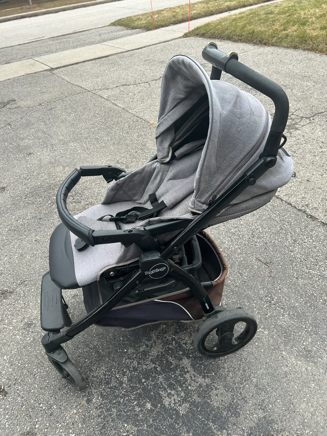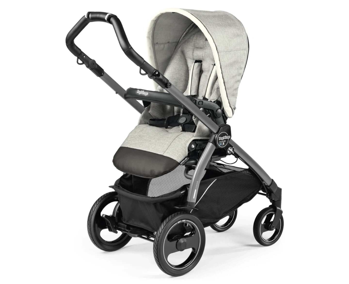 Grey Peg Perego stroller with a black frame. It's got a comfortable seat and storage basket underneath. The stroller is made in EU. It's perfect for getting around town with your little one!