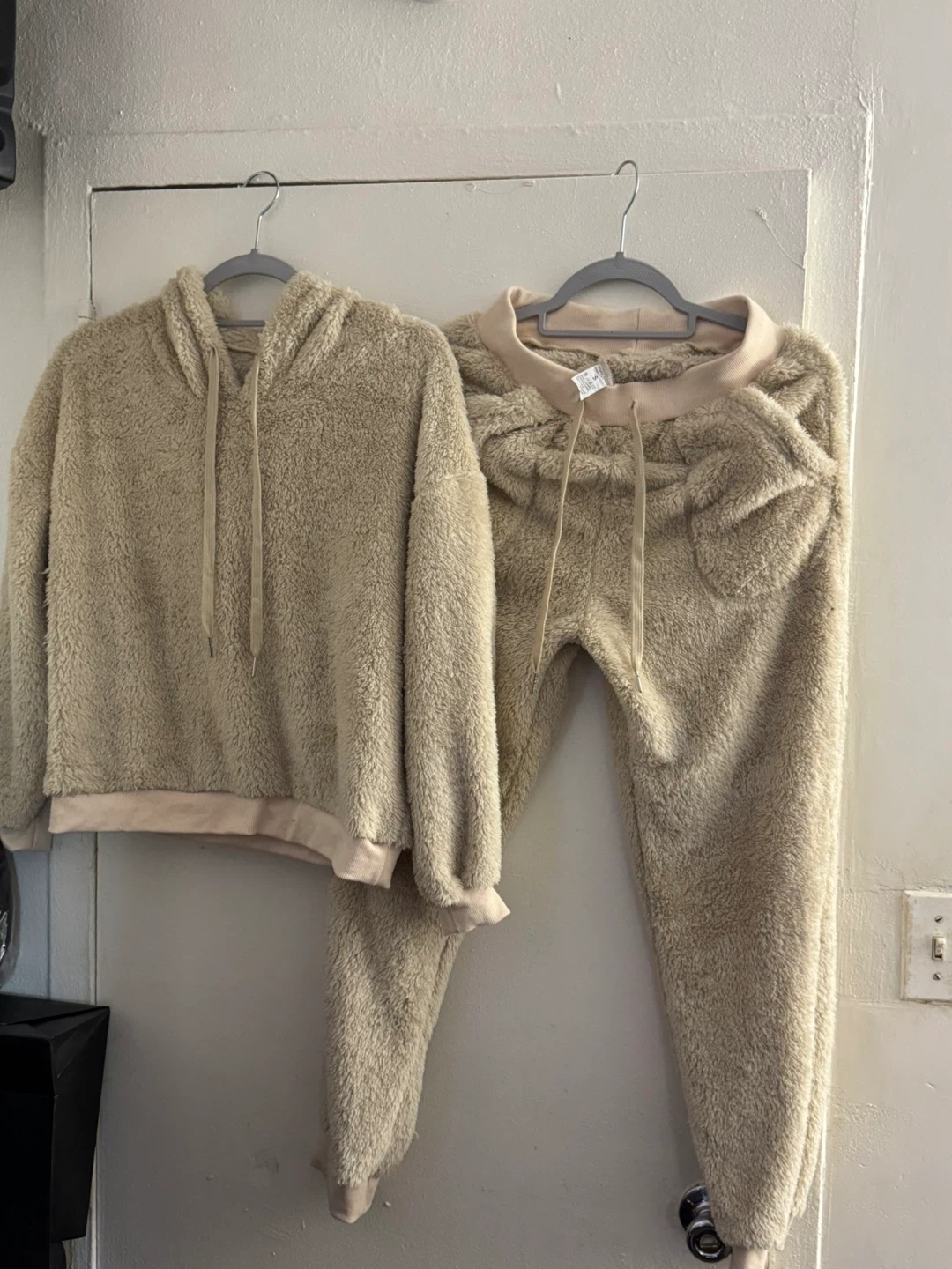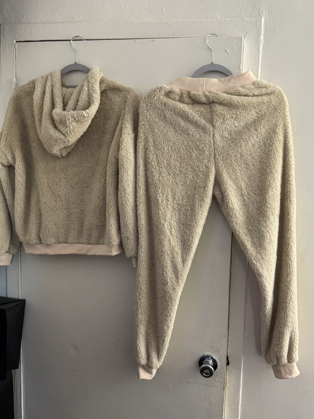 Super cozy fuzzy teddy bear fleece hoodie and matching jogger set. This two-piece loungewear set is designed for ultimate comfort. It's perfect for relaxing at home or casual outings!