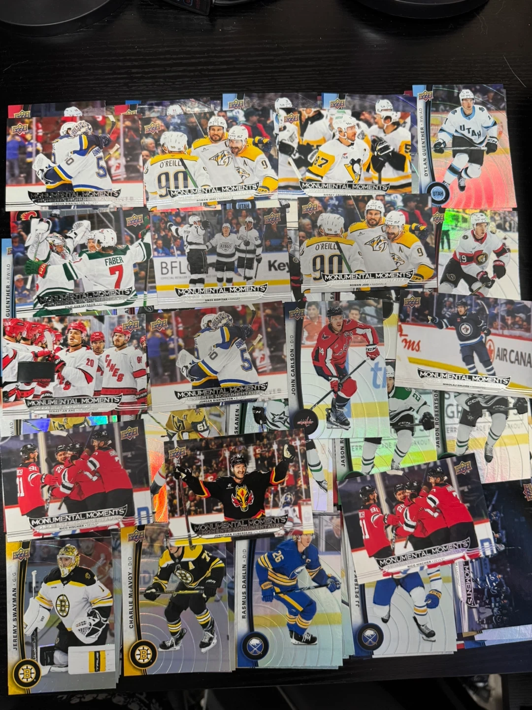 Collection of Upper Deck 2021-22 NHL hockey trading cards featuring various players. Includes several 'Monumental Moments' inserts. Cards are in great condition.