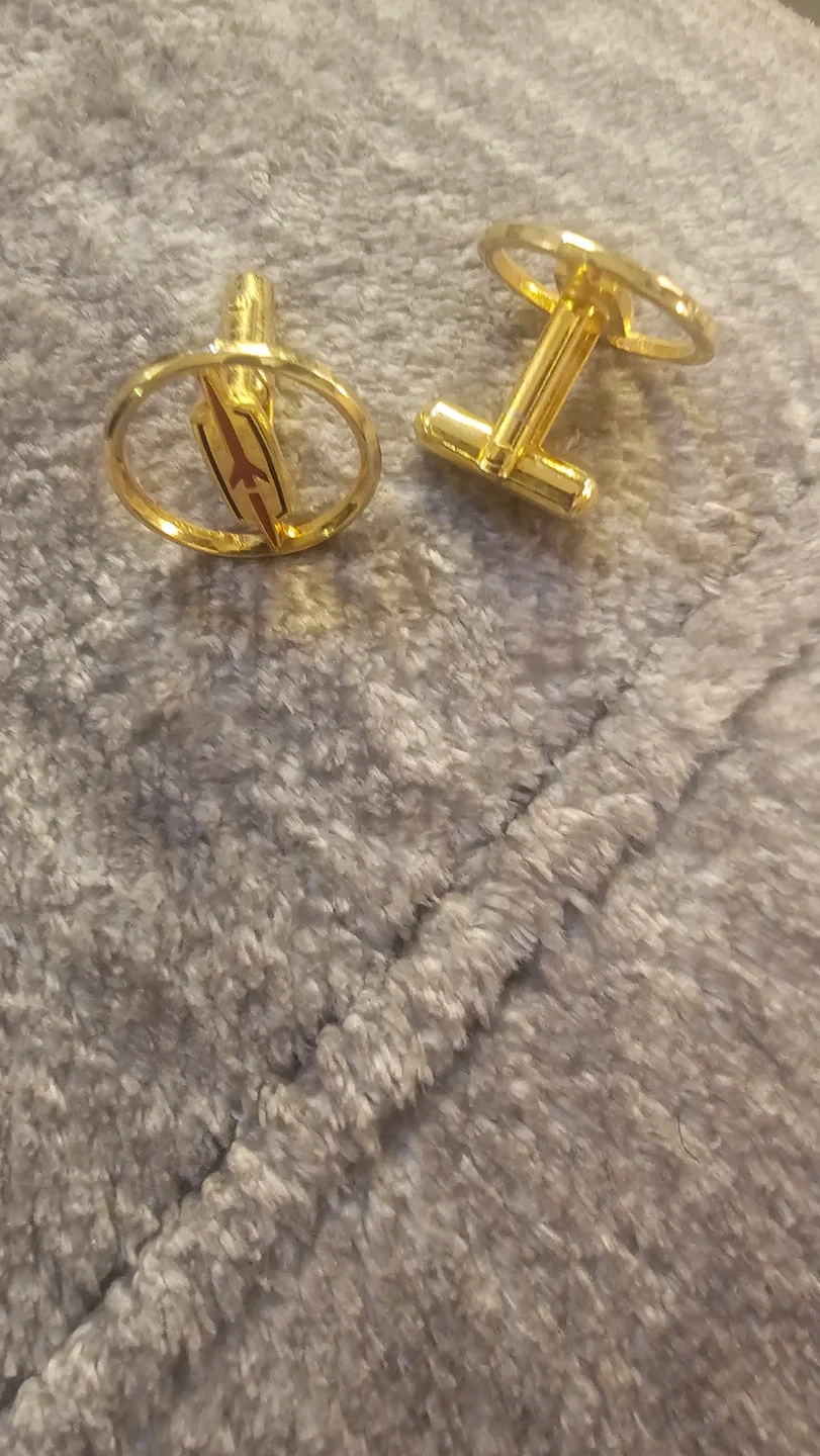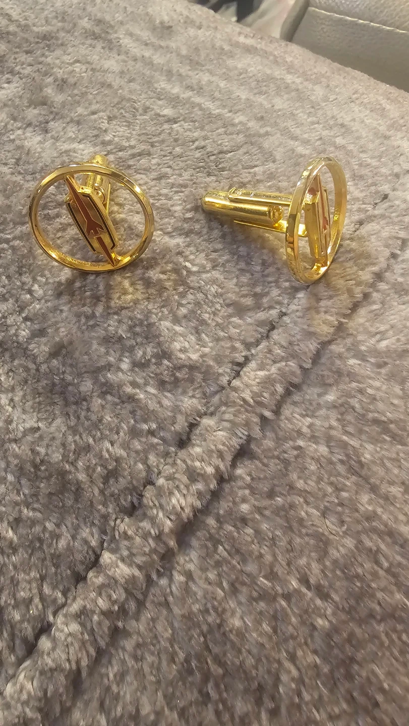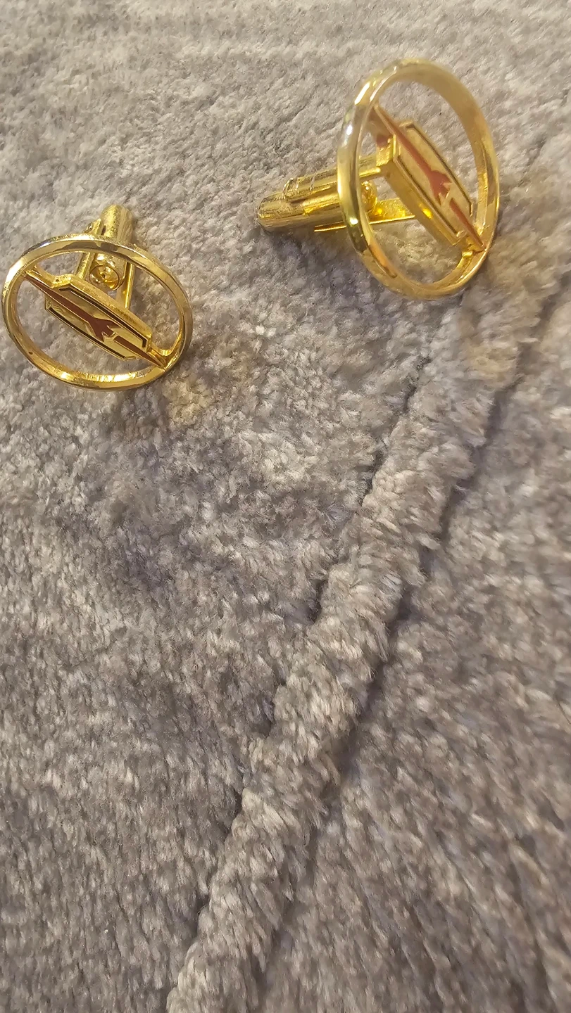 A pair of limited rare Oldsmobile gold-tone cufflinks. They feature a circular design with the famous red rocket emblem. A nice accessory for car enthusiast and collectors of all sorts they also look great for dress shirts! Own these bad boys now.