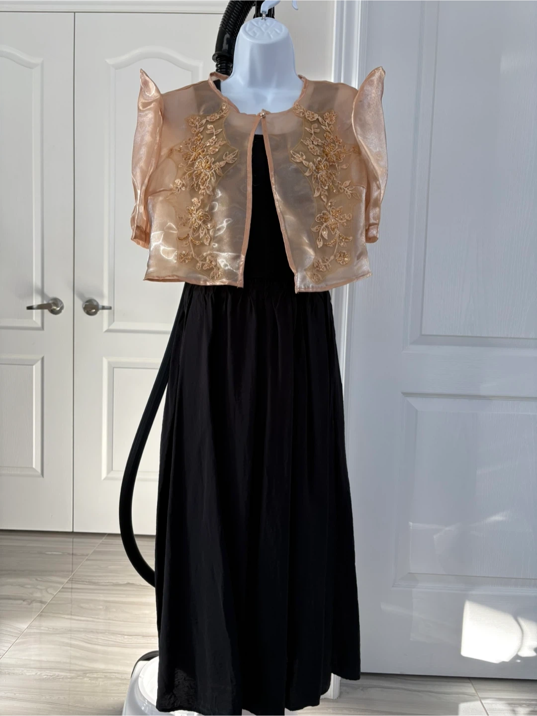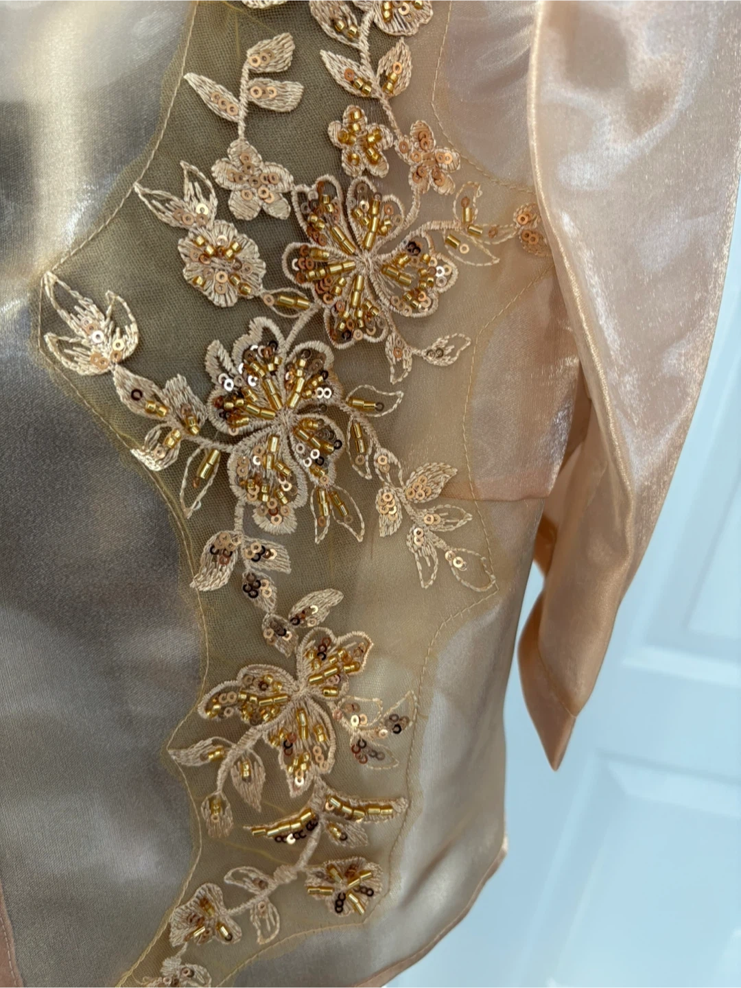 Selling a beautiful Filipiniana bolero in a lovely rose gold colour. The bolero features intricate floral embroidery with gold sequins and beads. Perfect for special occasions or adding a touch of elegance to any outfit!