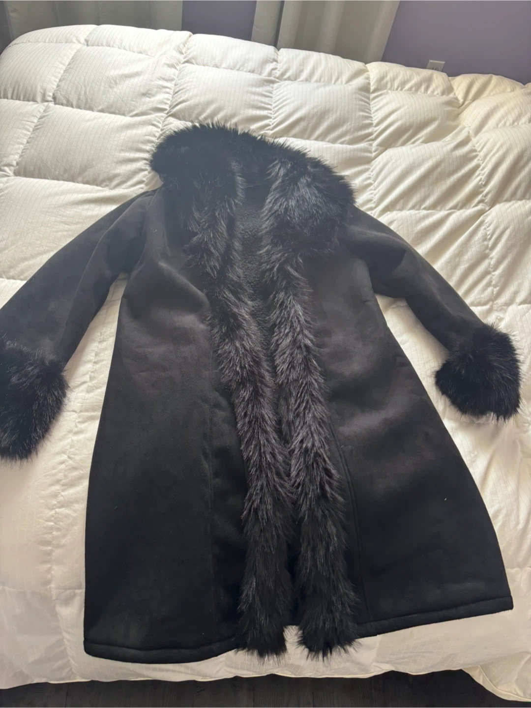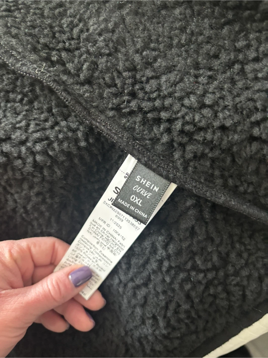 This is a SHEIN CURVE black coat with faux fur trim. It features a cozy sherpa lining and is a size 0XL. Perfect for staying warm and stylish on chilly days!