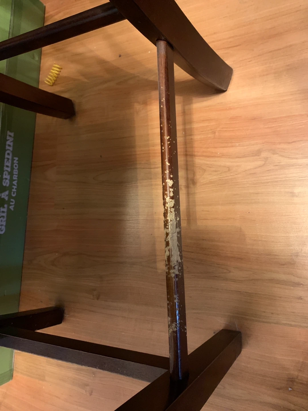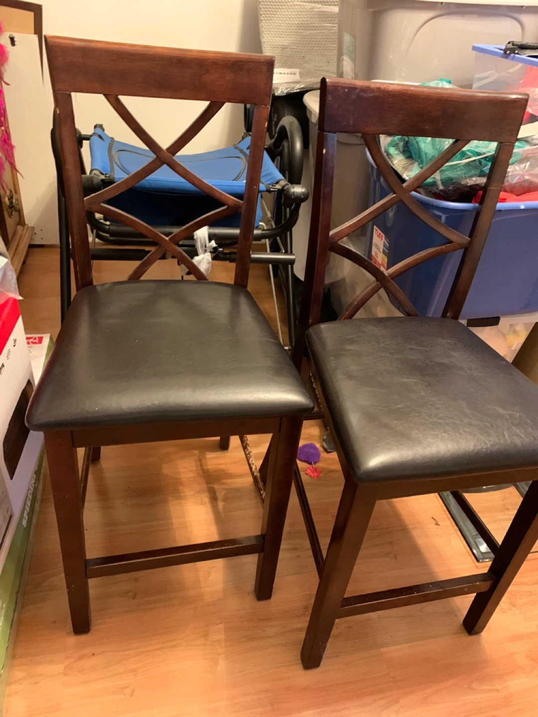 Two dark brown wooden counter height chairs with faux leather seats. They've got a classic criss-cross back design. One chair has some wear on the leg, as shown in the photo. Suitable for a kitchen island or counter.