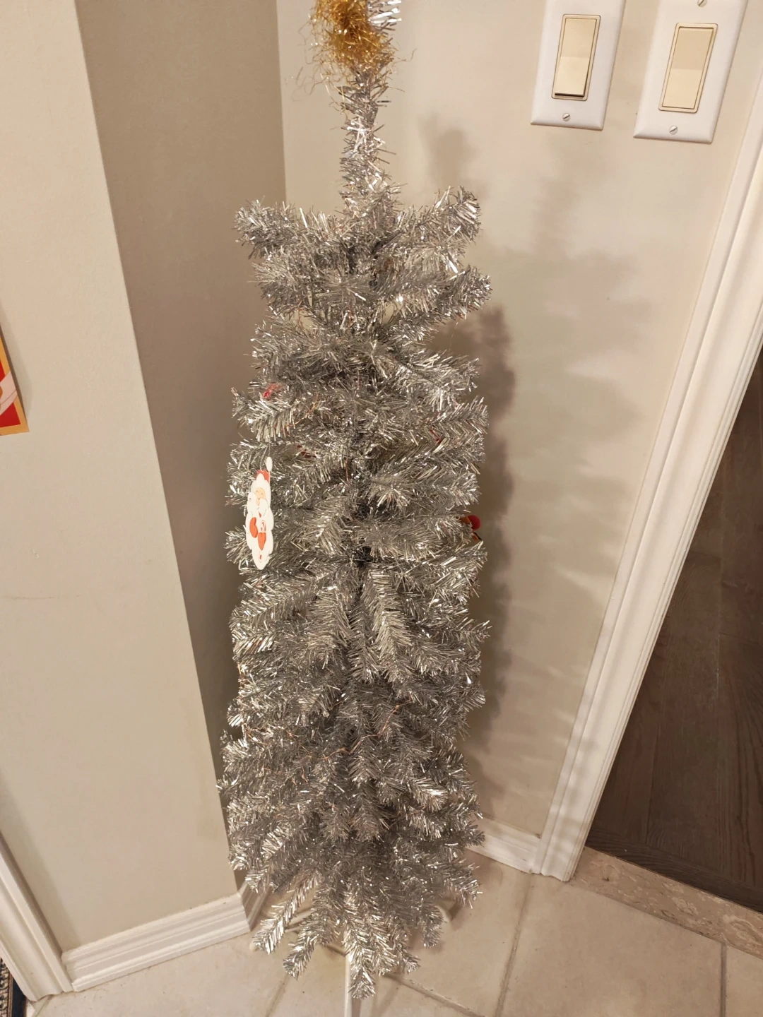 A sparkly silver tinsel Christmas tree, perfect for adding a festive touch to smaller spaces. It's about 4 feet tall and comes with a Santa ornament. This tree is easy to set up and store, making holiday decorating a breeze!