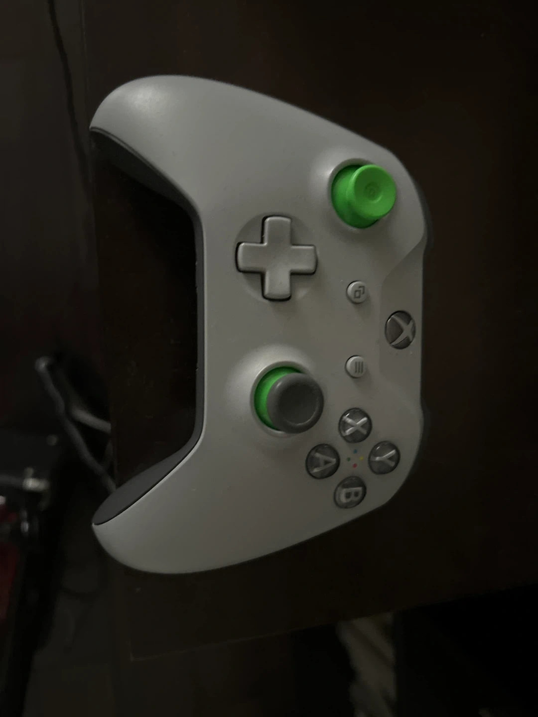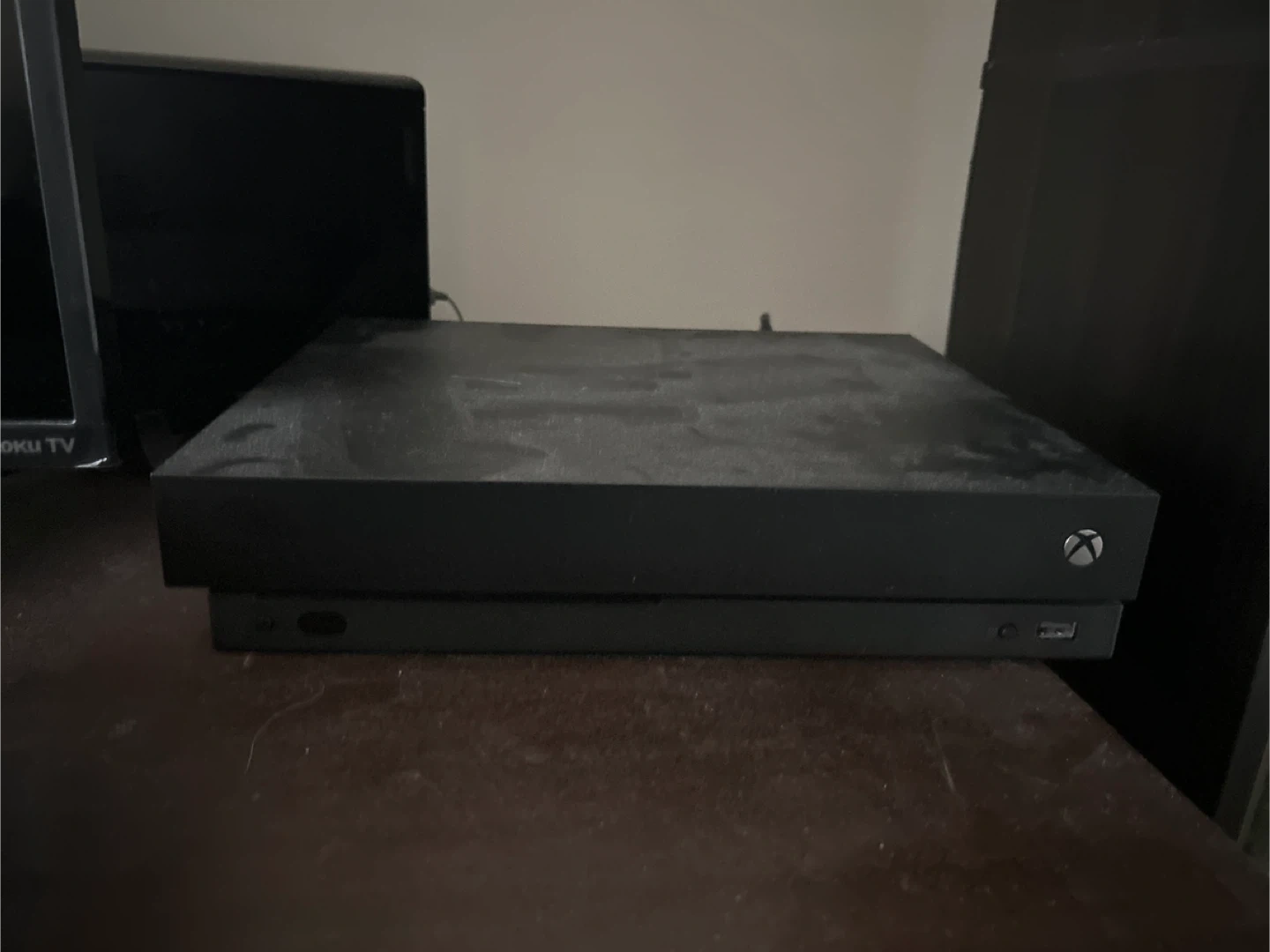 Xbox One X console in black. Comes with a grey and green controller. It's ready for gaming!