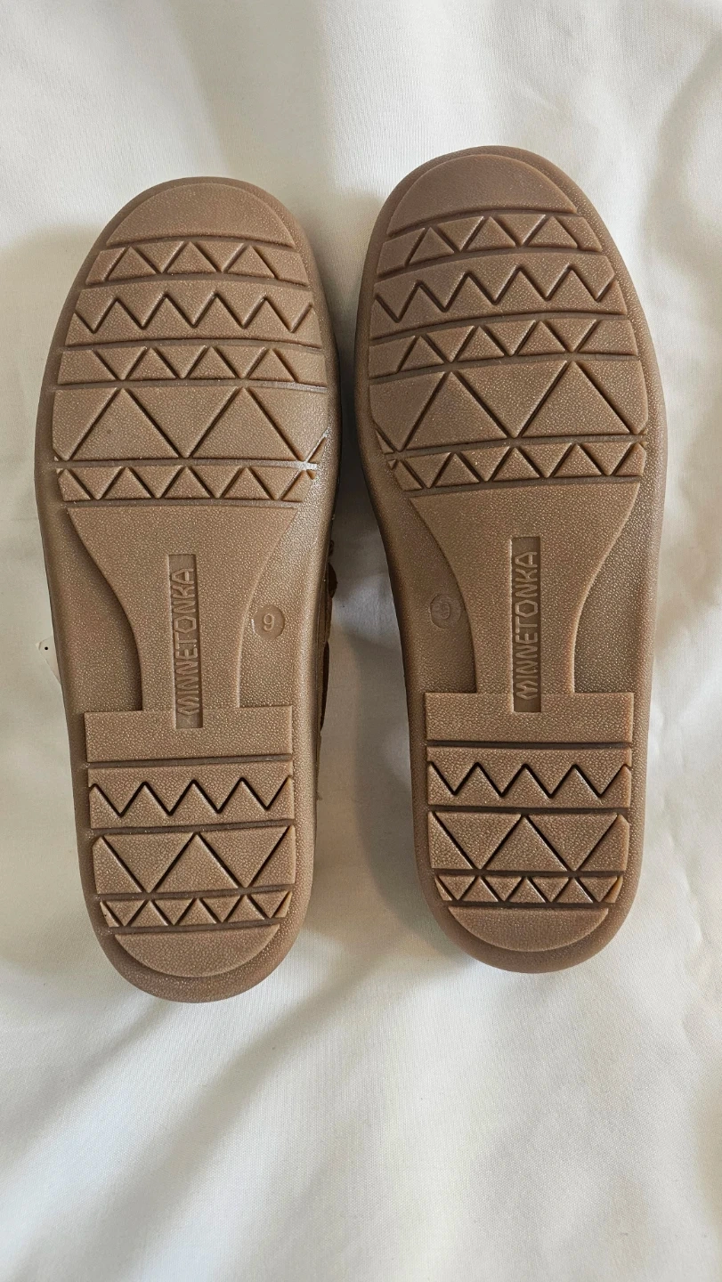 Cozy Minnetonka moccasin slippers. Features a suede exterior with faux fur lining for warmth. The size is 9.