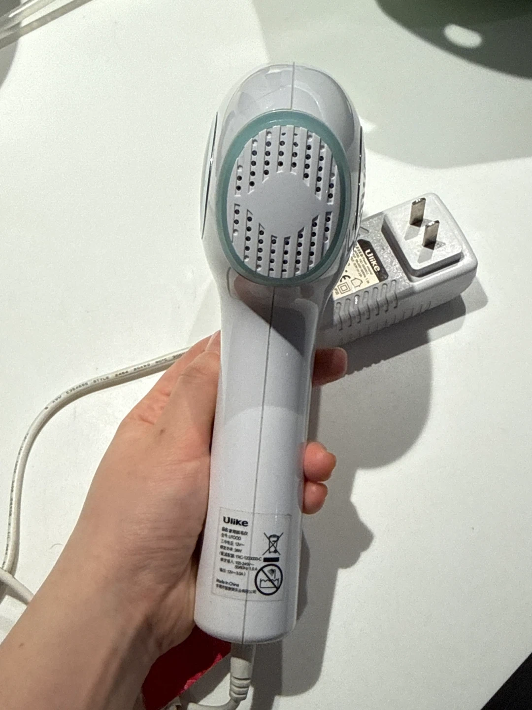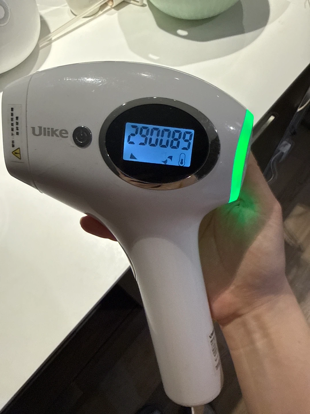 This Ulike IPL device is white with a sleek design. It includes a power adapter. The device has a digital display showing 290089 times available. It's great for at-home hair removal.