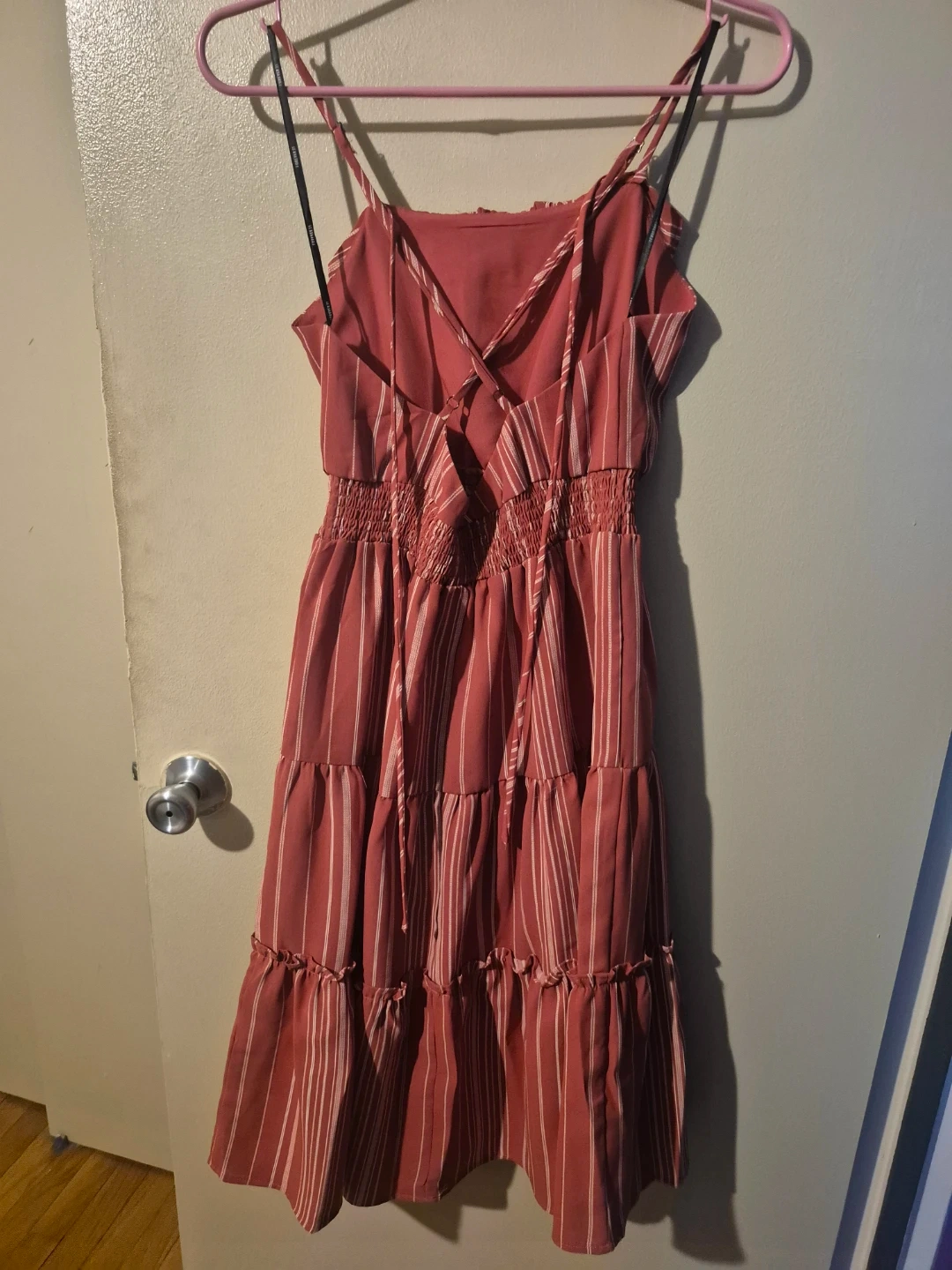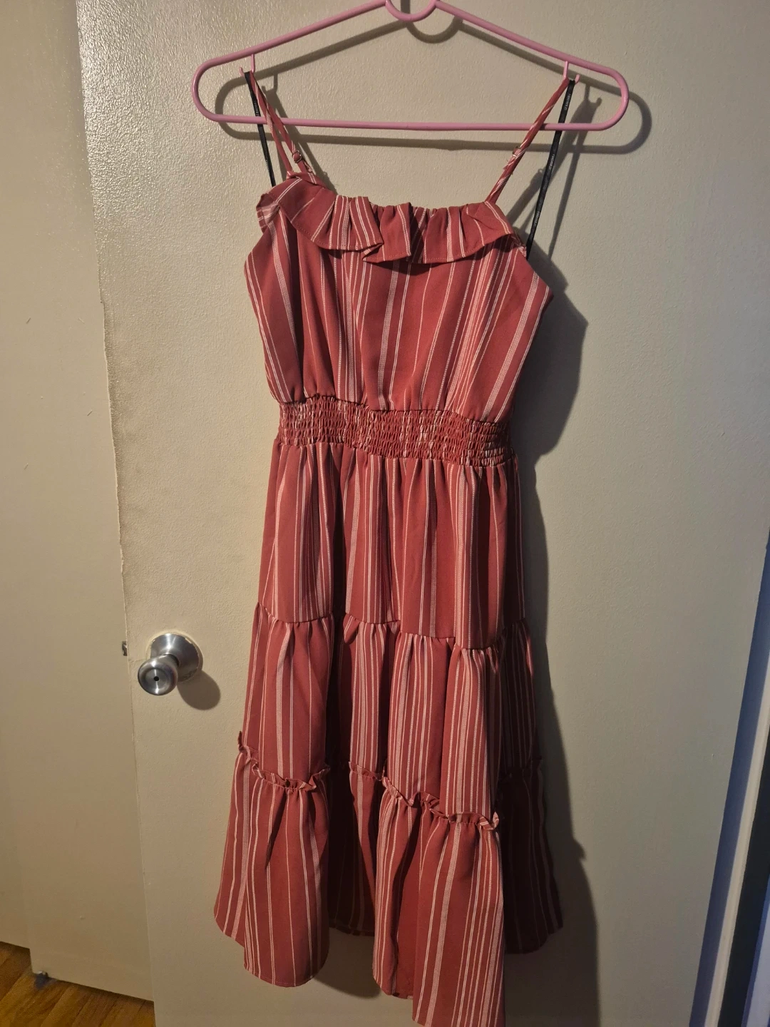 This women's midi dress features a rust color with white vertical stripes. It has a ruffled neckline and a smocked waistband. Adjustable spaghetti straps and a tiered, ruffled hem complete the look. It's made from a lightweight fabric perfect for warmer weather! Size M.