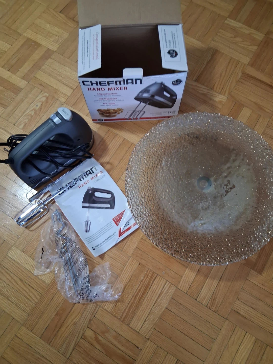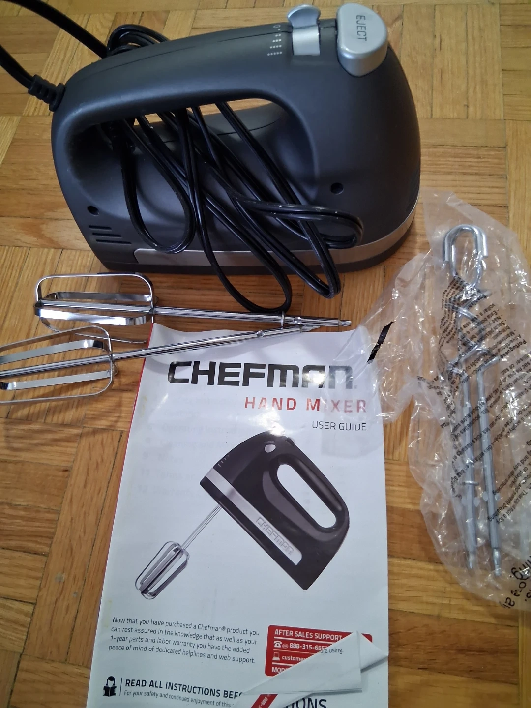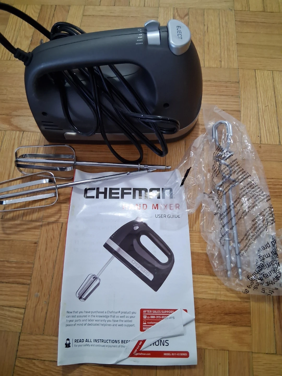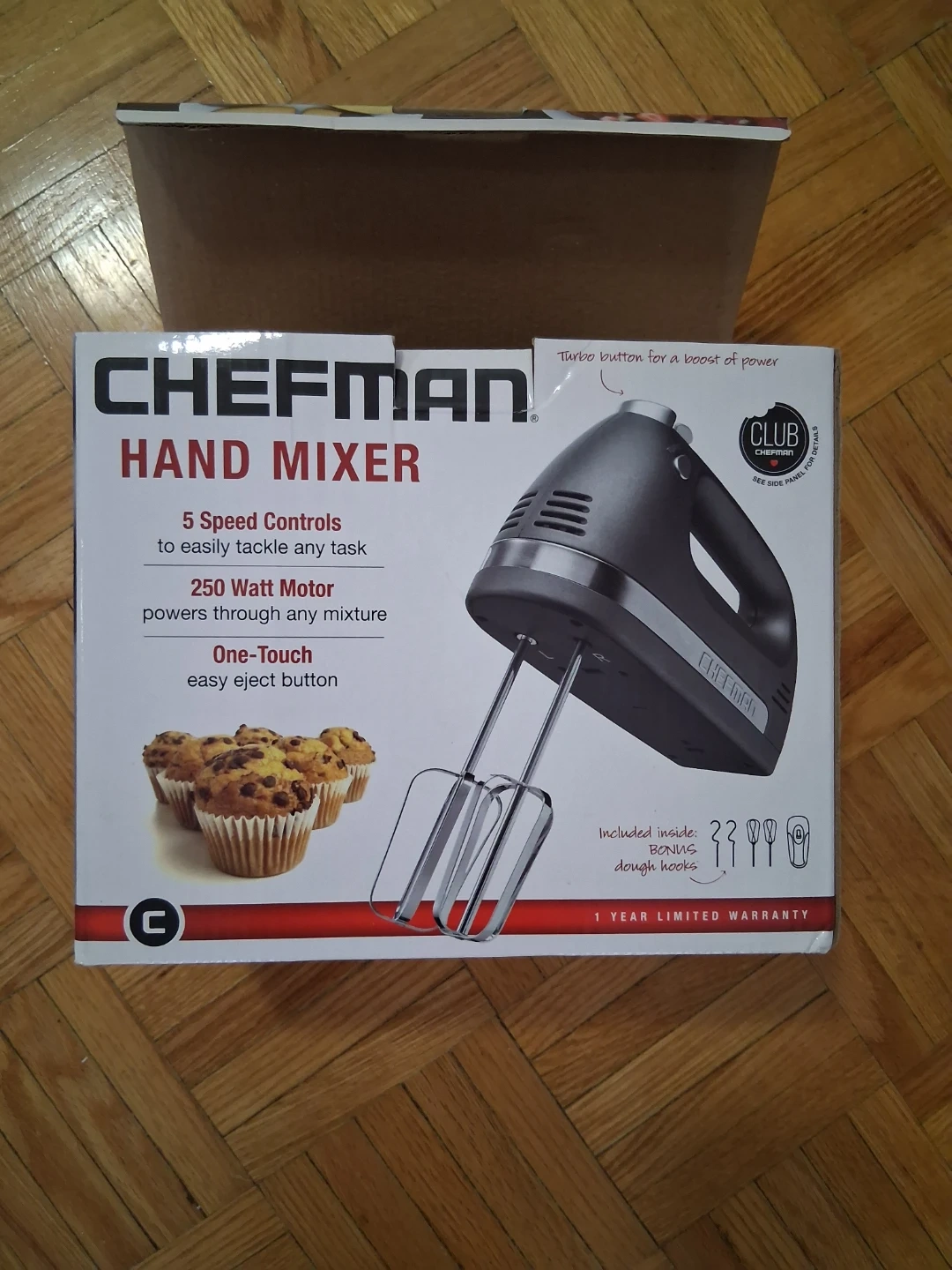 This Chefman hand mixer has 5 speed controls and a 250 Watt motor. It includes a one-touch easy eject button and comes with beaters and dough hooks. It's great for tackling various mixing tasks. Included cake tray