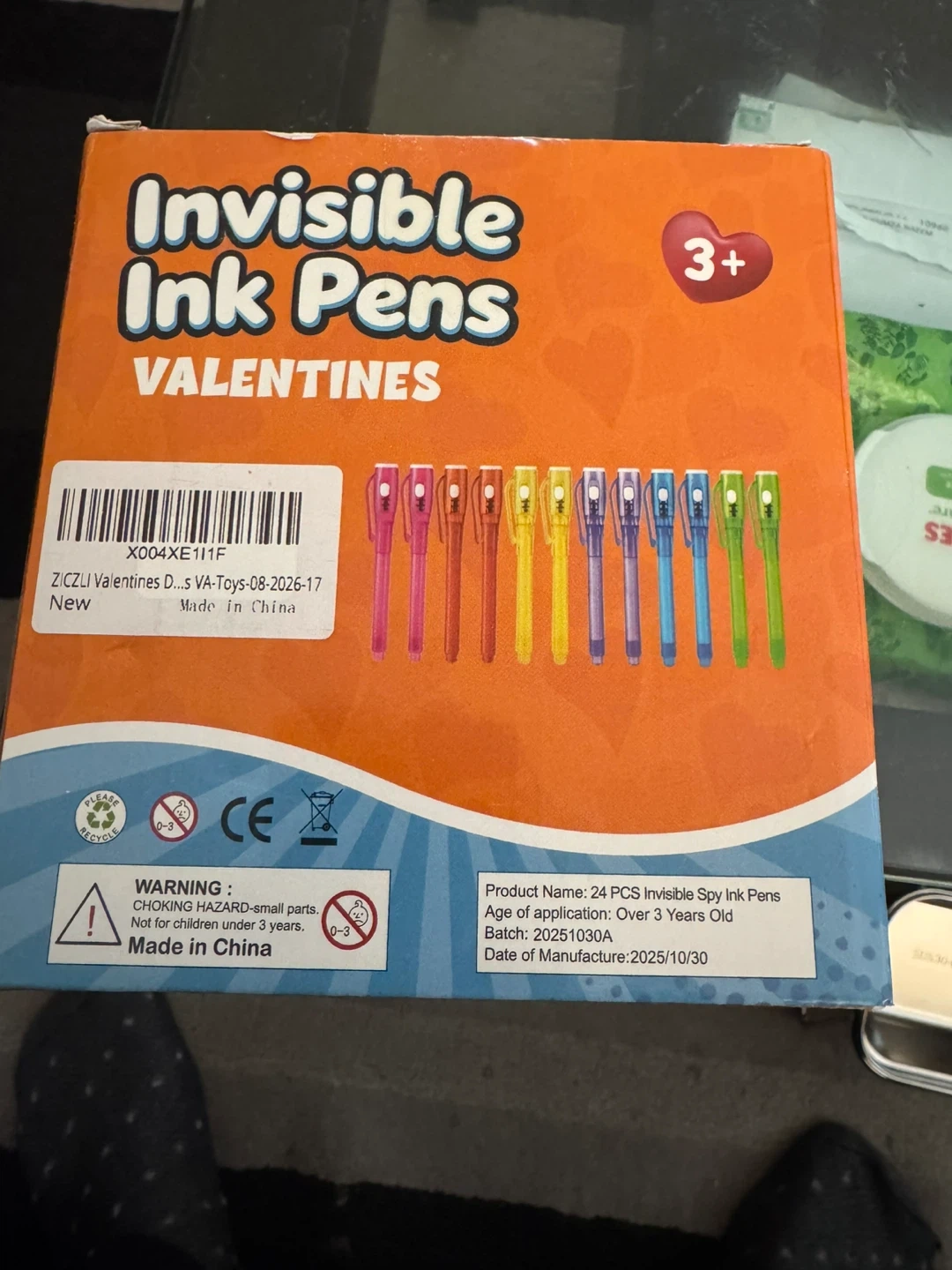 These invisible ink pens are perfect for Valentine's Day cards or secret messages! The ink is only visible under the included UV light. Comes in a pack of 24 pens, recommended for ages 3 and up. Made in China.