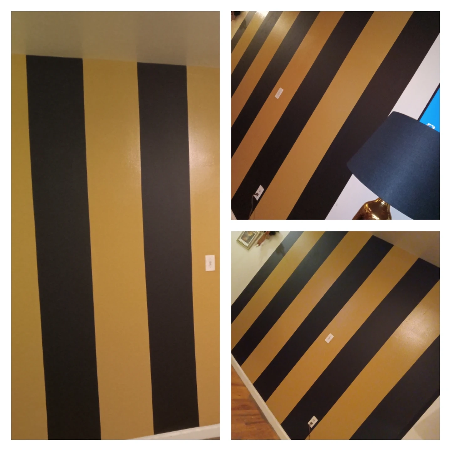 Features a bold striped pattern with gold and dark gray colors. The stripes run diagonally across the wall. This unique paint job adds a modern, graphic touch to any room. Perfect for creating a statement wall!