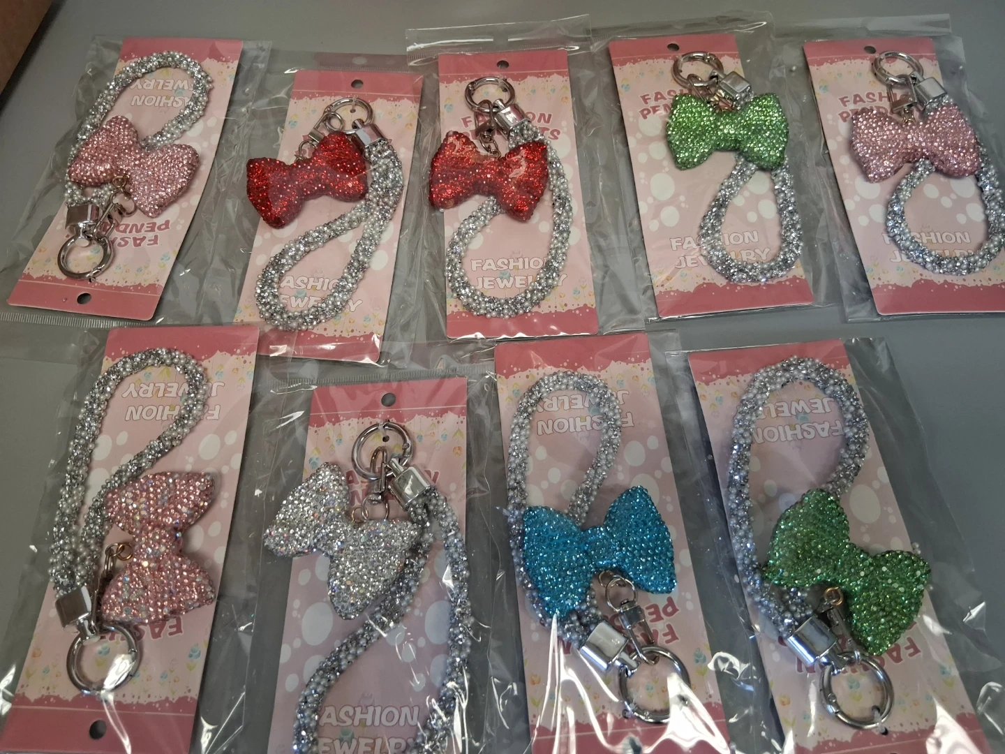 These keychains feature a sparkly bow charm with a glittery lanyard. They're perfect for adding some flair to your keys or bag! Available in pink, red, green, silver, and blue.