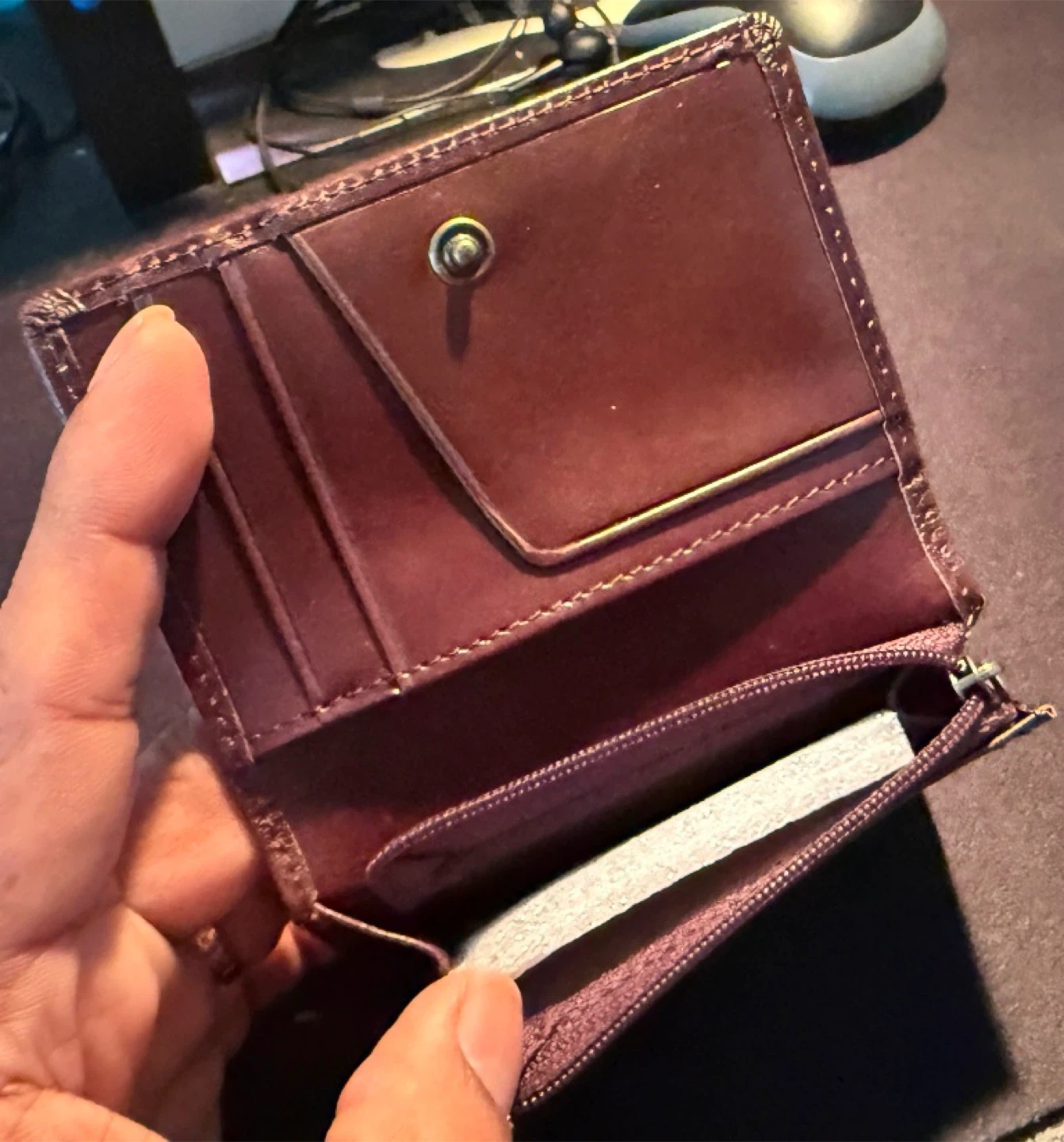 Holds Drivers License; Cards (5-8); Cash; Coins; etc.