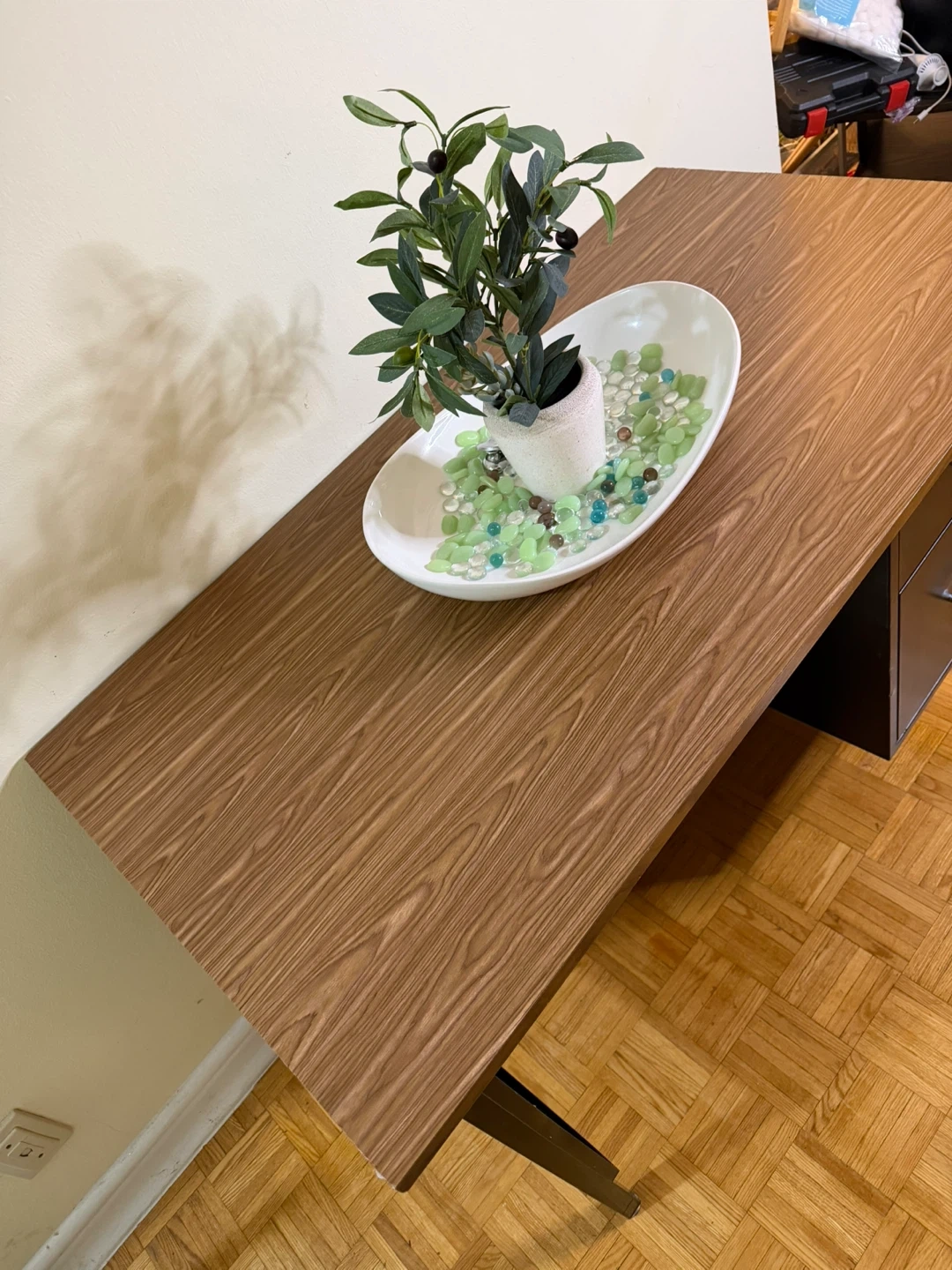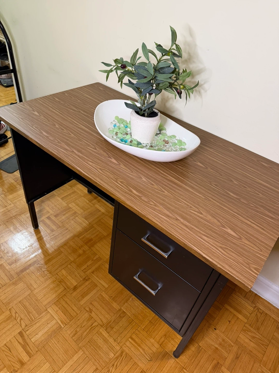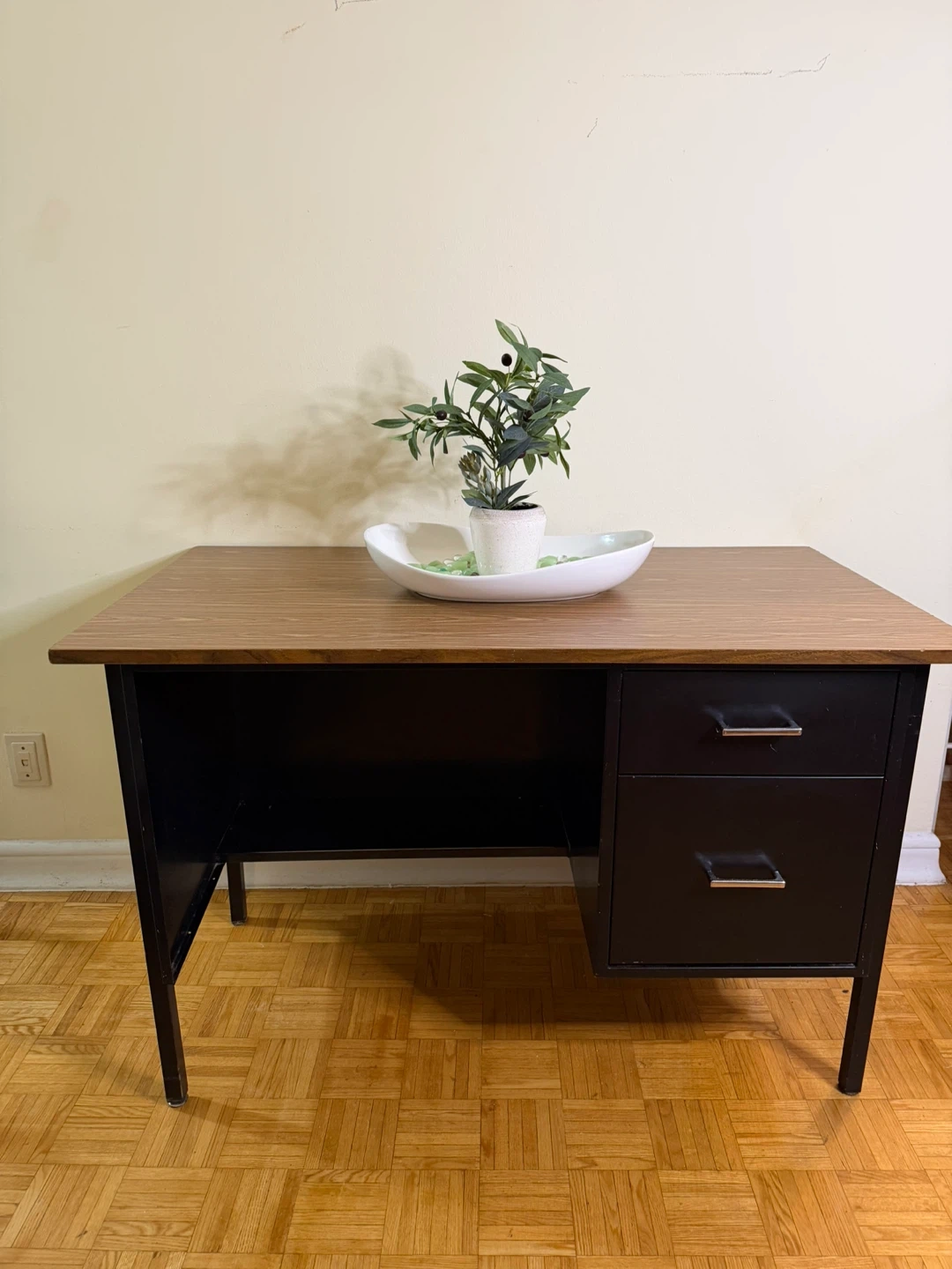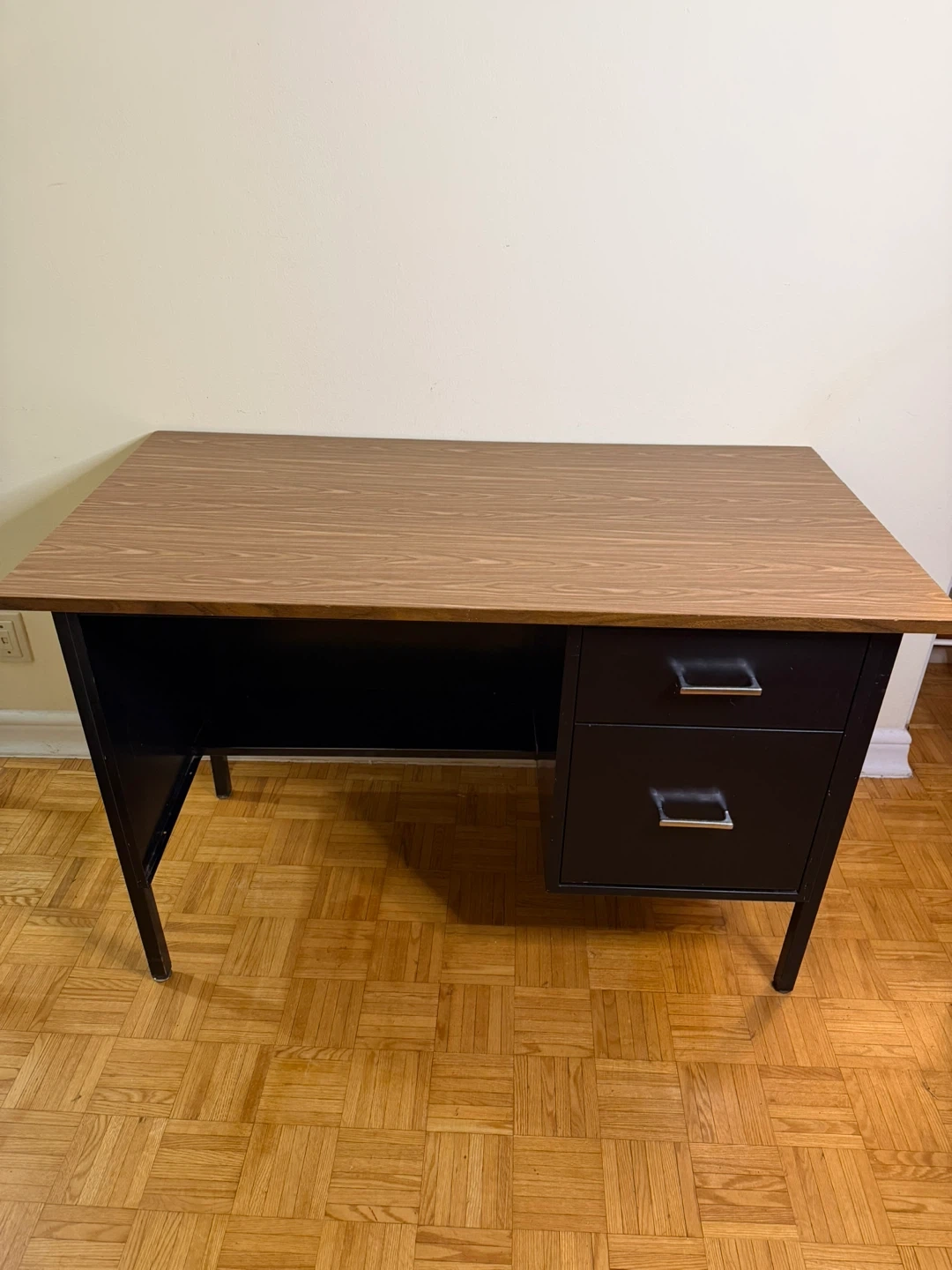 This vintage desk features a durable metal frame and a wood grain laminate top. It has two drawers for storage. The desk is suitable for an office or home workspace. It's a practical piece for anyone needing a writing or computer surface.