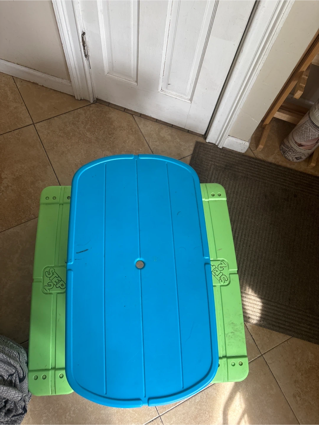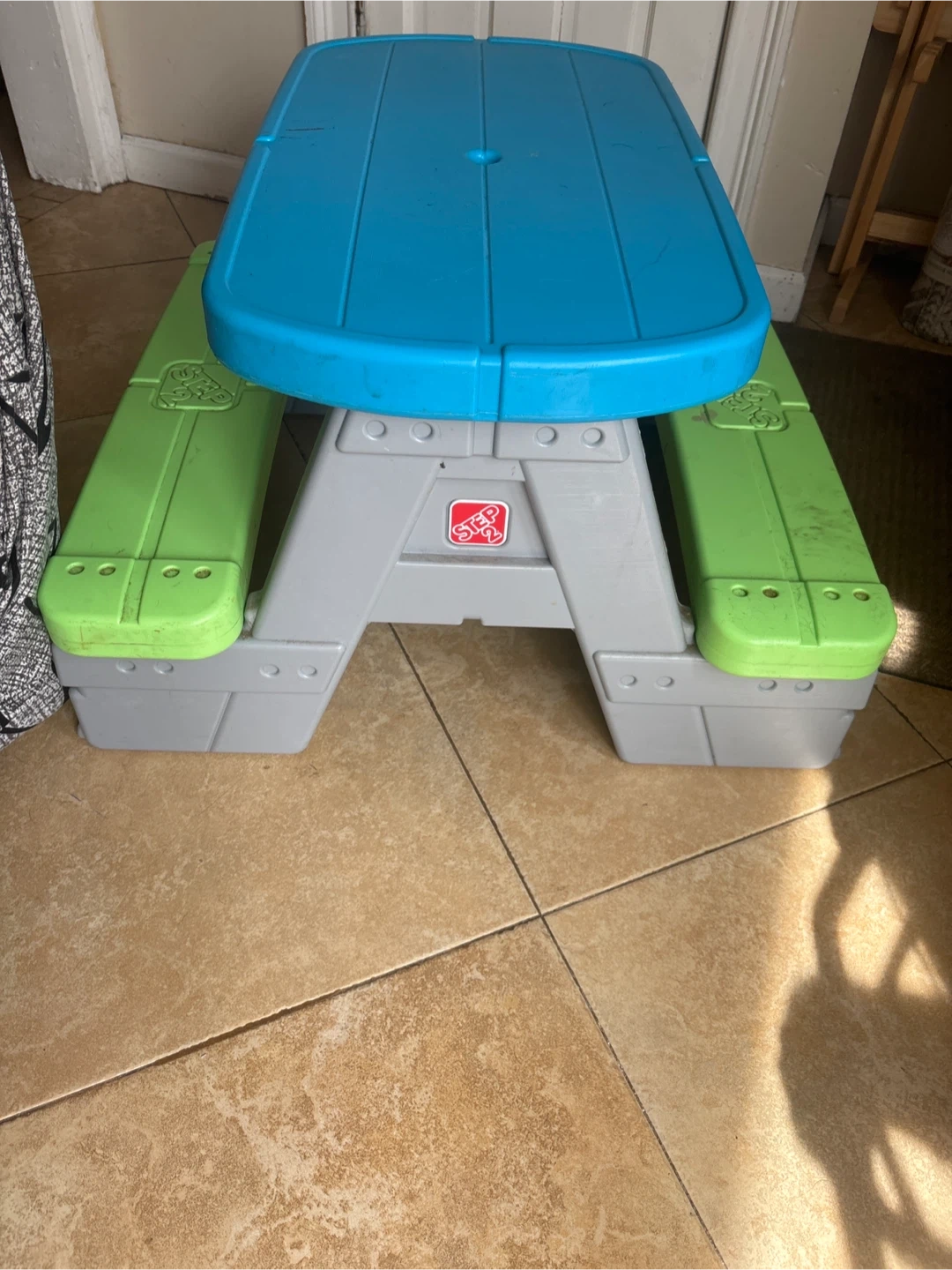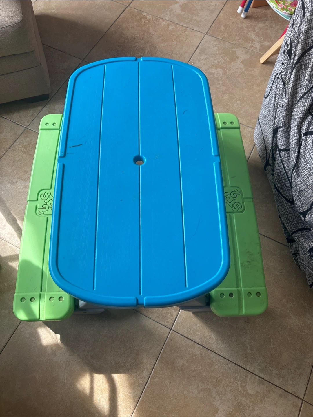 Kids picnic table with blue tabletop and green seats. It's made of plastic and great for indoor or outdoor play. This table's design is durable and easy to clean!