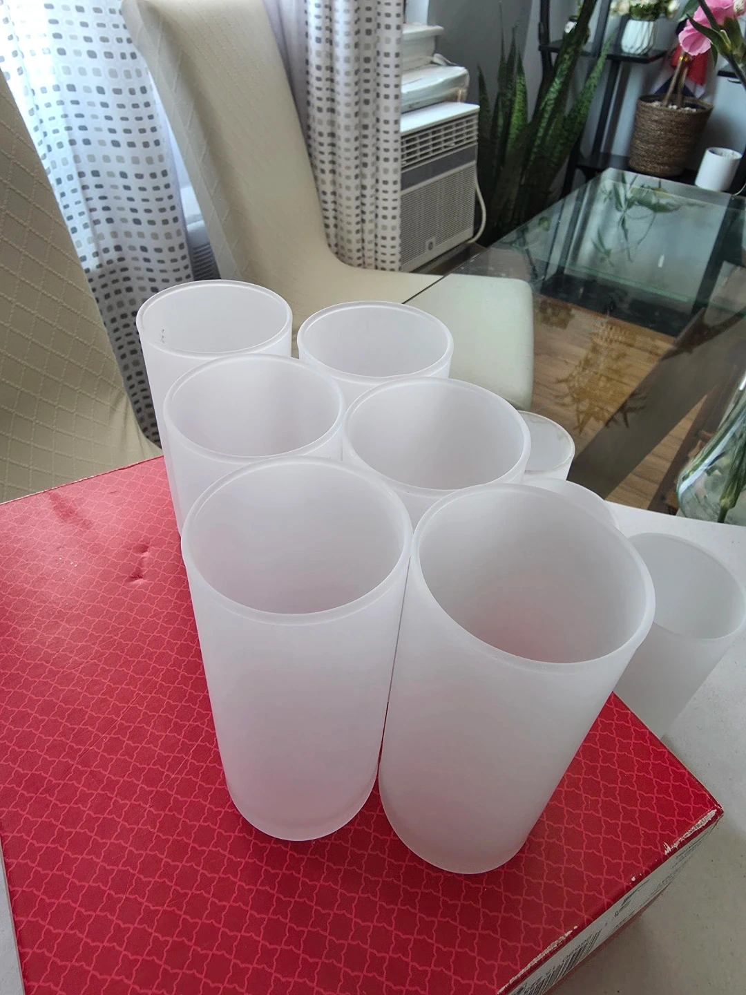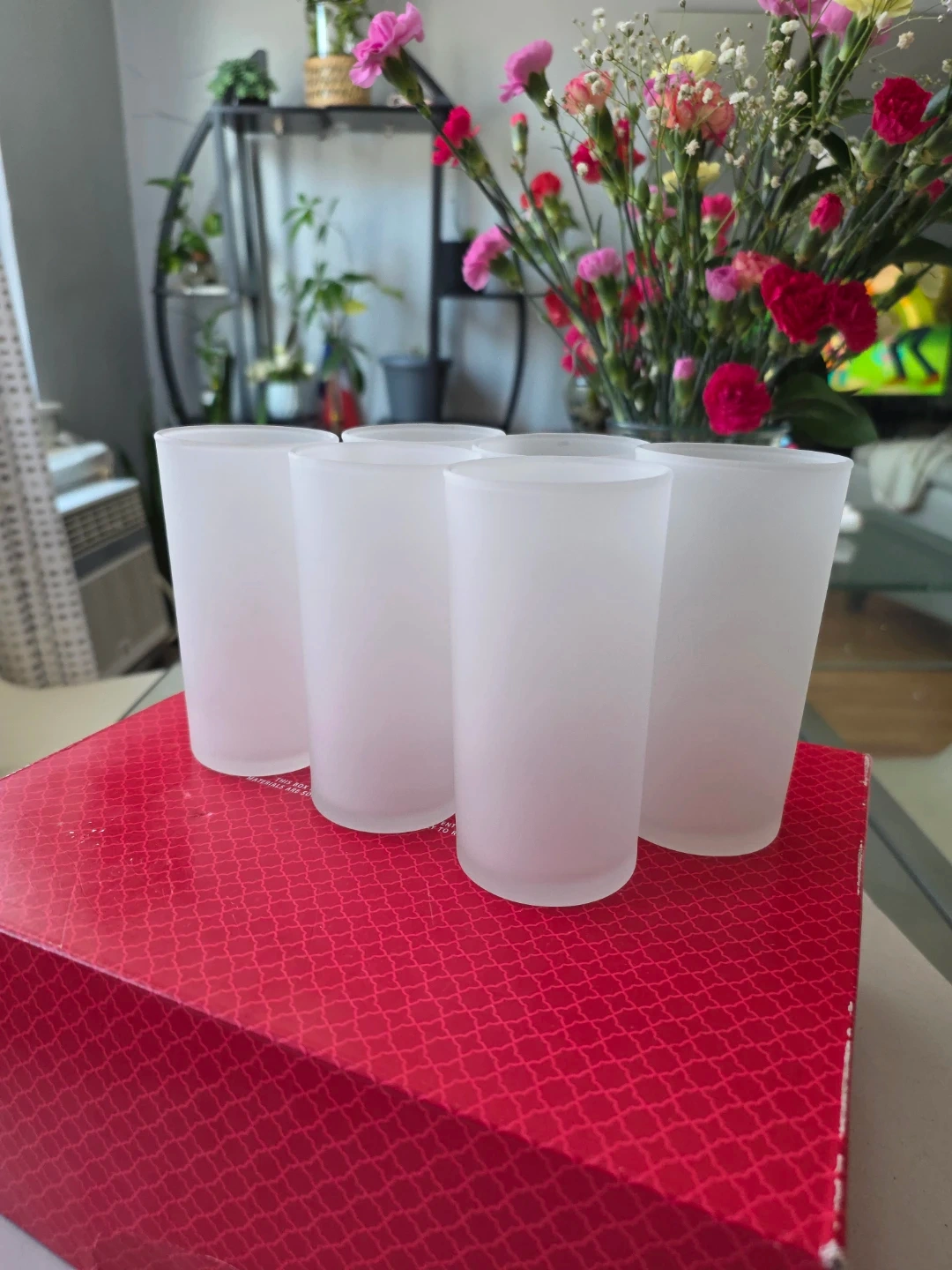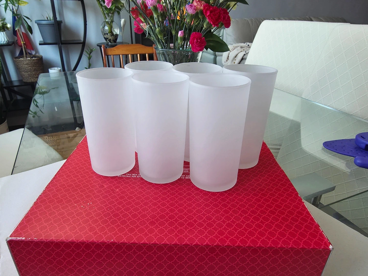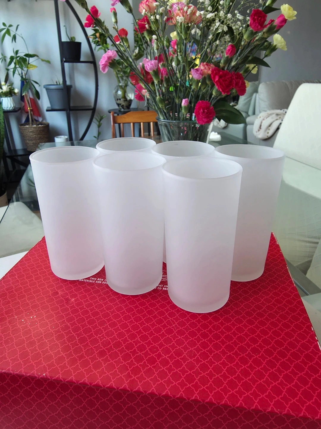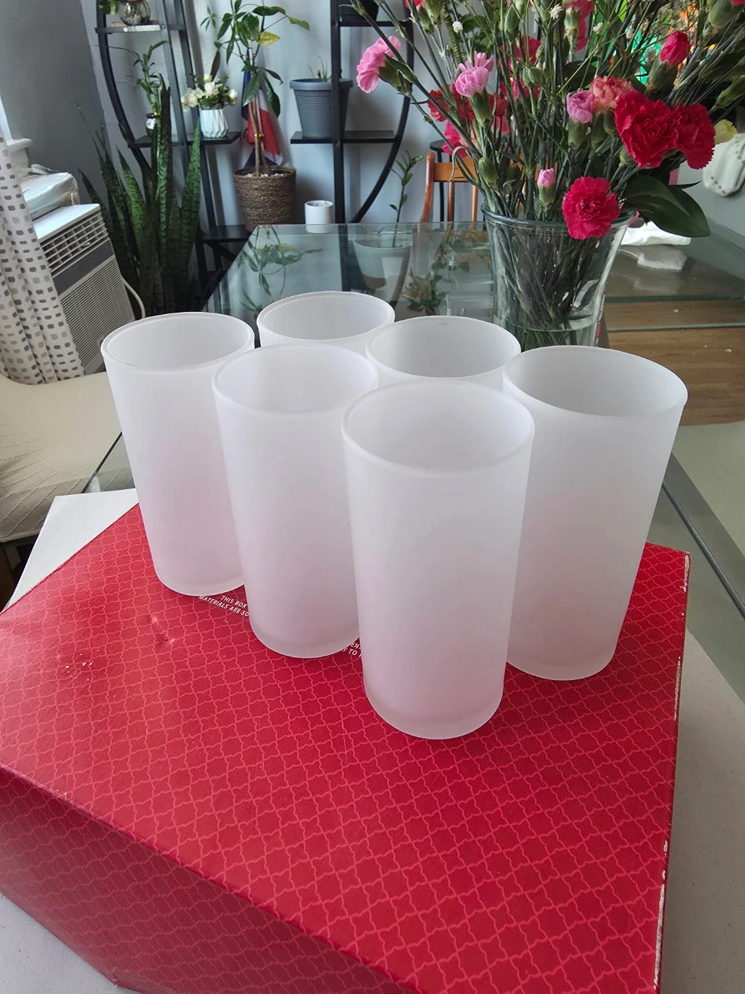 This is a set of six frosted white tumbler glasses. They're made of glass and have a matte finish. Includes the original box, which is red with a decorative pattern.