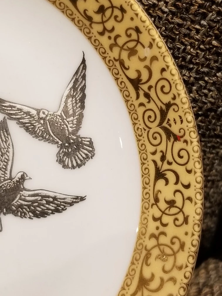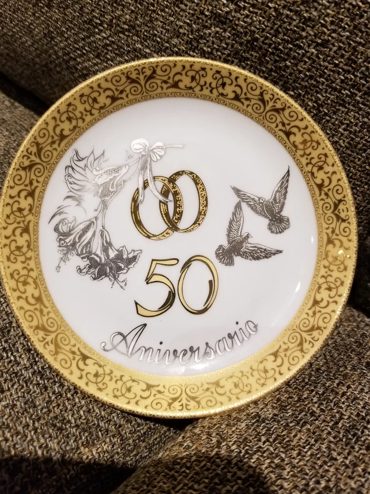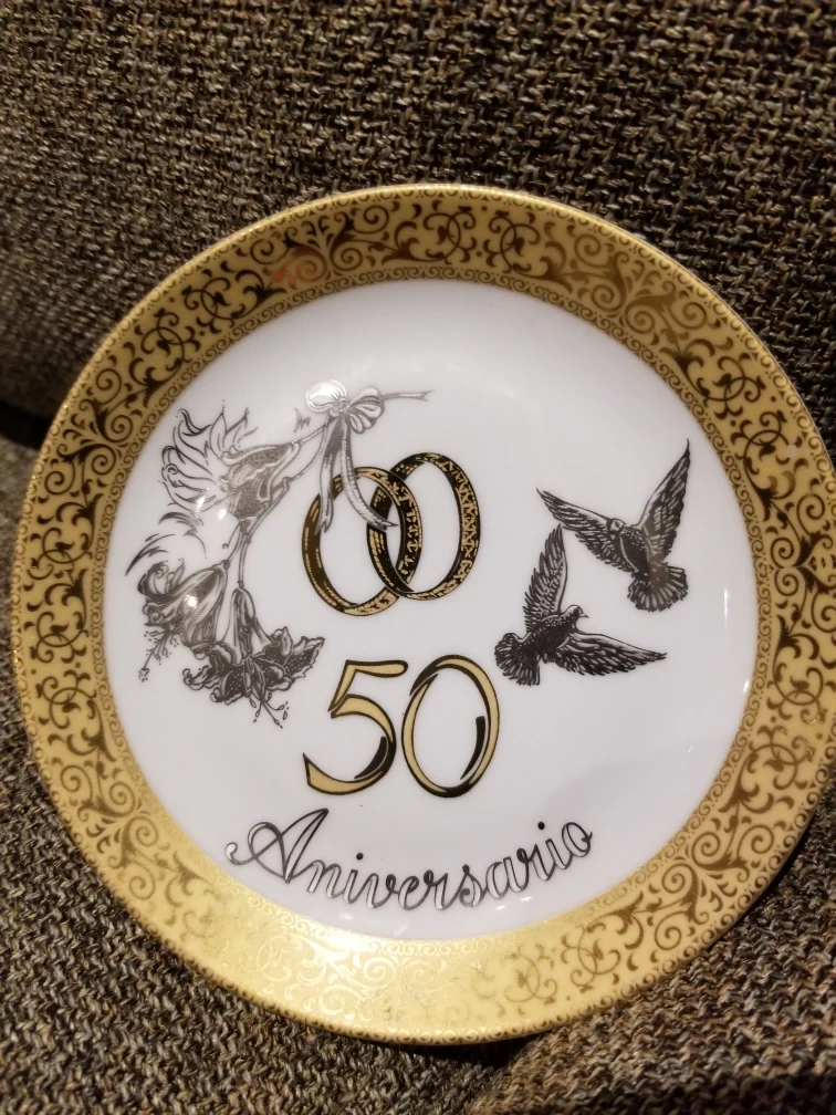 Selling a beautiful Limoges France decorative plate. It features a lovely "50 Aniversario" design with gold accents and doves. The plate is in great condition and would be a wonderful addition to any collection!