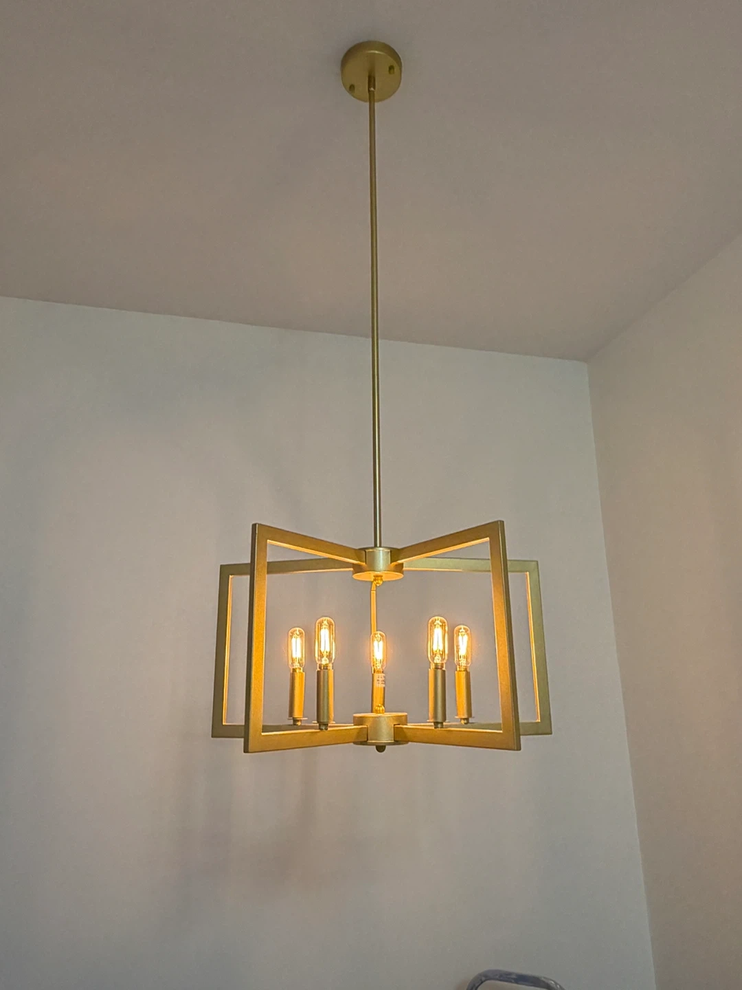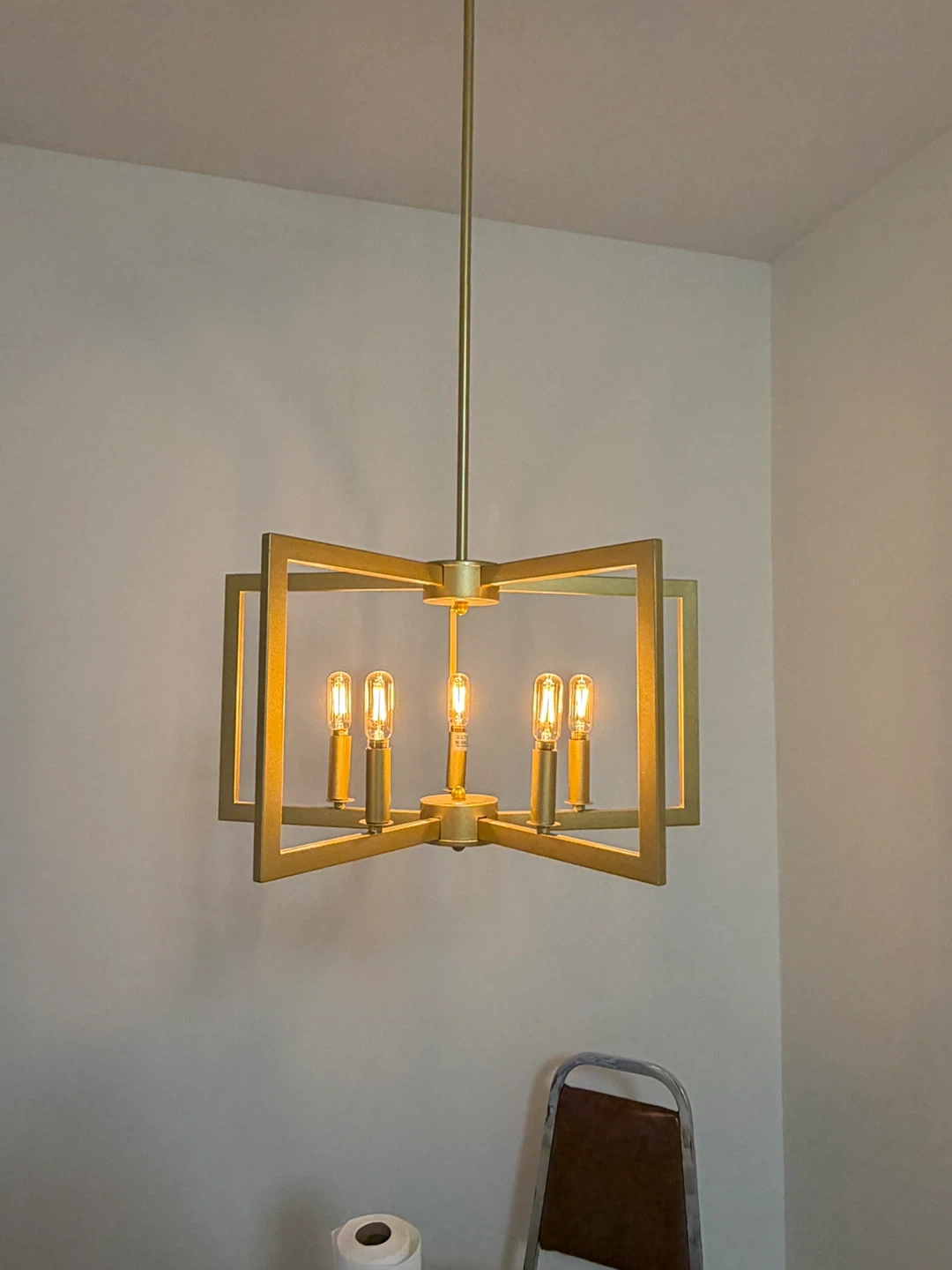 Selling a beautiful gold chandelier! It's in great condition and would add a touch of elegance to any room. The fixture has a modern design with a geometric frame and five lights. It's perfect for a dining room, living room, or entryway. Let me know if you're interested