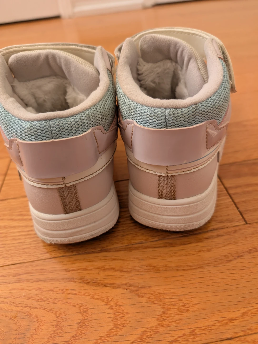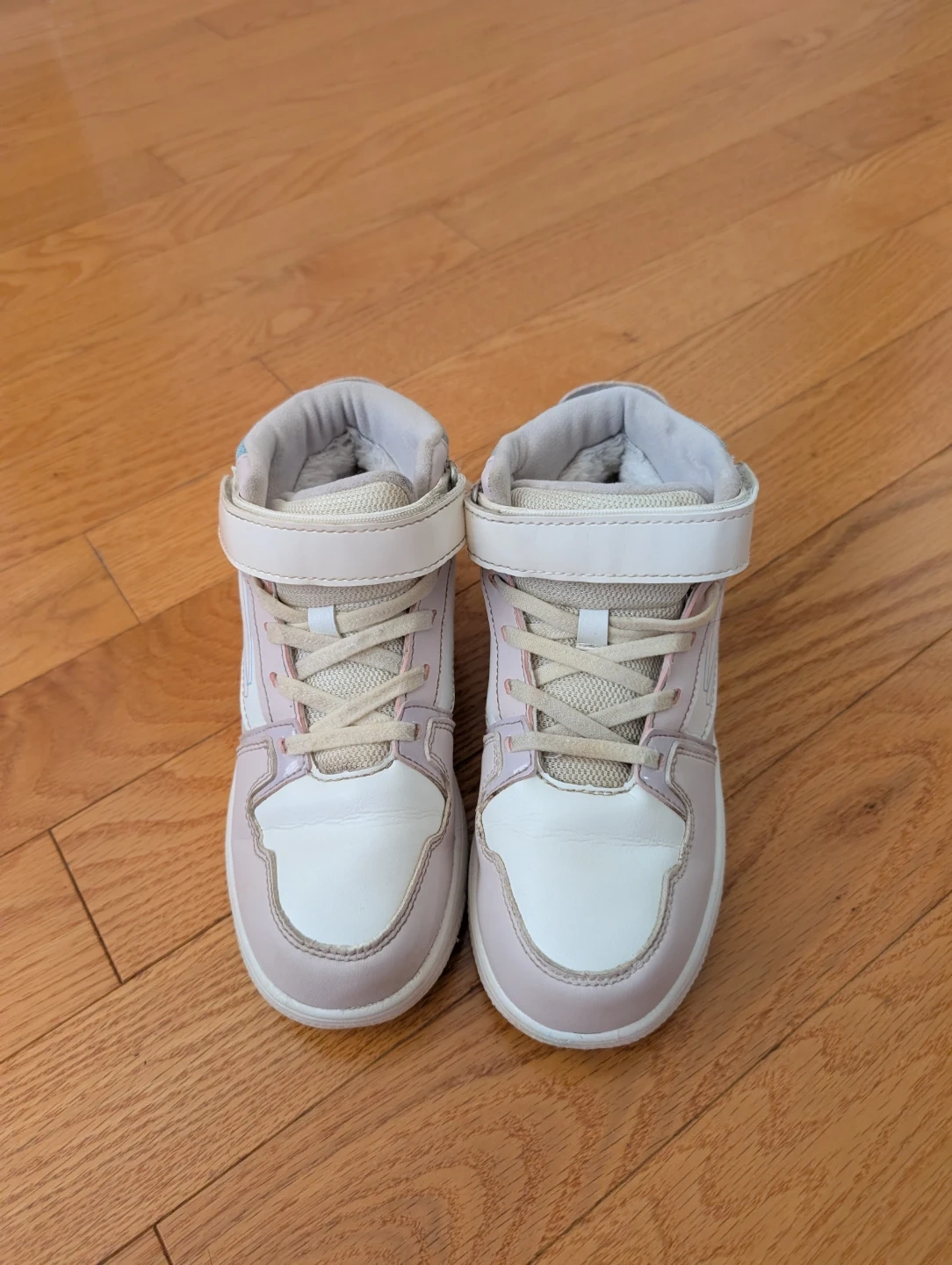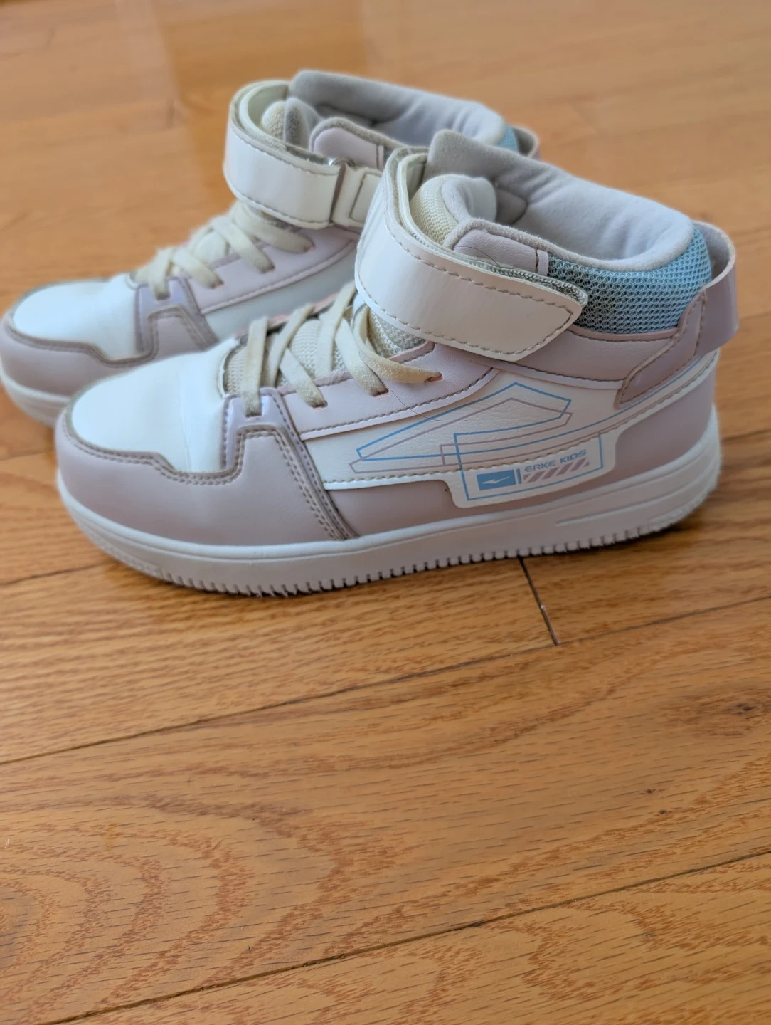 These kids' high-top sneakers are white and light pink with blue accents. They have a Velcro strap and laces for a secure fit. The interior is lined with soft material for comfort.