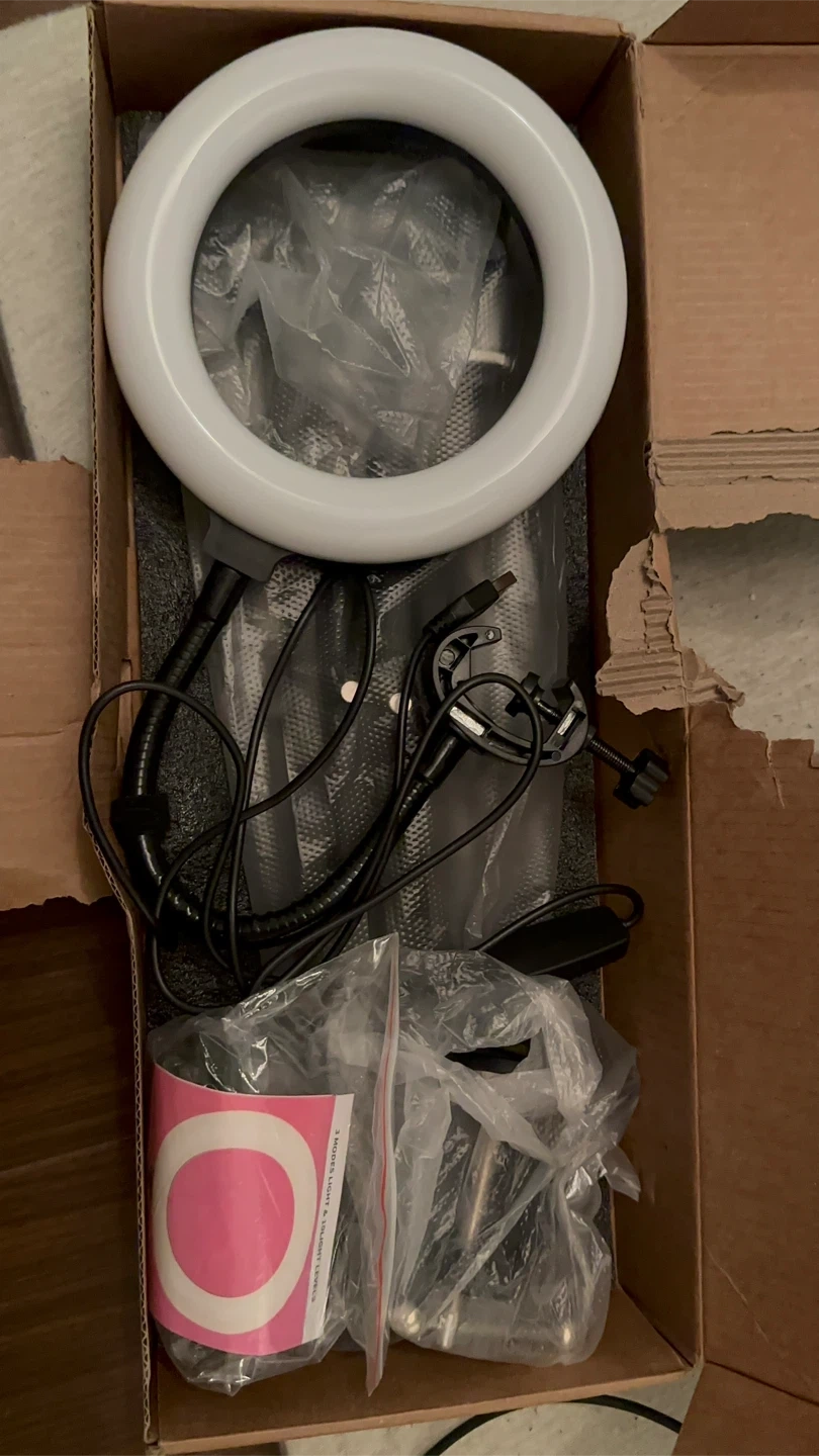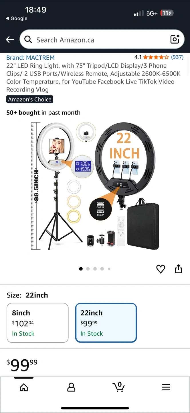 MACTREM 22-inch LED Ring Light. Comes with a 75" tripod and remote. Perfect for live streaming and video recording. Includes adjustable phone clips and ports.