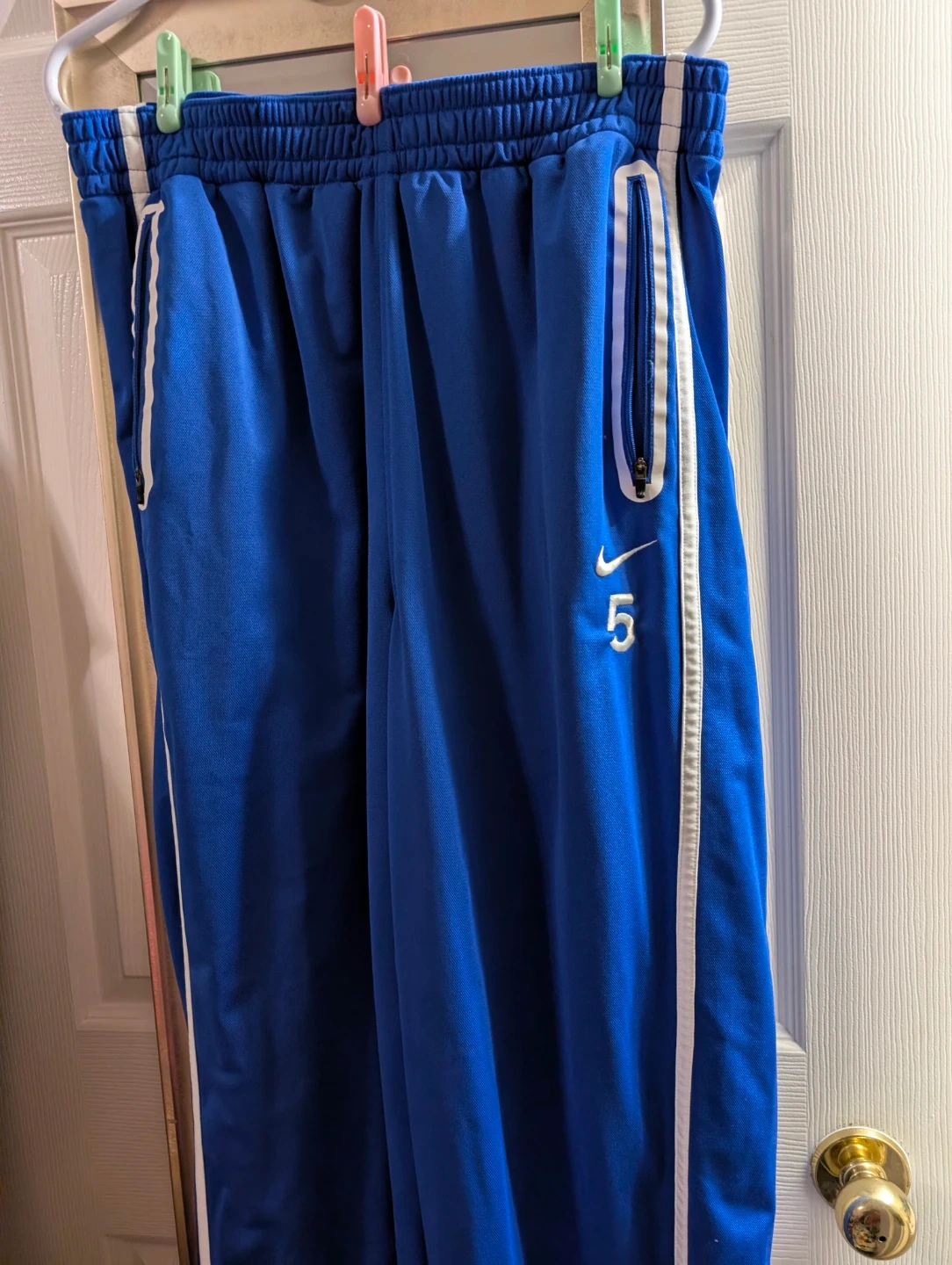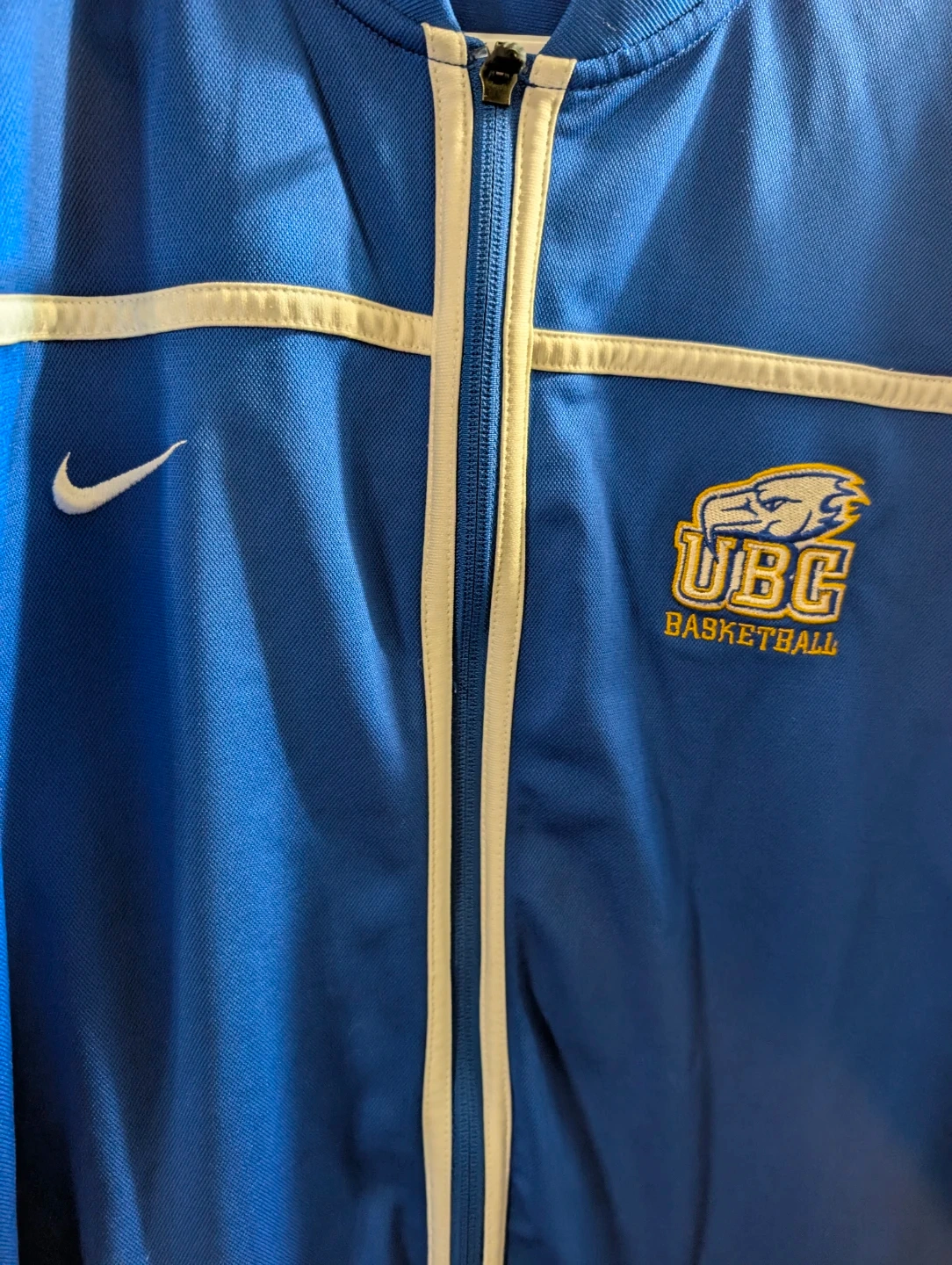 Blue Nike Dri-FIT XXL track jacket and matching pants. Features UBC Basketball logo on jacket and Nike swoosh. Pants have a number 5 graphic. Made in Indonesia.
