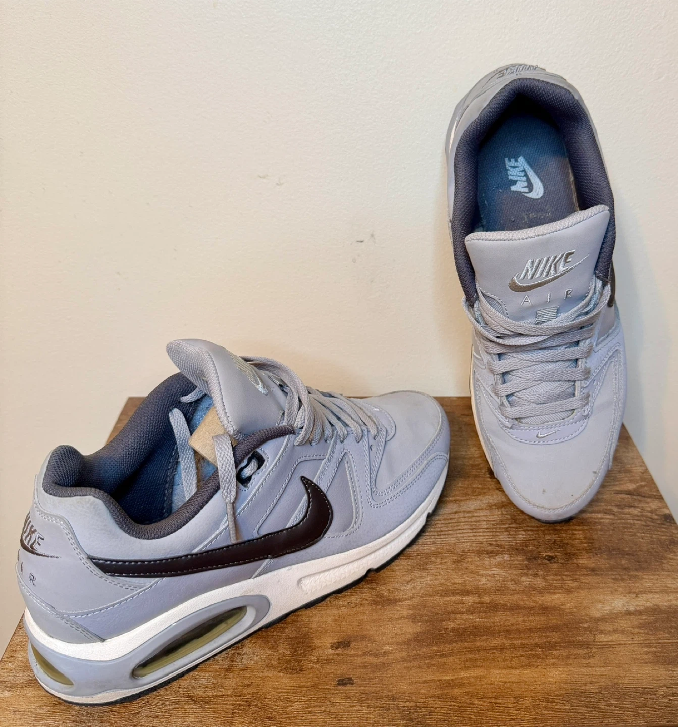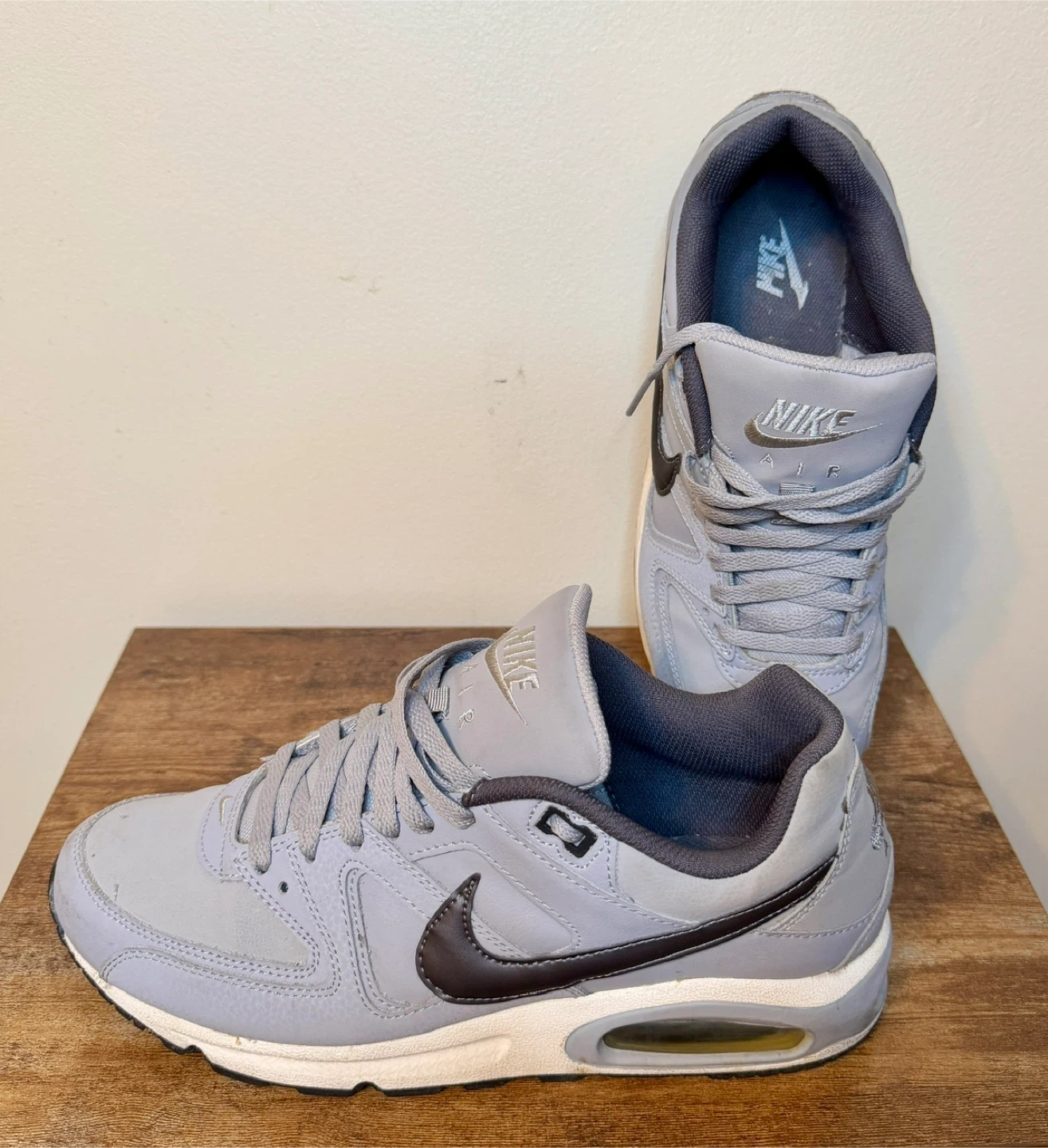 These Nike Air Max sneakers are a light gray color with a dark gray swoosh. They feature Nike Air cushioning in the sole. Comes with laces.