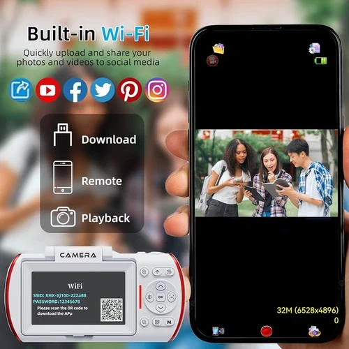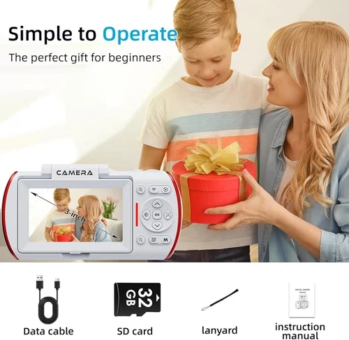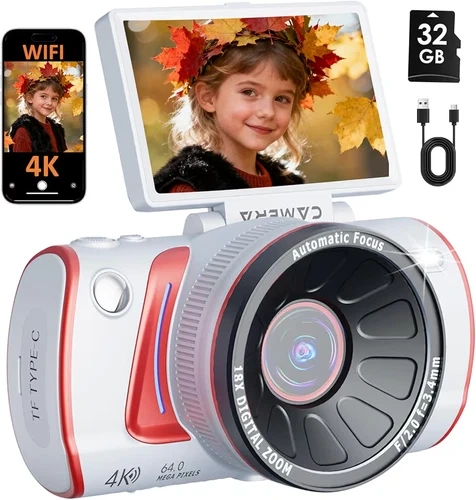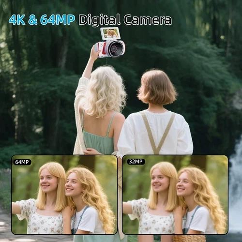 Equipped with 4K ultra-high-definition video and 64-megapixel high resolution, it features a 3-inch 180° flip screen for easier selfies. Intelligent autofocus accurately locks onto the subject for clear and sharp detail capture. Supports live streaming/online classes (USB connection to computer), Vlog shooting, and creative features like time-lapse photography, continuous shooting, and filters. Built-in fill light and anti-shake provide stable imaging even in low-light environments. This mini digital camera features built-in WiFi, allowing you to instantly transfer photos and videos and share them directly. Compact, lightweight, and easy to use, it’s ideal for beginners. 18x digital zoom brings distant scenes closer. Includes a 32GB memory card, Type-C cable, storage bag, and instruction manual. Easy to operate, it makes a great gift!