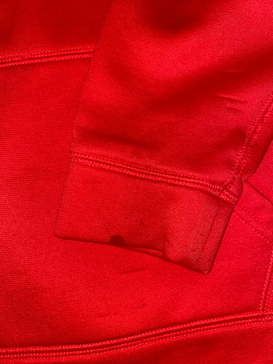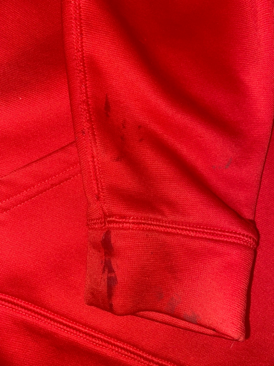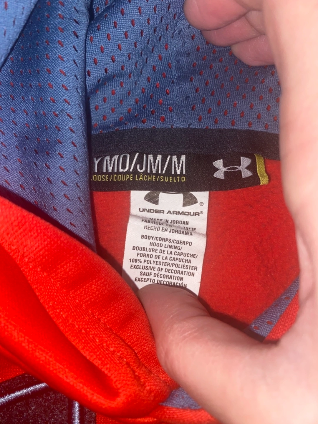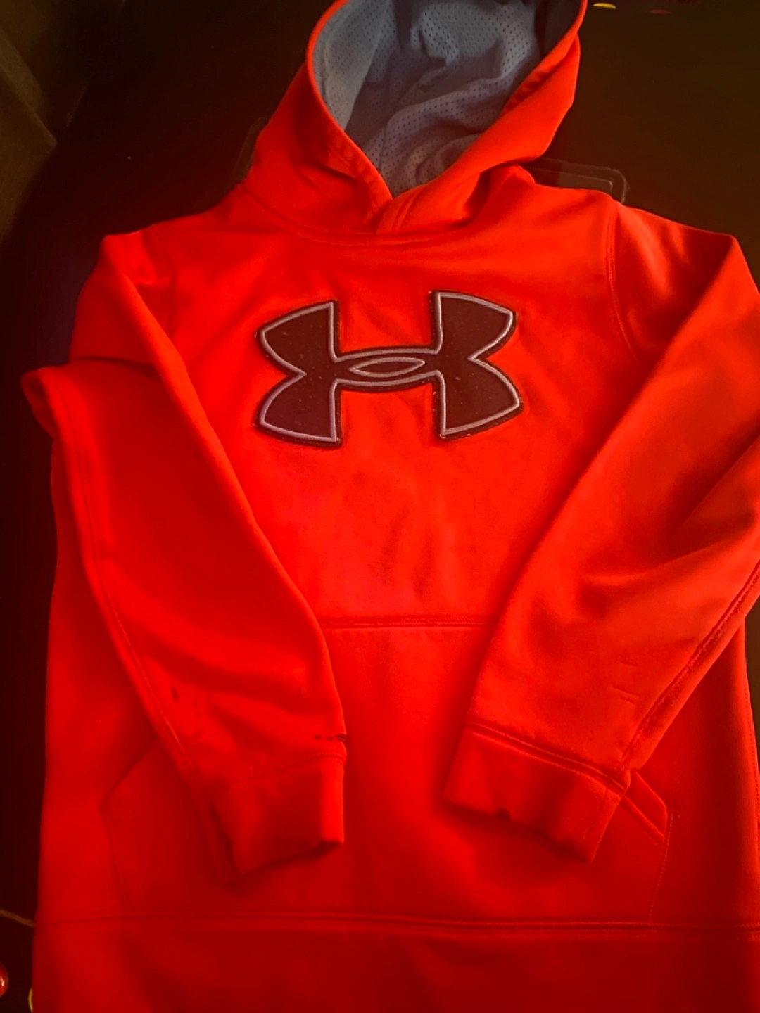 Youth size medium red Under Armour hoodie. Features a large Under Armour logo on the front. Some minor stains present. Good for casual wear or athletic activities.