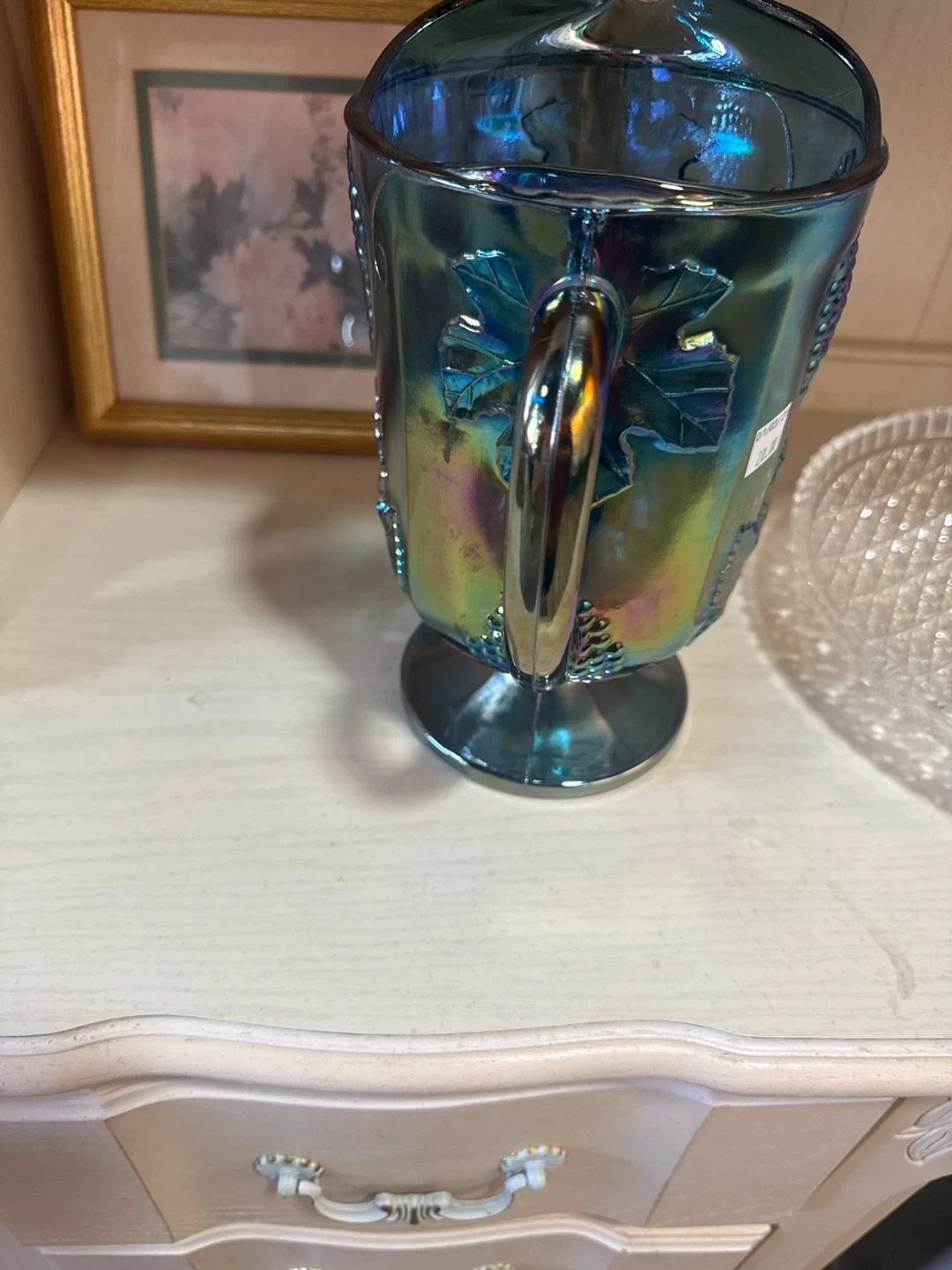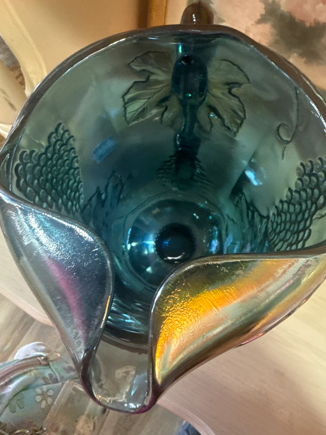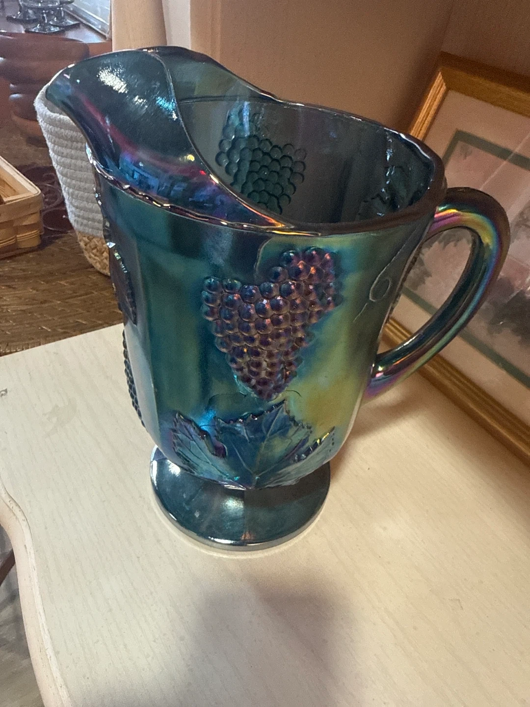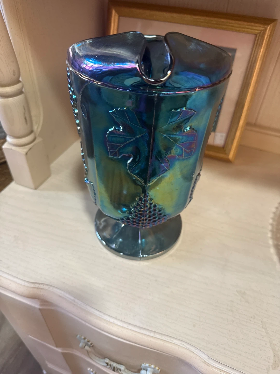 This iridescent carnival glass pitcher features a detailed grape leaf and bunch design. Its unique blue-green hue catches the light beautifully. Made of glass.