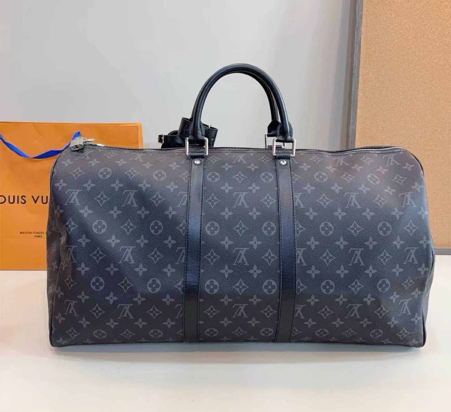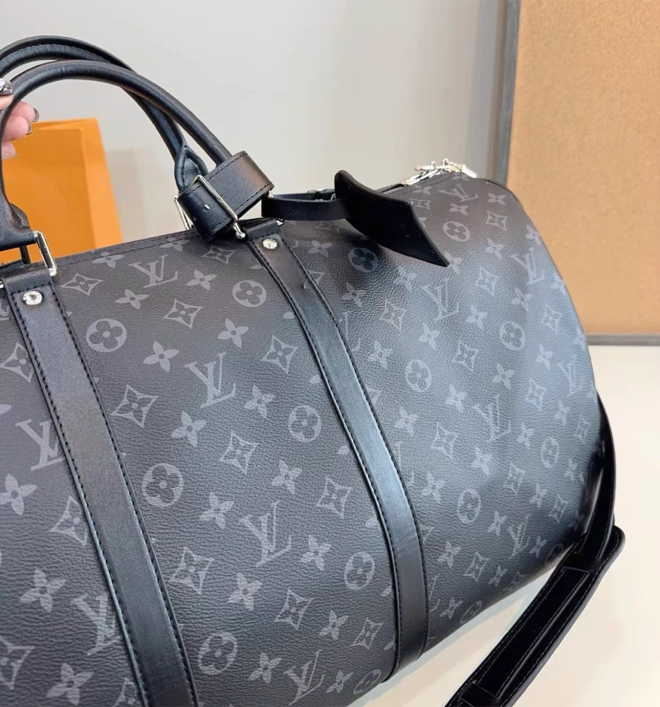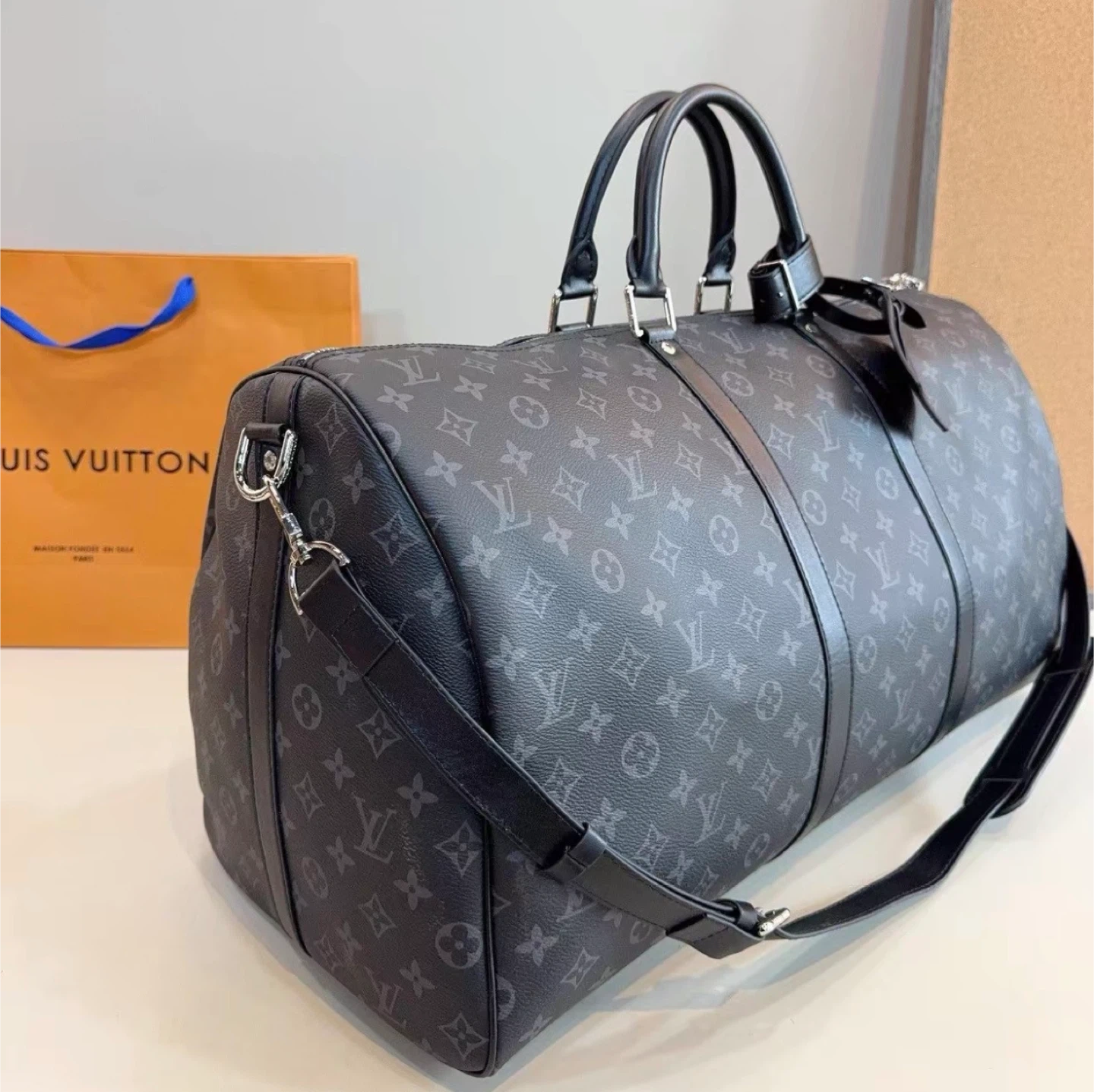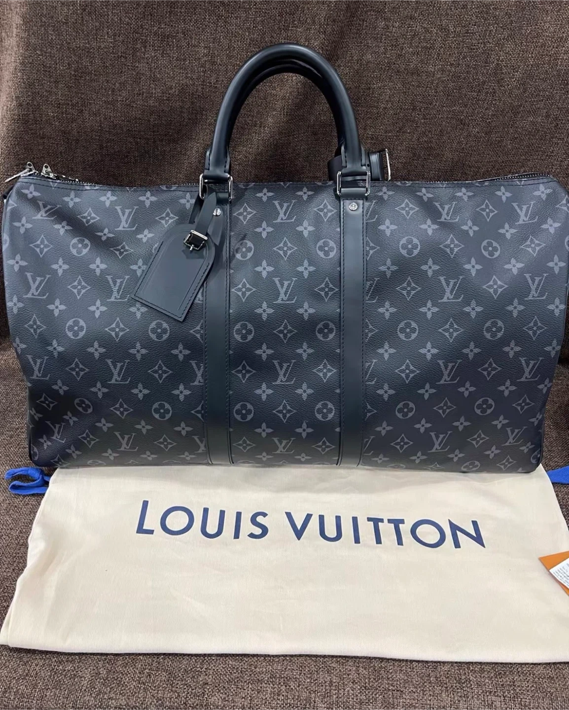 Louis Vuitton Keepall duffle bag in Monogram Eclipse canvas. It's a stylish and practical bag for travel. Features include leather handles and a shoulder strap.