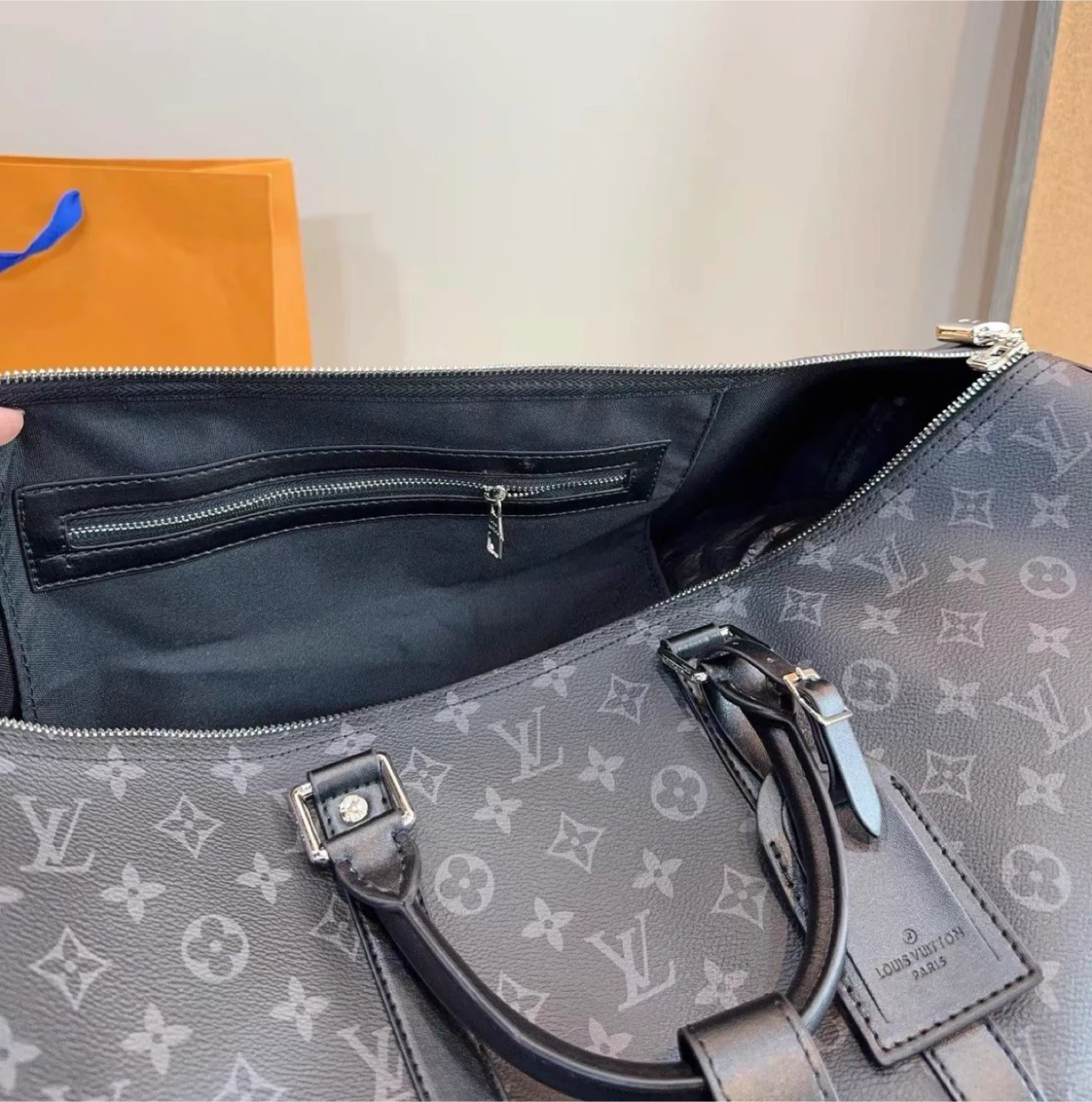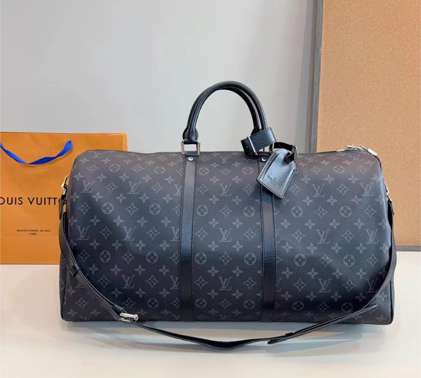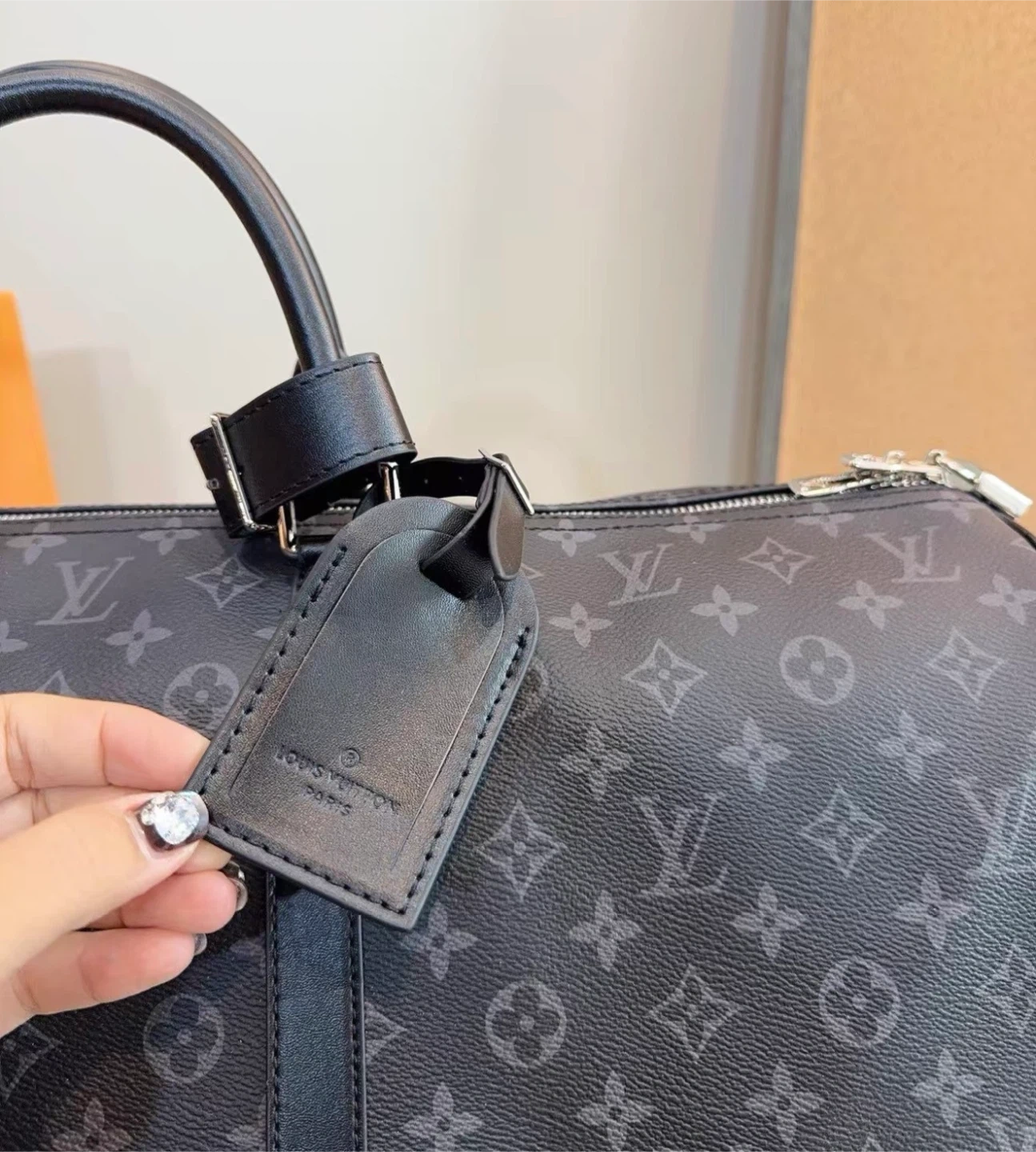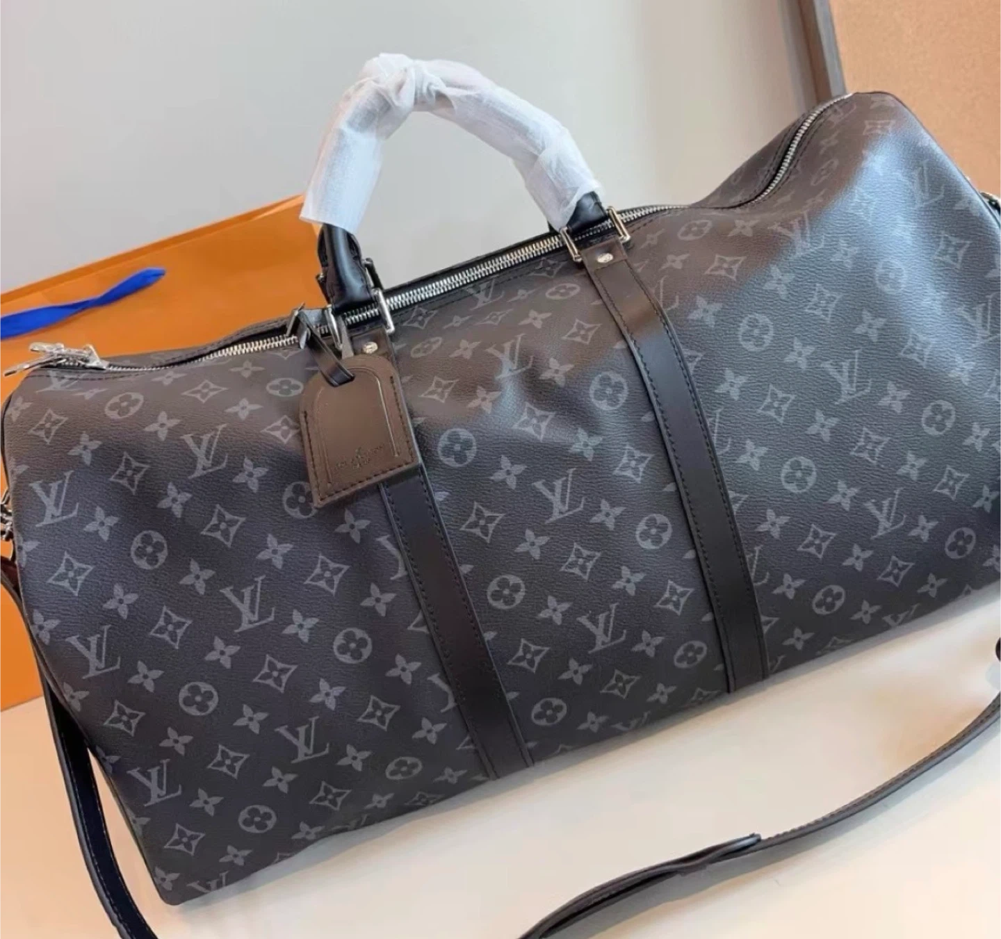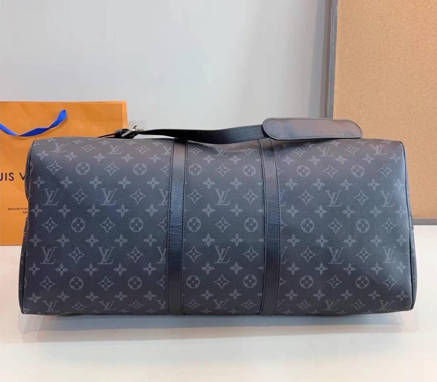 Louis Vuitton Keepall duffle bag in Monogram Eclipse canvas. It's a stylish and practical bag for travel. Features include leather handles and a shoulder strap.
