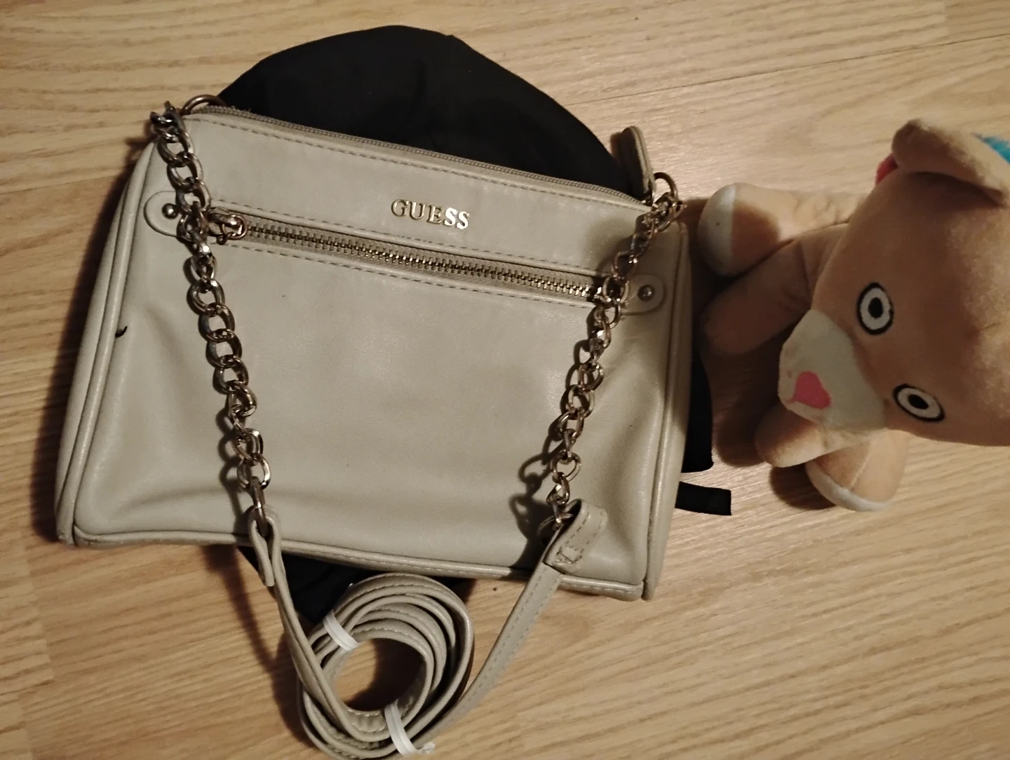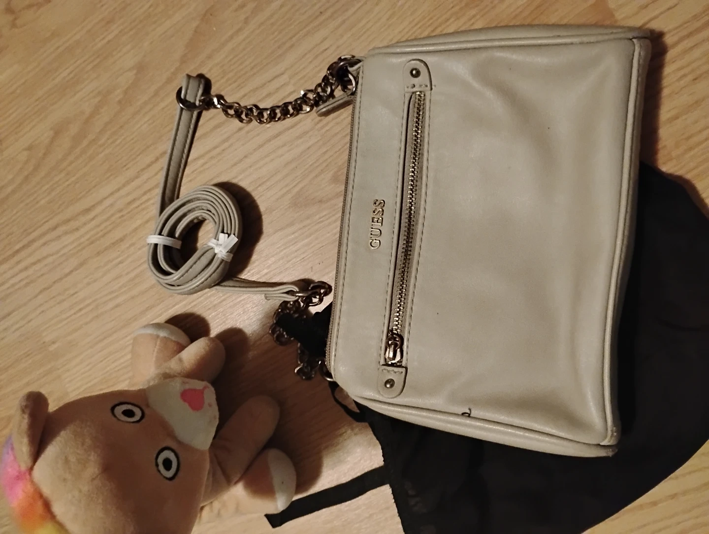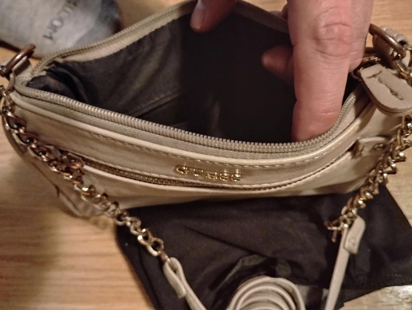 This is a beige Guess crossbody bag with a chain strap. It has a zippered main compartment and an exterior zippered pocket. Includes a dust bag.