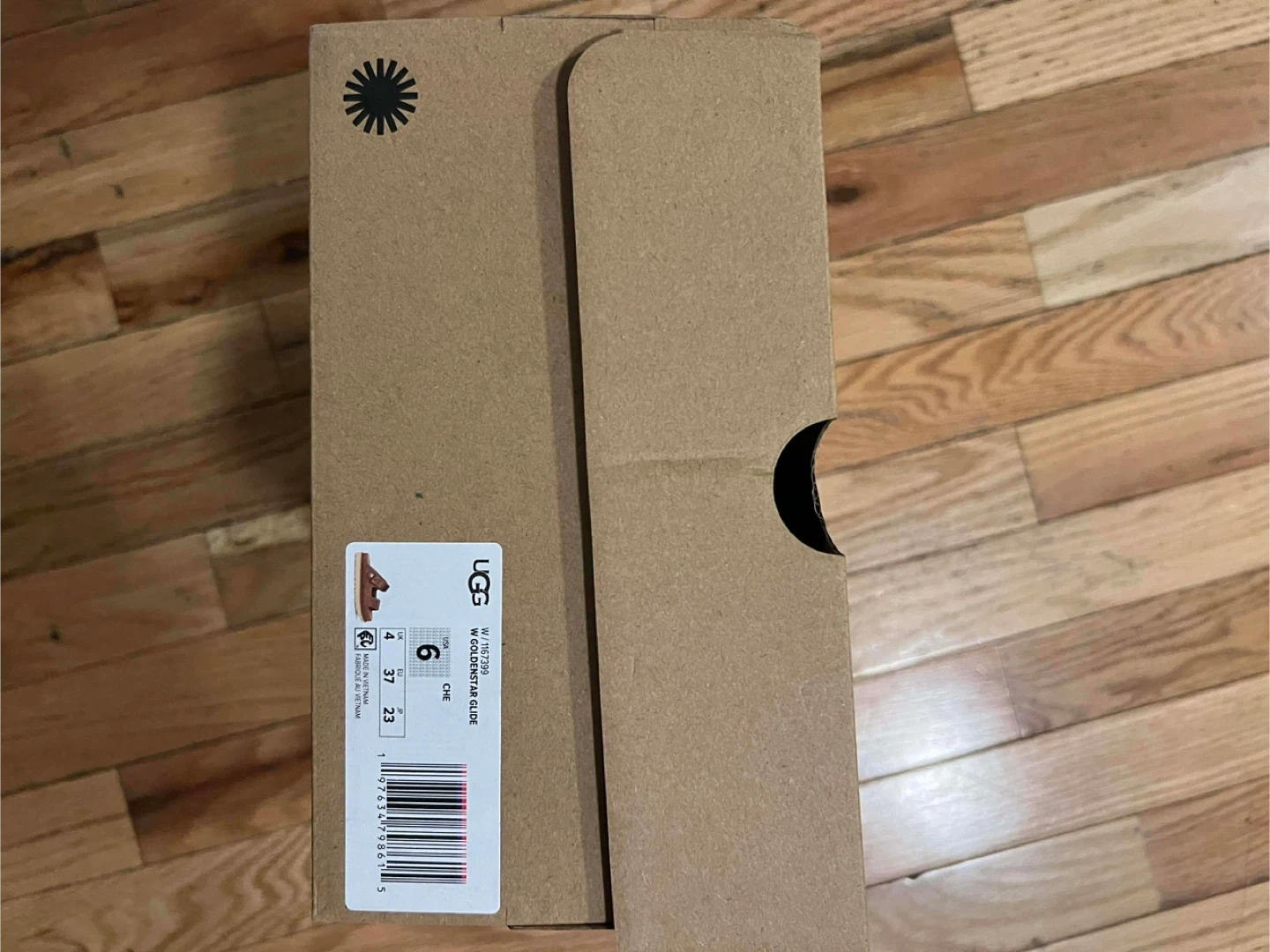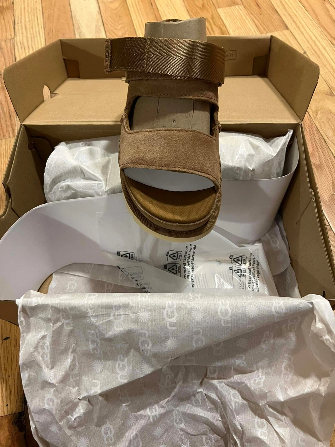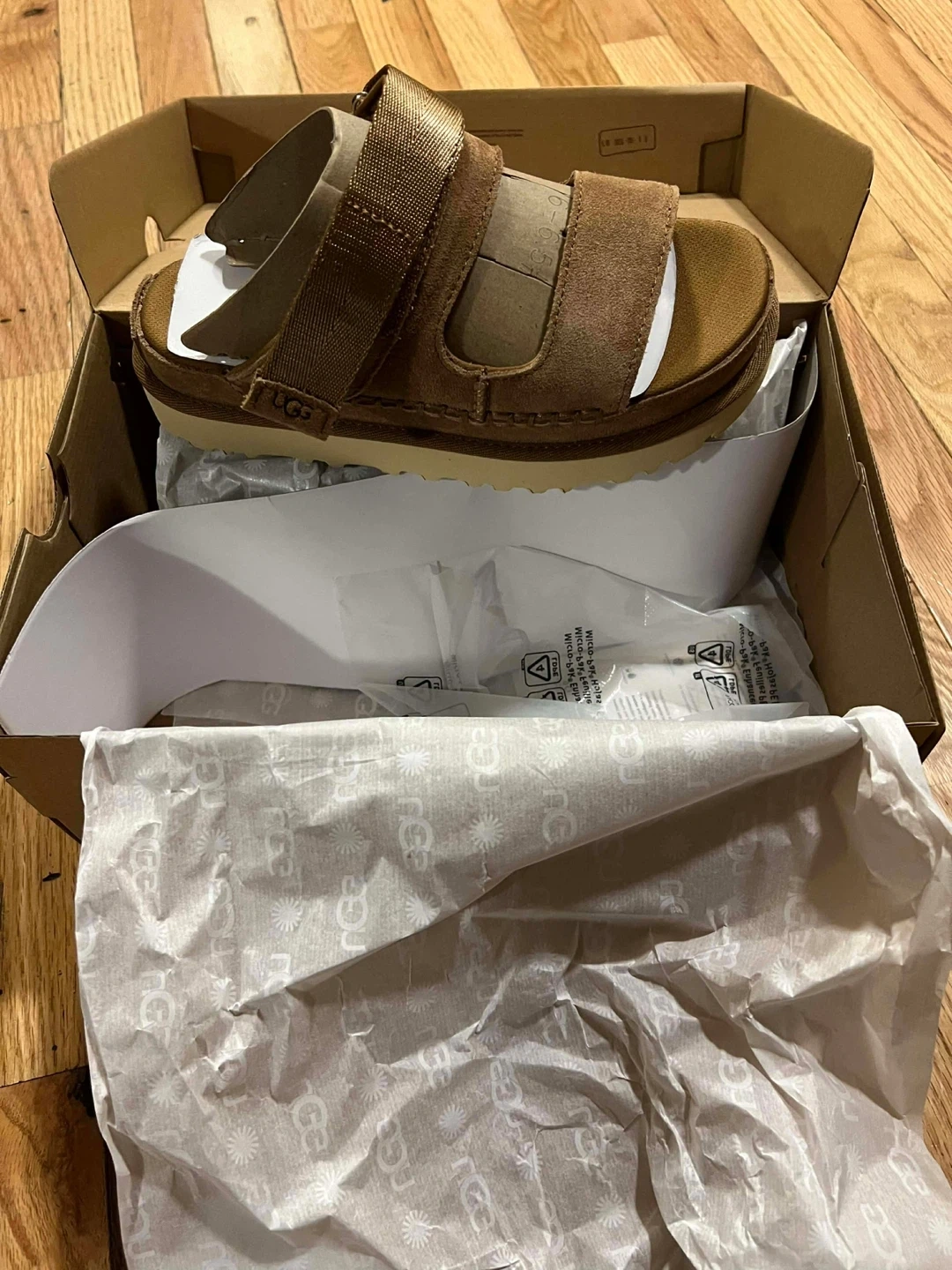 UGG Goldenstar Slide sandals in a rich brown color. These sandals feature adjustable straps and a comfortable platform sole. Includes original box and packaging.