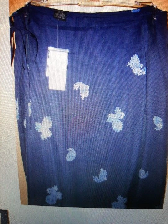 NEW WITH TAG, LONG WRAP SKIRT - DARK SLATE BLUE & NAVY WITH LIGHT BLUE FLORALS. BUTTONS INSIDE & TIES ON WAIST-SIDE. Rayon/Polyester/Cotton. Fits petite, regular, misses 4-6, 6-8 and 8-10.