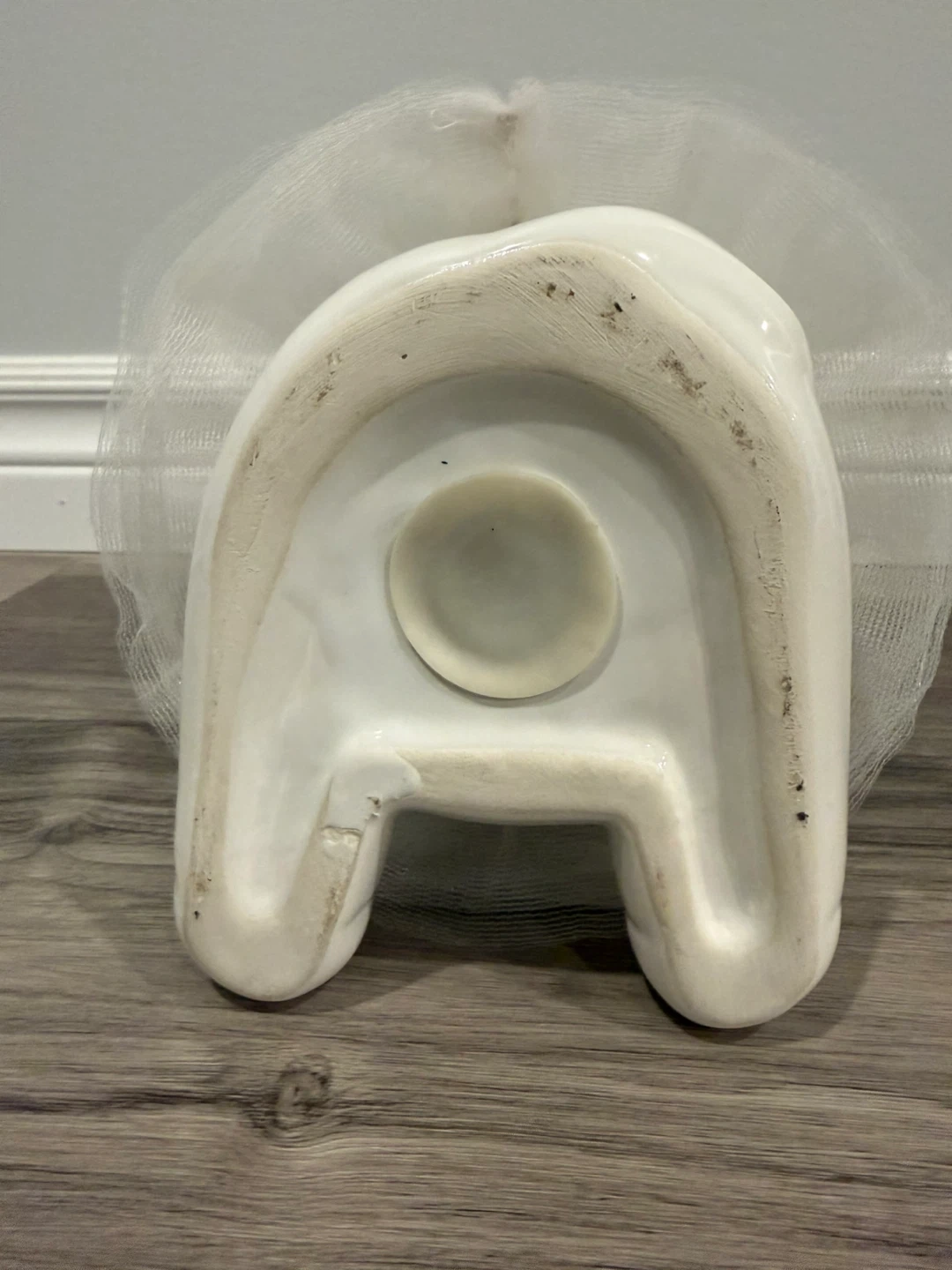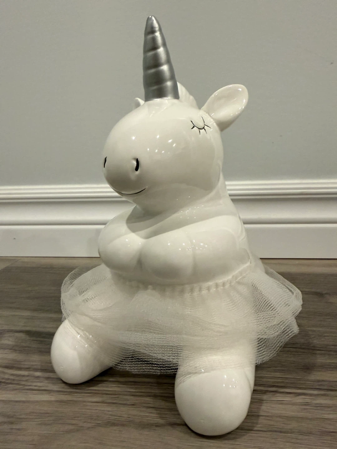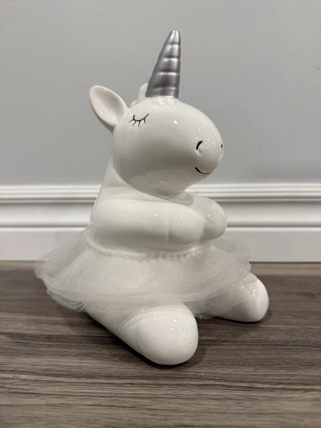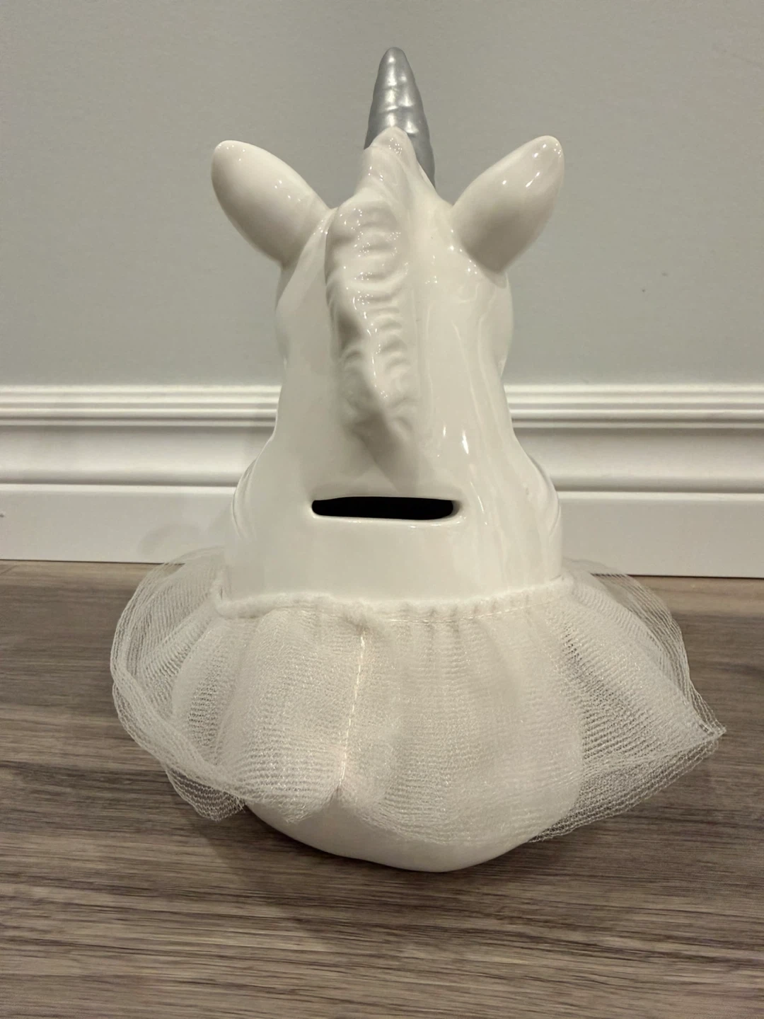 This is a cute white ceramic piggy bank shaped like a unicorn in a ballerina tutu. It has a slot for coins on the back and a stopper on the bottom. It's a fun way to save money!