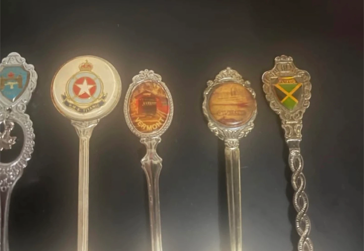 This is a collection of 10 souvenir spoons from various locations including Vermont, Jamaica, Mexico, and the Dominican Republic. Each spoon features a unique design or emblem on its handle and bowl. They're made of metal and are decorative pieces.