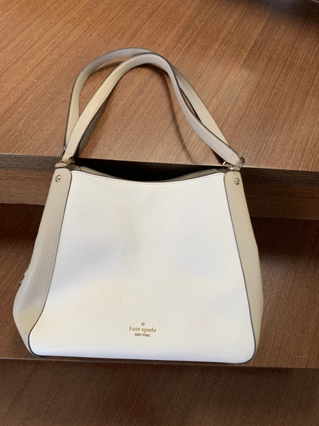 Selling a Kate Spade tote bag in ivory and beige. It's in great condition and ready for a new home! The bag has a spacious interior, perfect for everyday use.