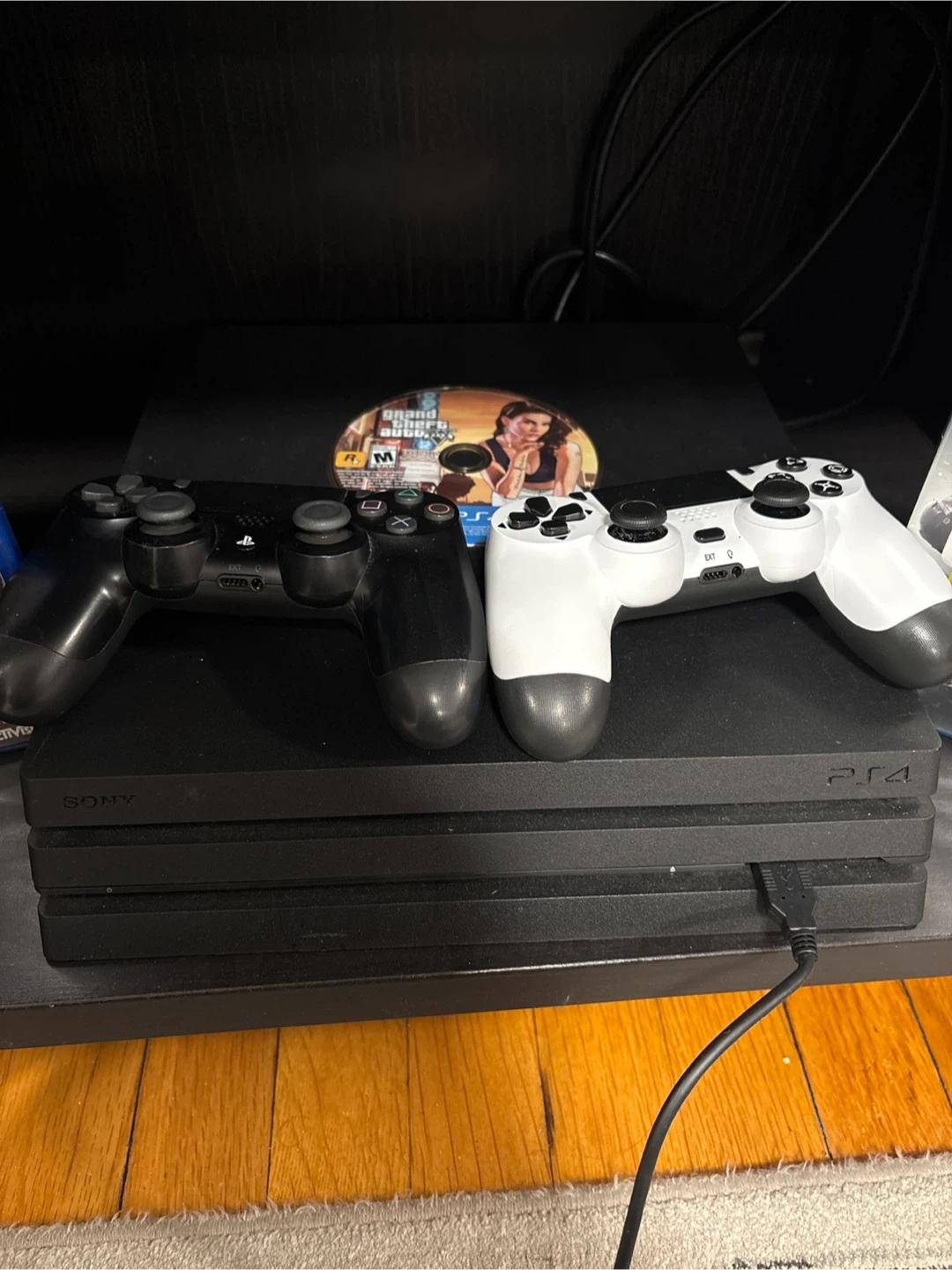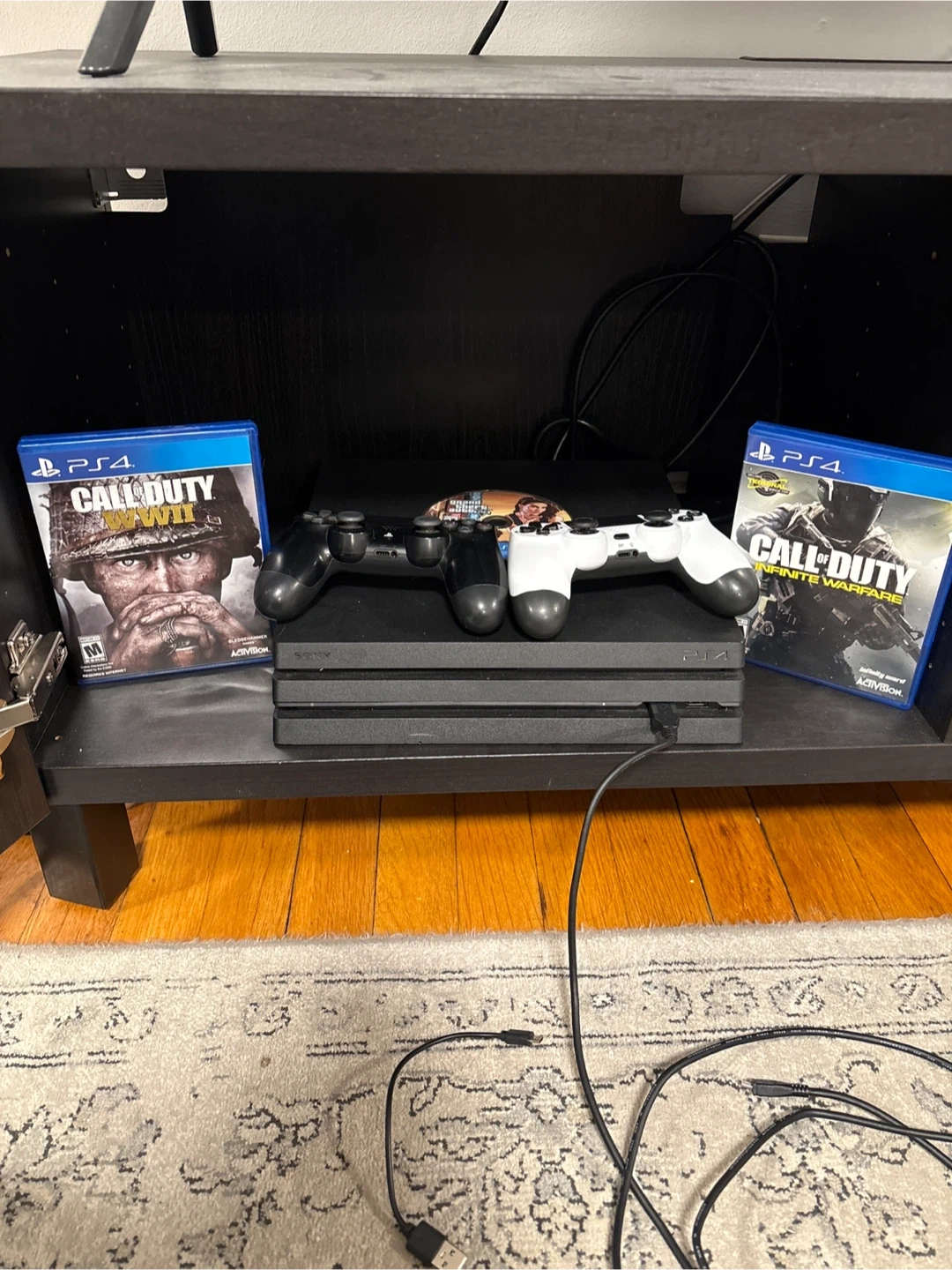This is a Sony PlayStation 4 Pro console. It comes with two controllers, one black and one white. The console includes Grand Theft Auto V, Call of Duty: WWII, and Call of Duty: Infinite Warfare. This bundle's perfect for gaming enthusiasts!